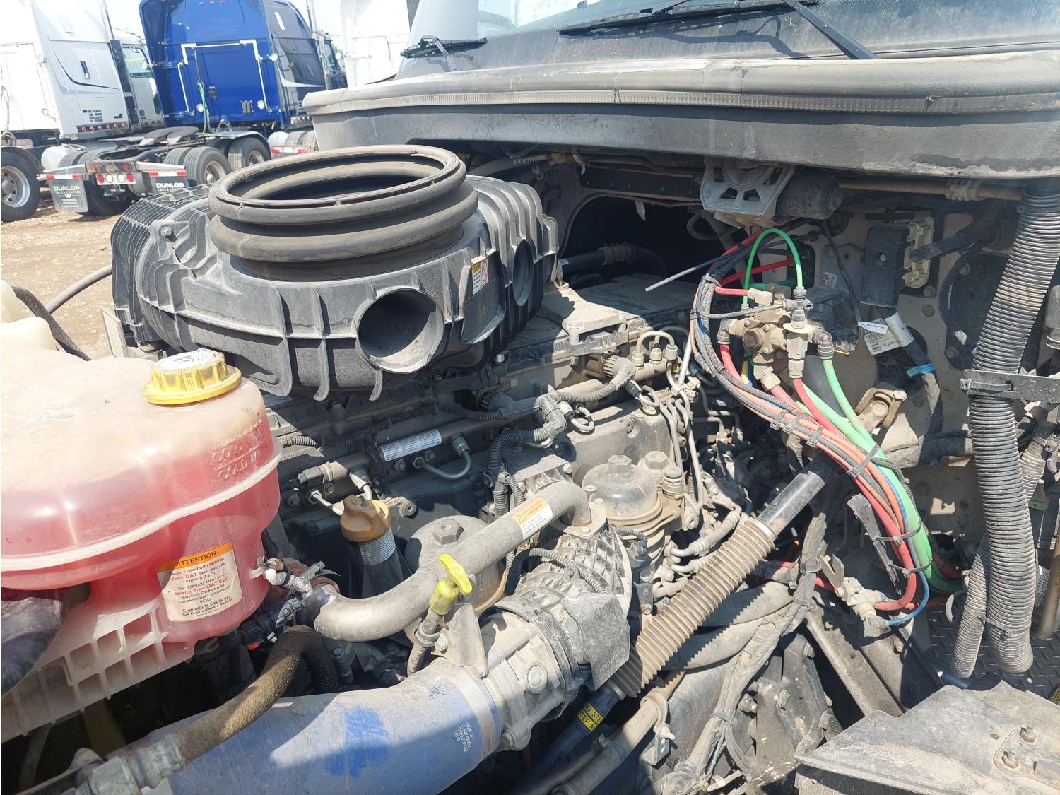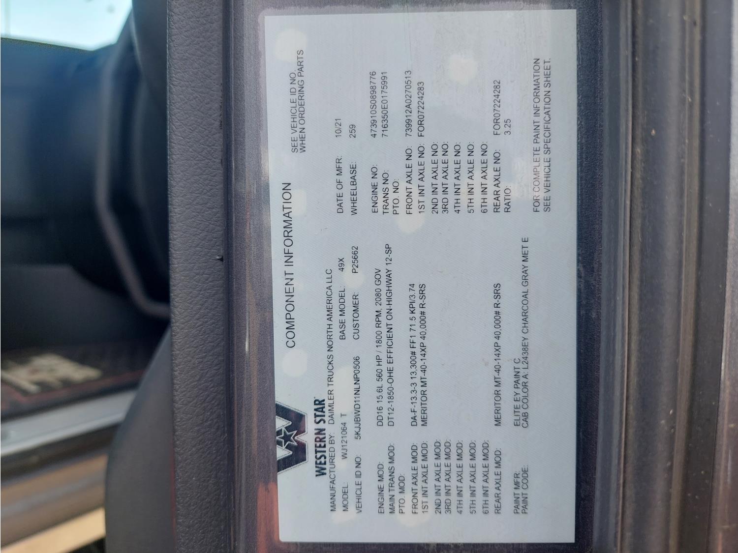 Detroit DD16 15.6 L 6 cylinder 560 HP engine, DEF required, engine heater, engine brake, engine block heater, DT12 12 speed automatic transmission, mid rise 72 inch sleeper, fridge, A/C, cruise control, leather interior, air ride seats, CB radio, air ride cab, power inverter, Air Liner air ride suspension, 13,220 lb front axle, 40,000 lb rear axles, 3 way diff locks, 3.25 ratio, 259 inch WB, single frame, all aluminum wheels, 11R22.5 tires