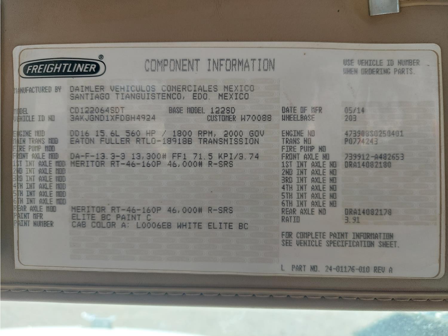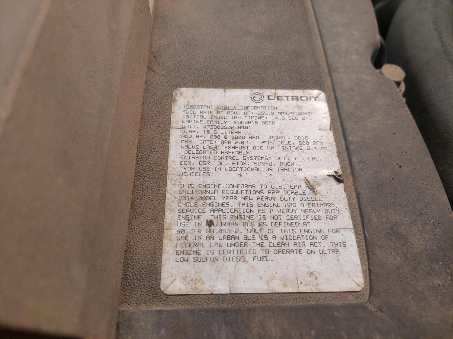 Detroit DD16 15.6 L 6 cylinder 560 HP engine, DEF deleted, engine heater, engine brake, engine block heater, emissions deleted, Freightliner 18 speed manual transmission, A/C, cruise control, leather interior, air ride driver seat, 2-way radio, air ride cab, Air Liner air ride suspension, 13,300 lb front axle, 46,000 lb rear axles, full lockers, 3.91 ratio, 203 inch WB, single frame, 11R24.5 tires