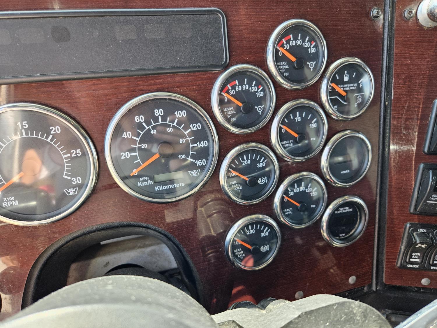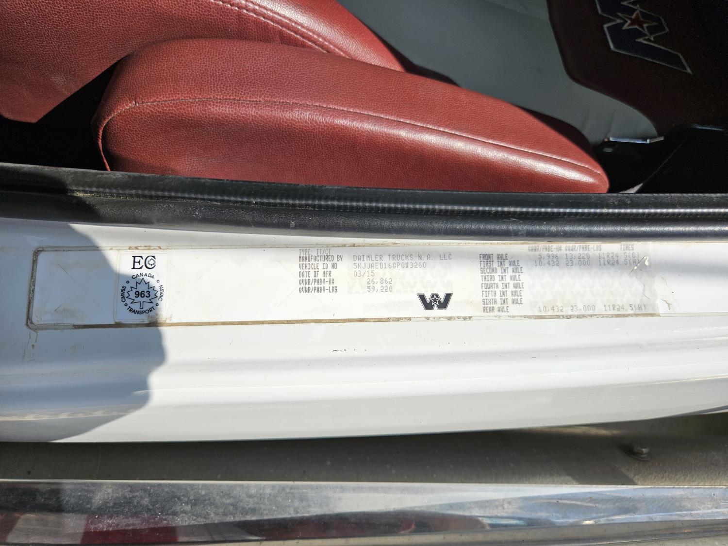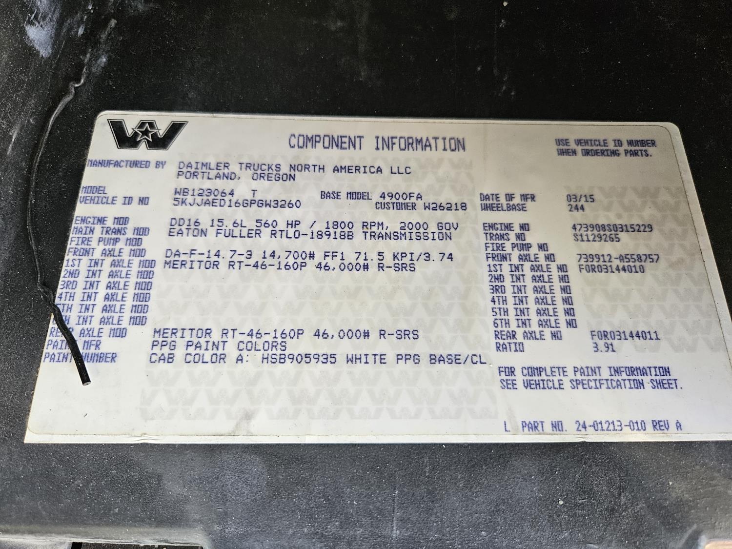 Detroit DD16 15.6 L 6 cylinder 560 HP engine, DEF deleted, Webasto engine heater, engine brake, engine block heater, emissions deleted, Eaton Fuller 18 speed manual transmission, cab heater, mid rise 48 inch sleeper, A/C, cruise control, leather interior, air ride seats, 2-way radio, air ride cab, air ride suspension, 13,200 lb front axle, 46,000 lb rear axles, full lockers, 3.91 ratio, 244 inch WB, single frame, all aluminum wheels, 11R24.5 tires