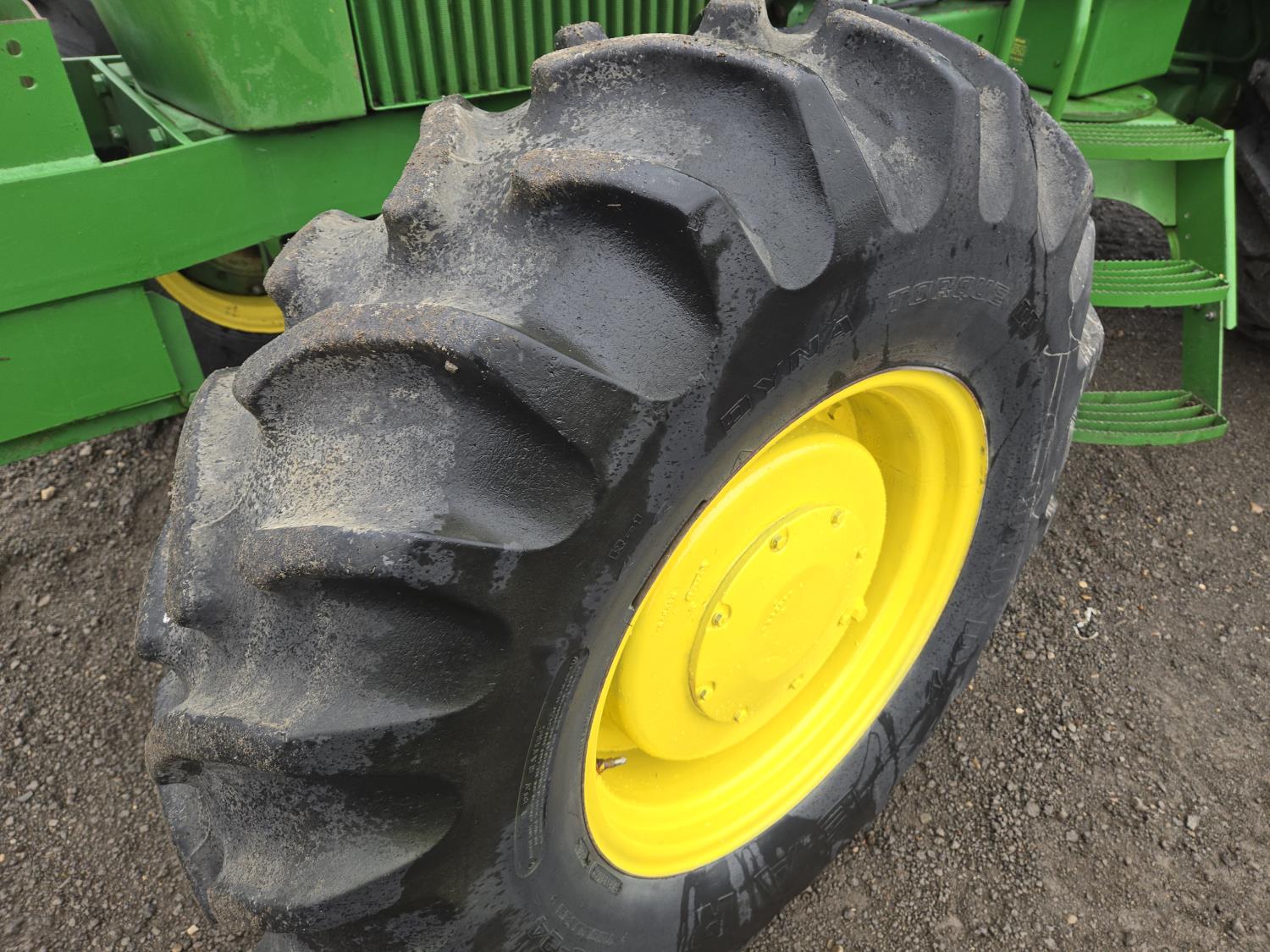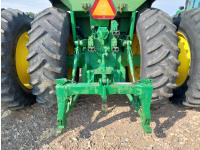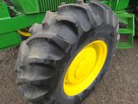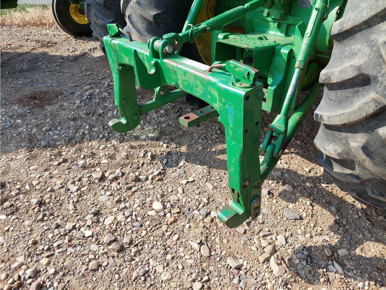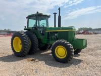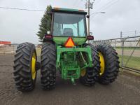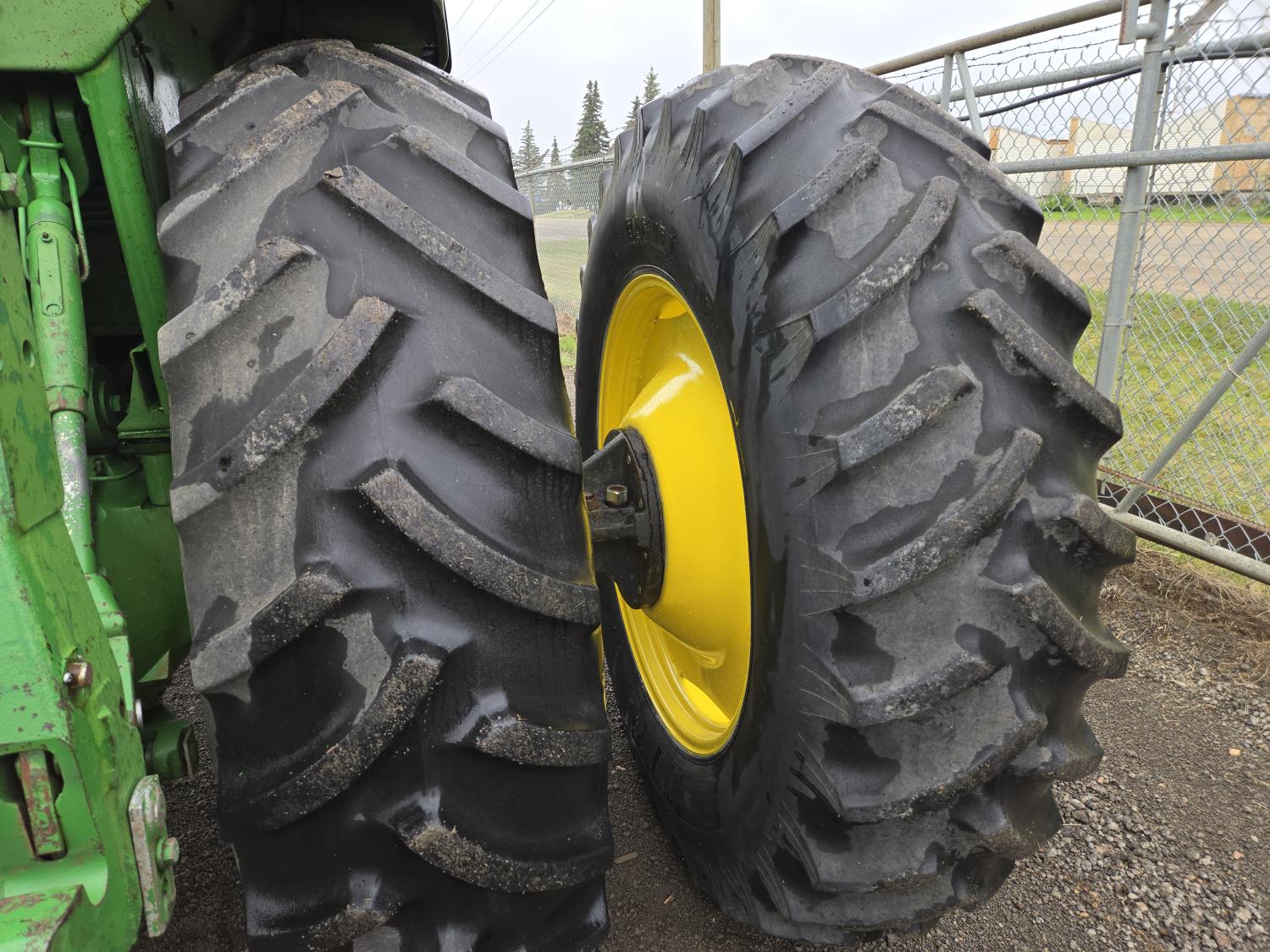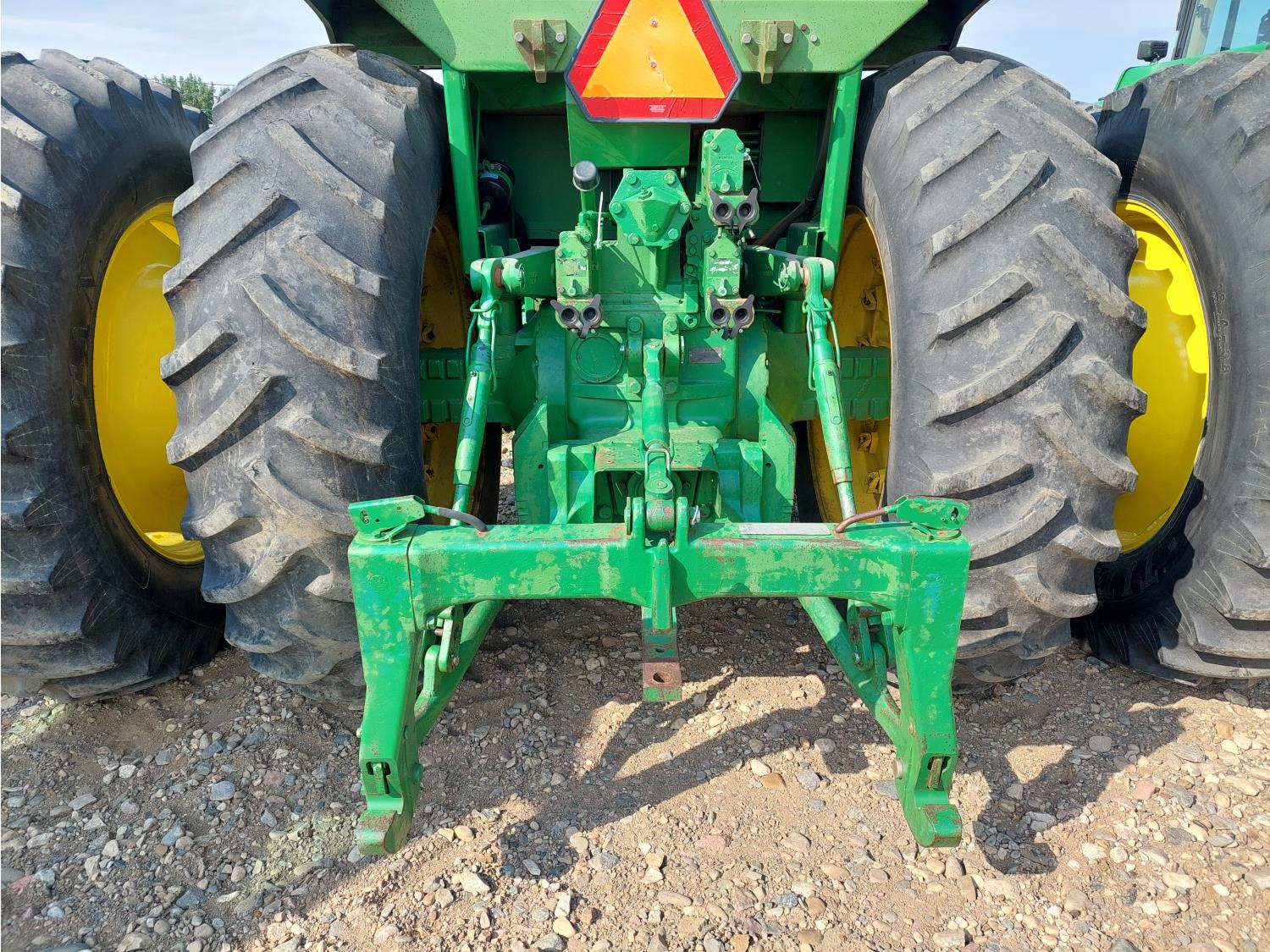 John Deere 6.6 L 6 cylinder engine, 150 PTO HP, 8 speed power shift transmission, hydraulic assist front wheel drive, cab, A/C, radio, 1000 PTO, Q/A 3 point hitch, 3 rear hydraulic outlets, 14.69-24 front tires, 18.4-38 rear tires, factory duals, front weight box