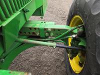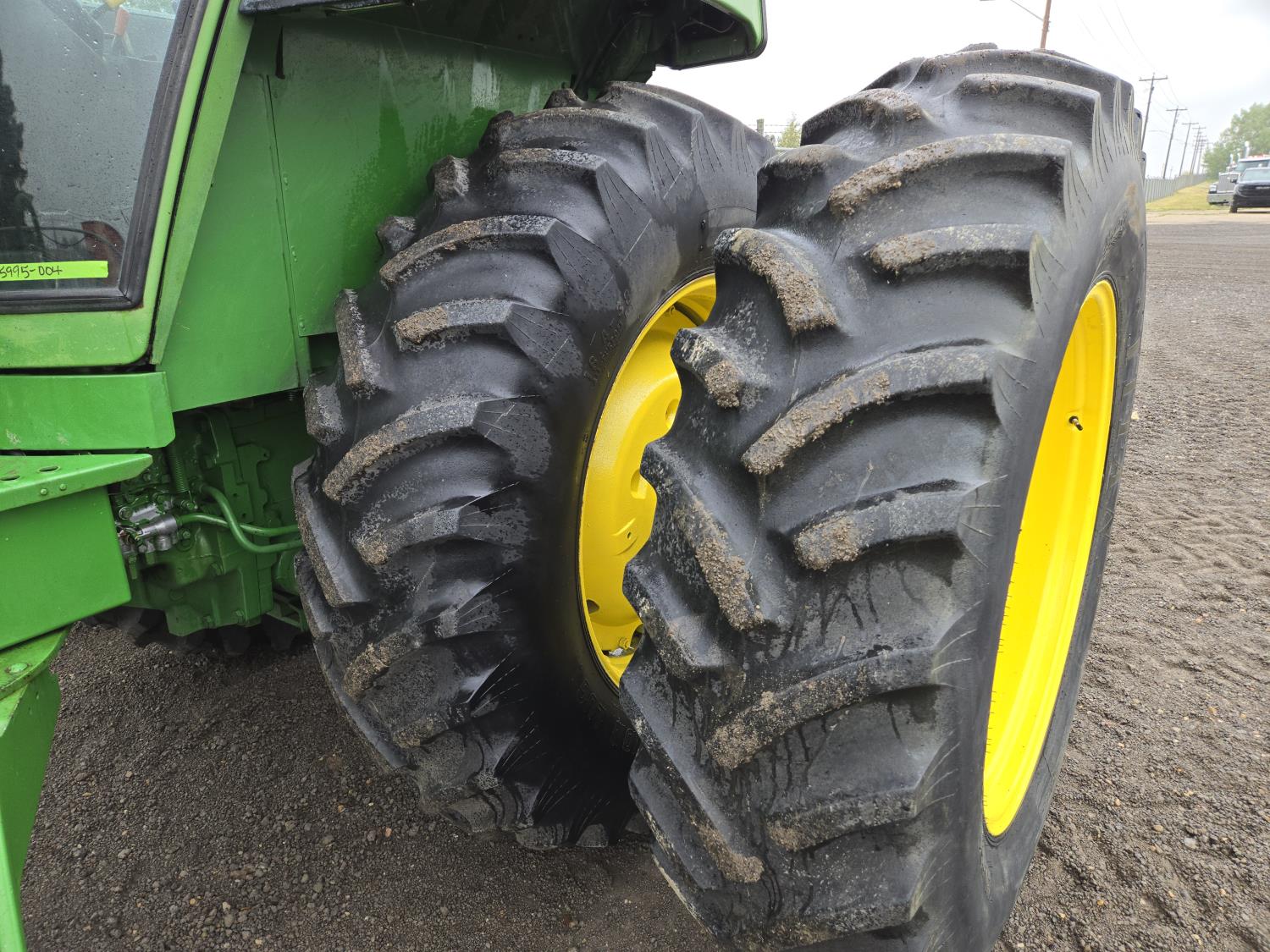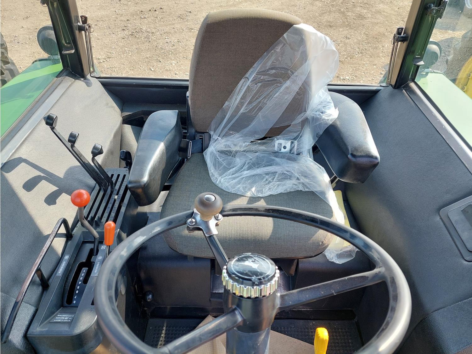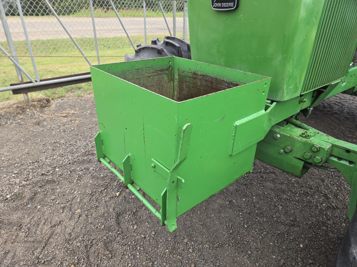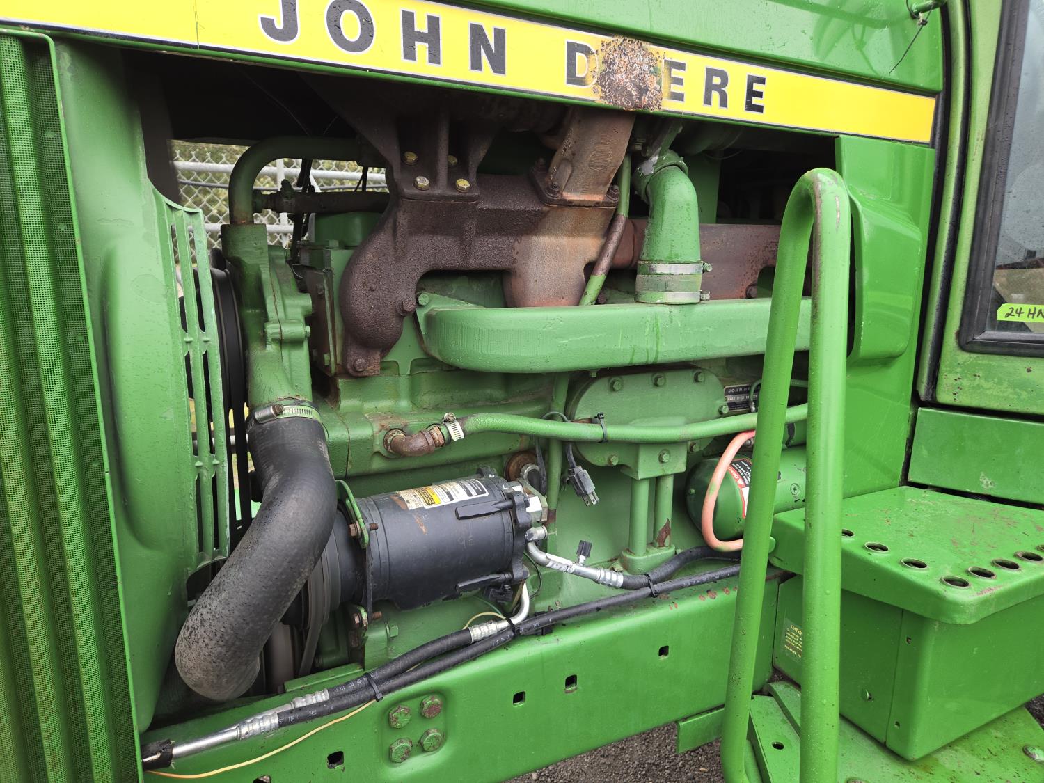 John Deere 6.6 L 6 cylinder engine, 150 PTO HP, 8 speed power shift transmission, hydraulic assist front wheel drive, cab, A/C, radio, 1000 PTO, Q/A 3 point hitch, 3 rear hydraulic outlets, 14.69-24 front tires, 18.4-38 rear tires, factory duals, front weight box