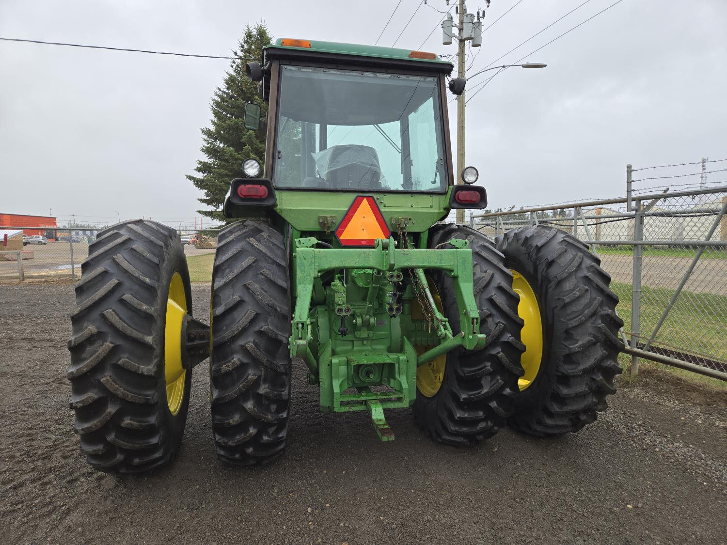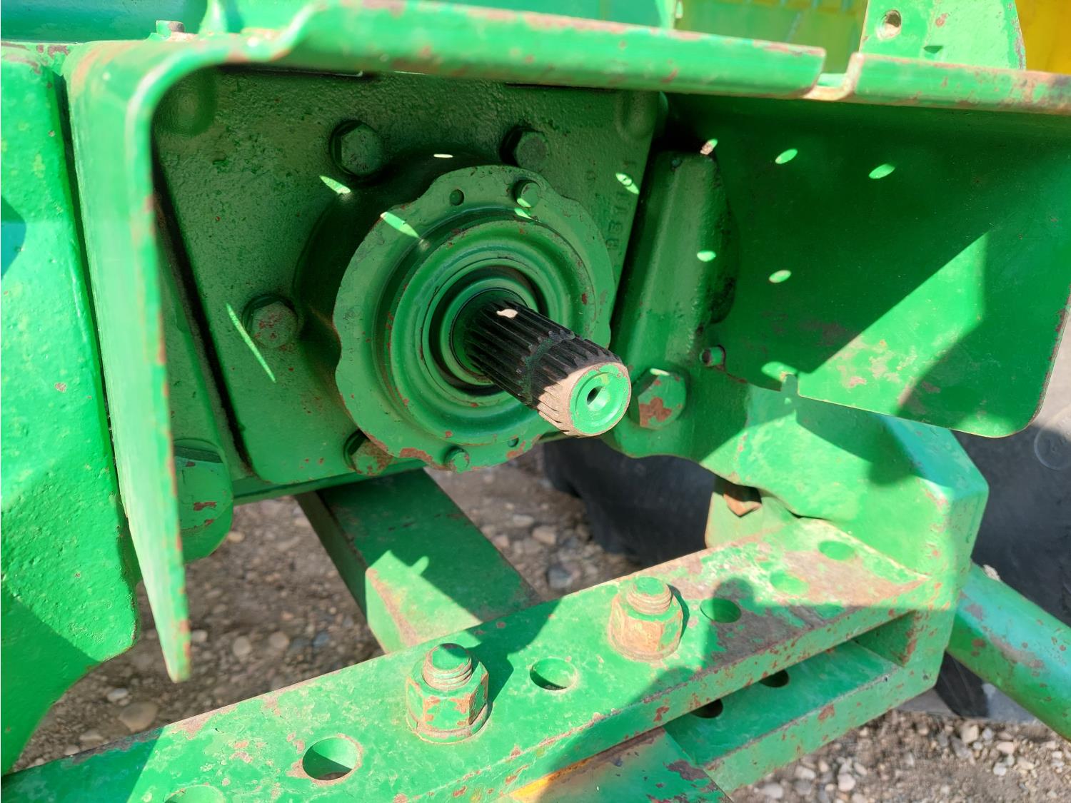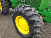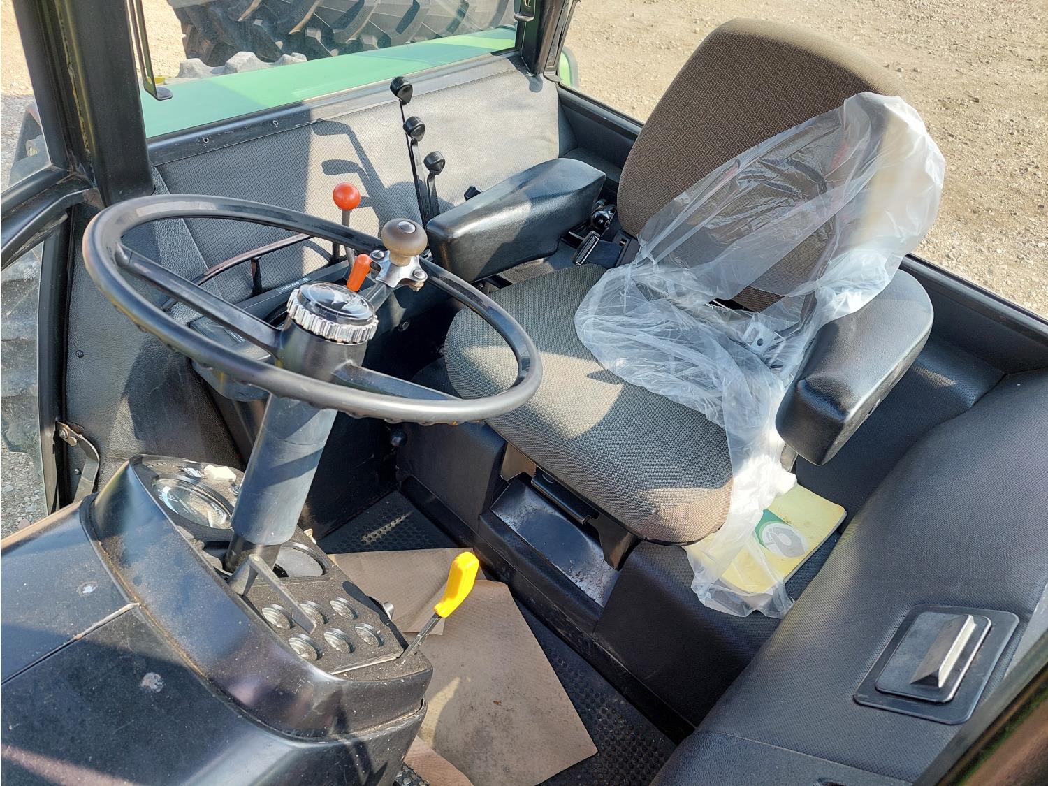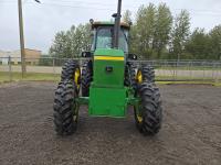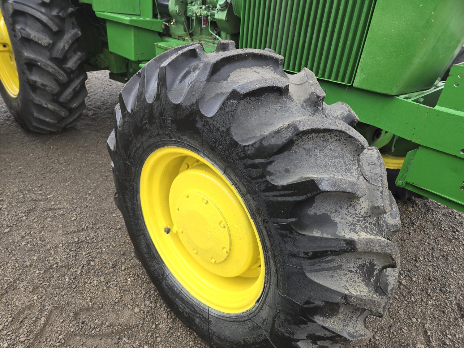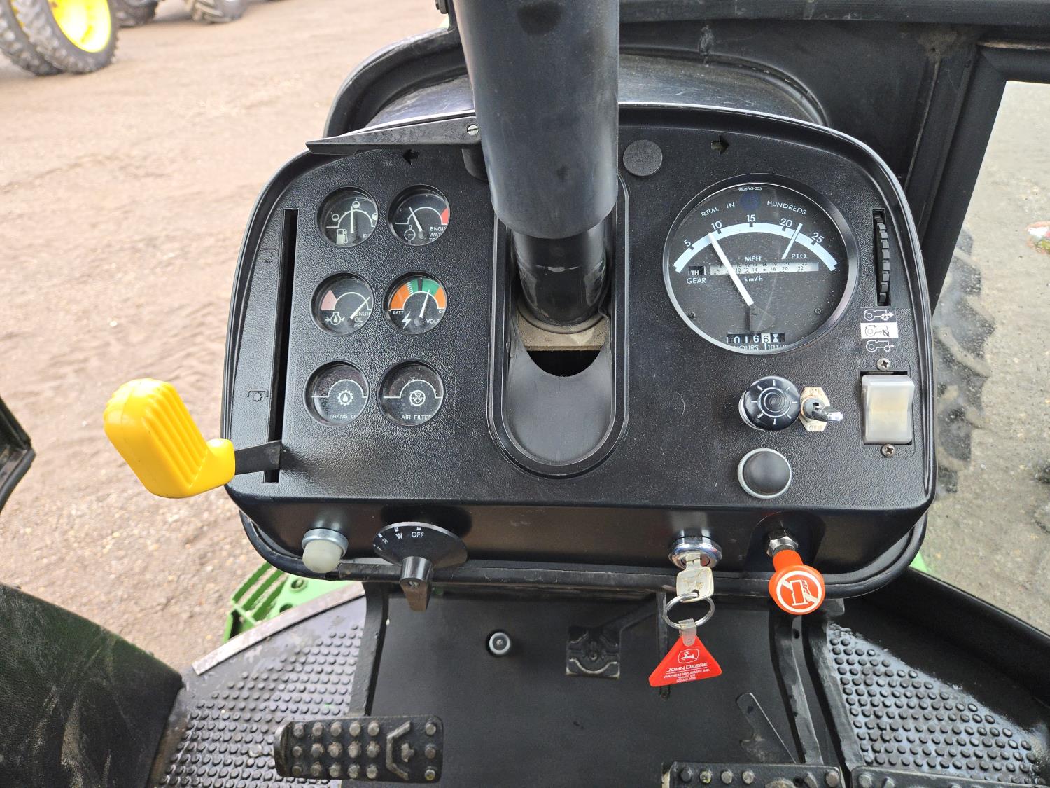 John Deere 6.6 L 6 cylinder engine, 150 PTO HP, 8 speed power shift transmission, hydraulic assist front wheel drive, cab, A/C, radio, 1000 PTO, Q/A 3 point hitch, 3 rear hydraulic outlets, 14.69-24 front tires, 18.4-38 rear tires, factory duals, front weight box
