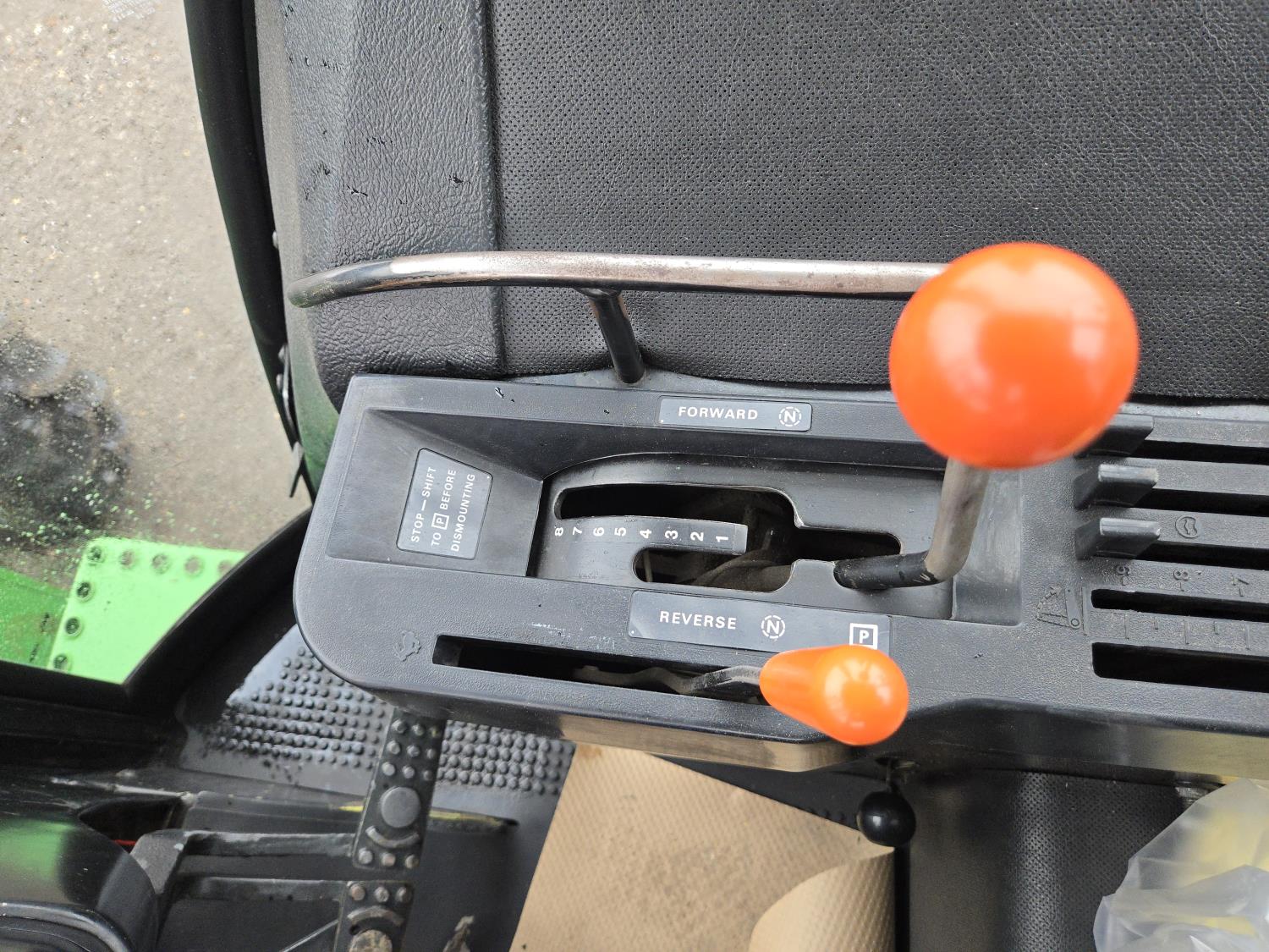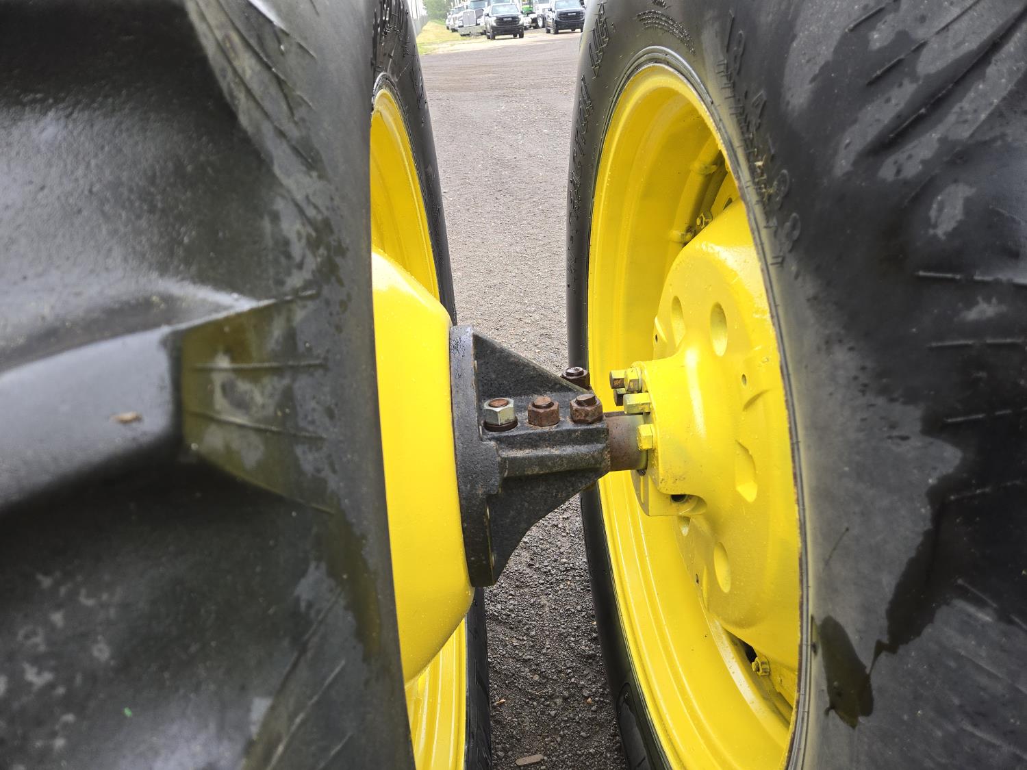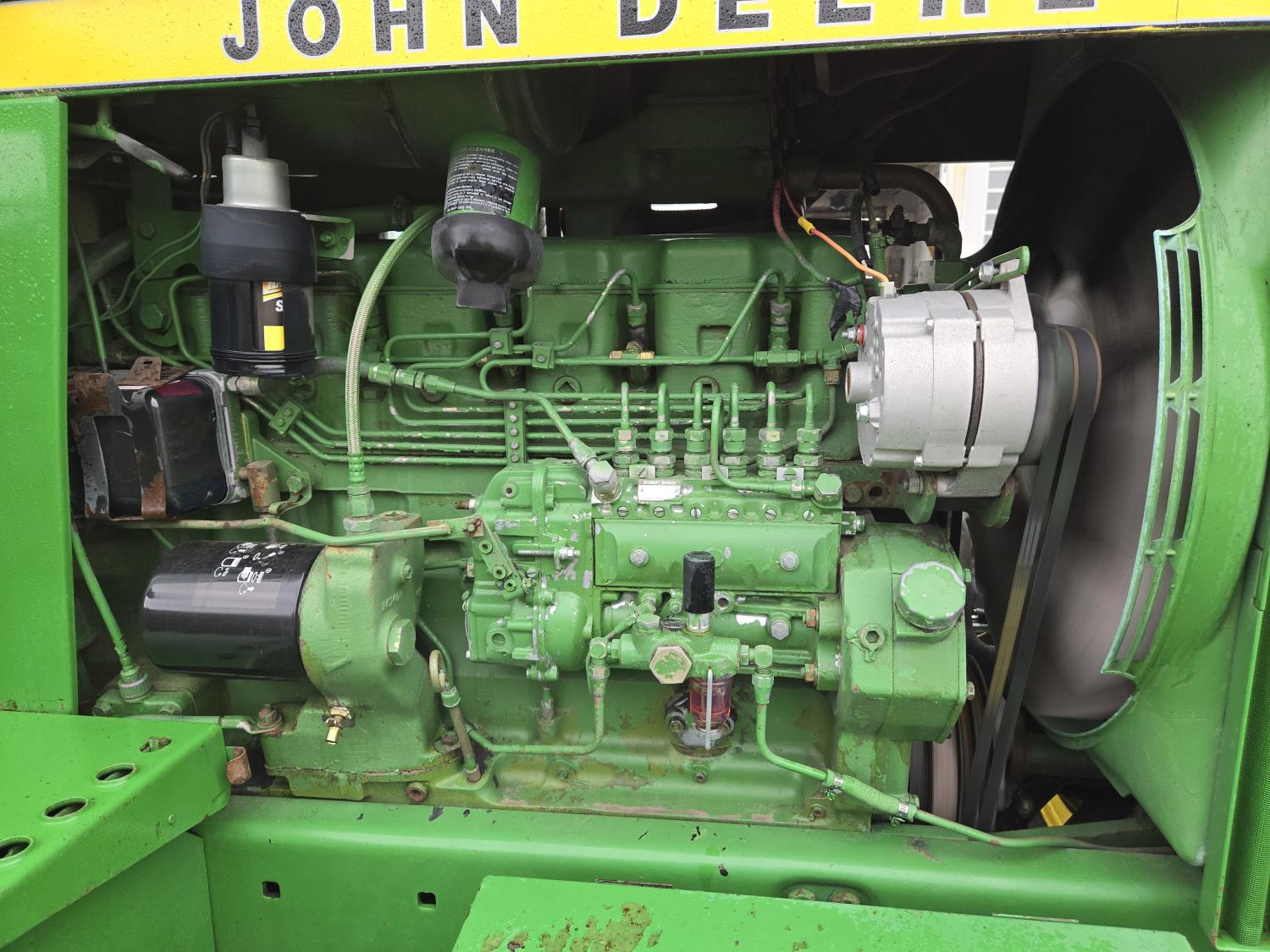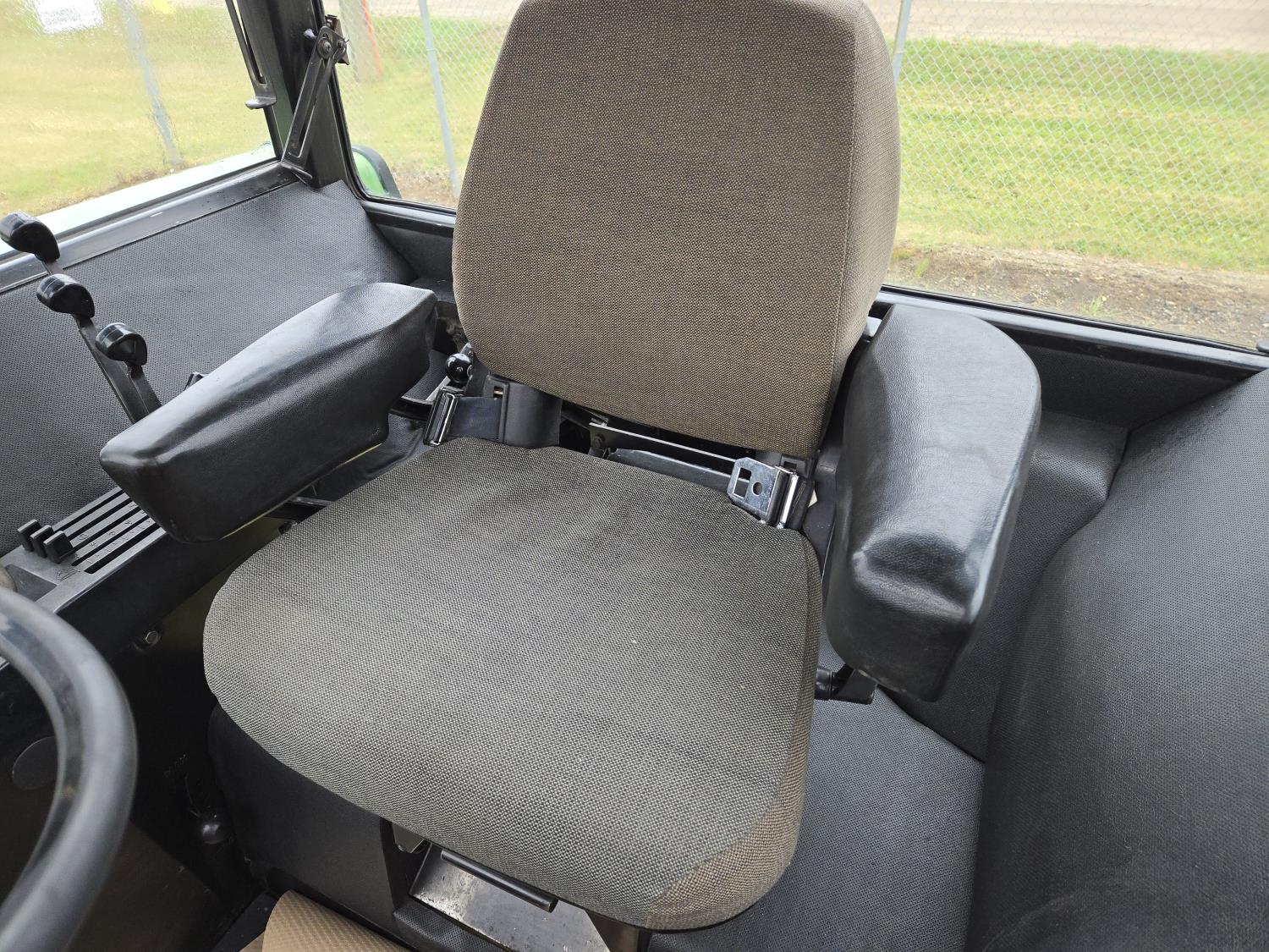 John Deere 6.6 L 6 cylinder engine, 150 PTO HP, 8 speed power shift transmission, hydraulic assist front wheel drive, cab, A/C, radio, 1000 PTO, Q/A 3 point hitch, 3 rear hydraulic outlets, 14.69-24 front tires, 18.4-38 rear tires, factory duals, front weight box