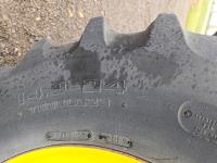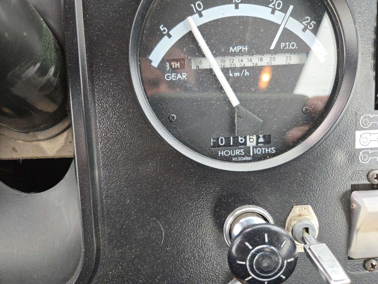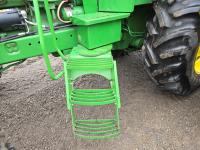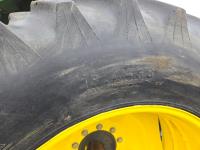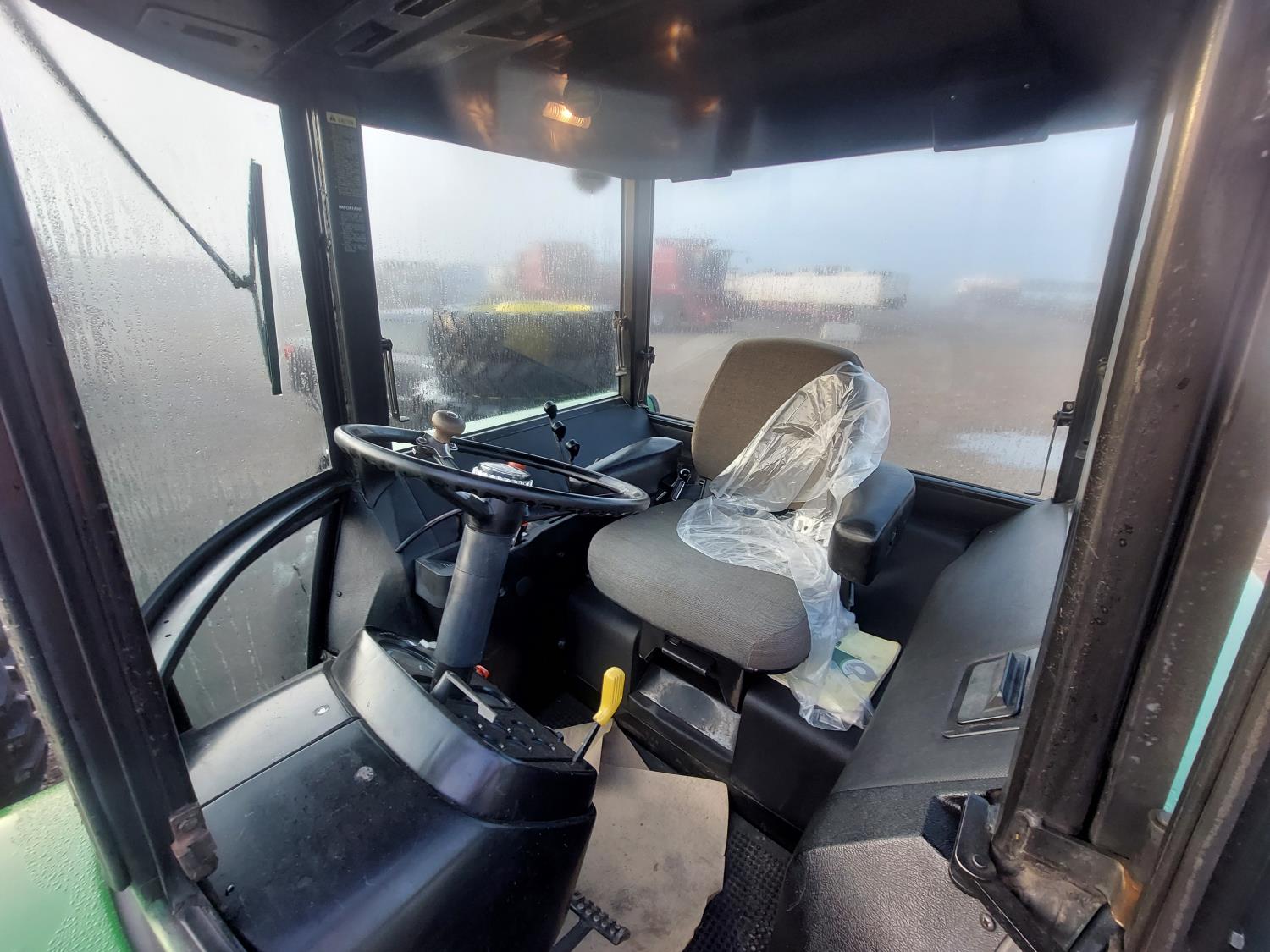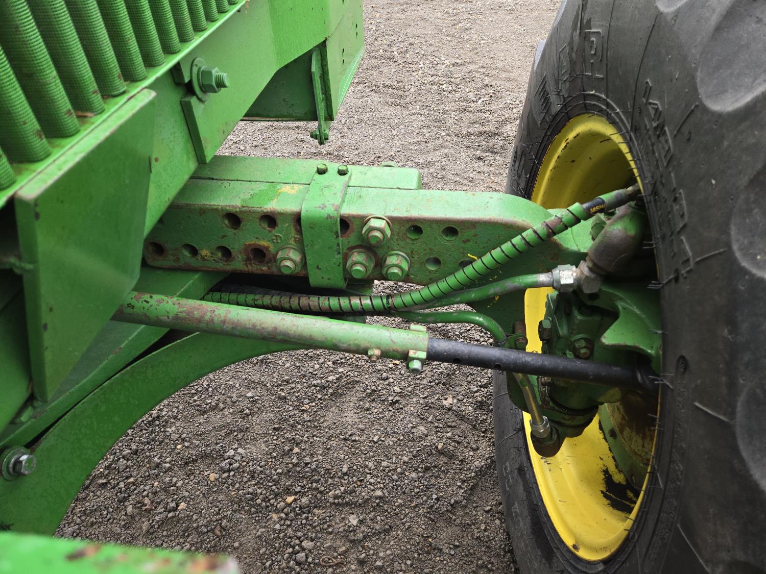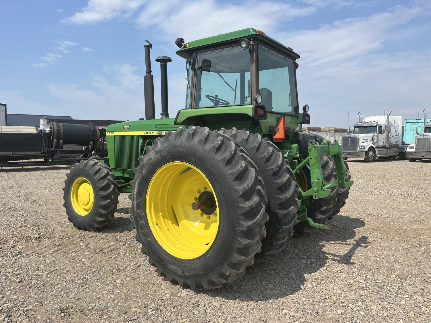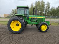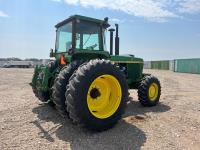 John Deere 6.6 L 6 cylinder engine, 150 PTO HP, 8 speed power shift transmission, hydraulic assist front wheel drive, cab, A/C, radio, 1000 PTO, Q/A 3 point hitch, 3 rear hydraulic outlets, 14.69-24 front tires, 18.4-38 rear tires, factory duals, front weight box