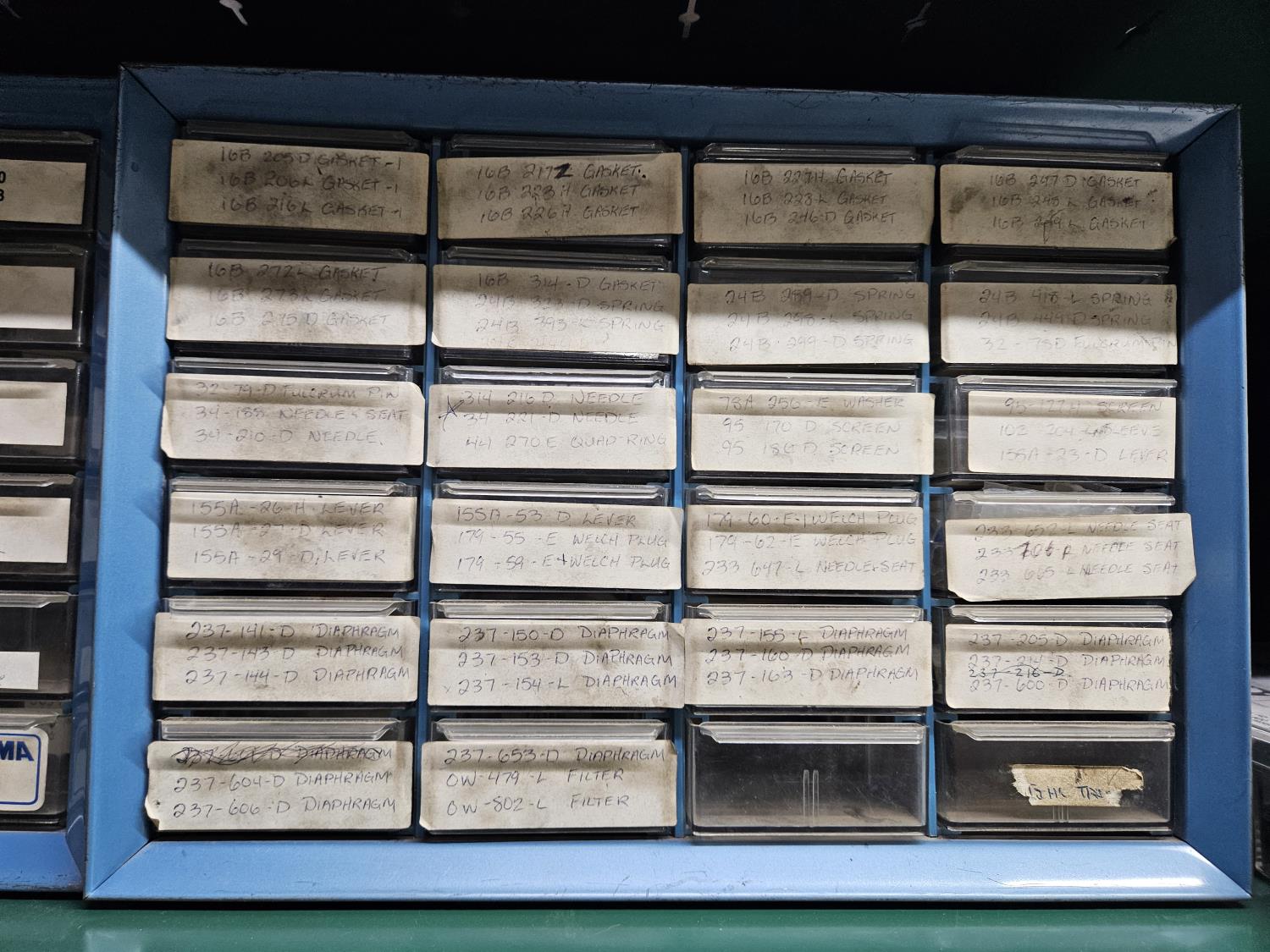 1973 Bolt Bins with Assorted Gaskets, Diaphragm's, Filters, Levers, Plugs (Unused)