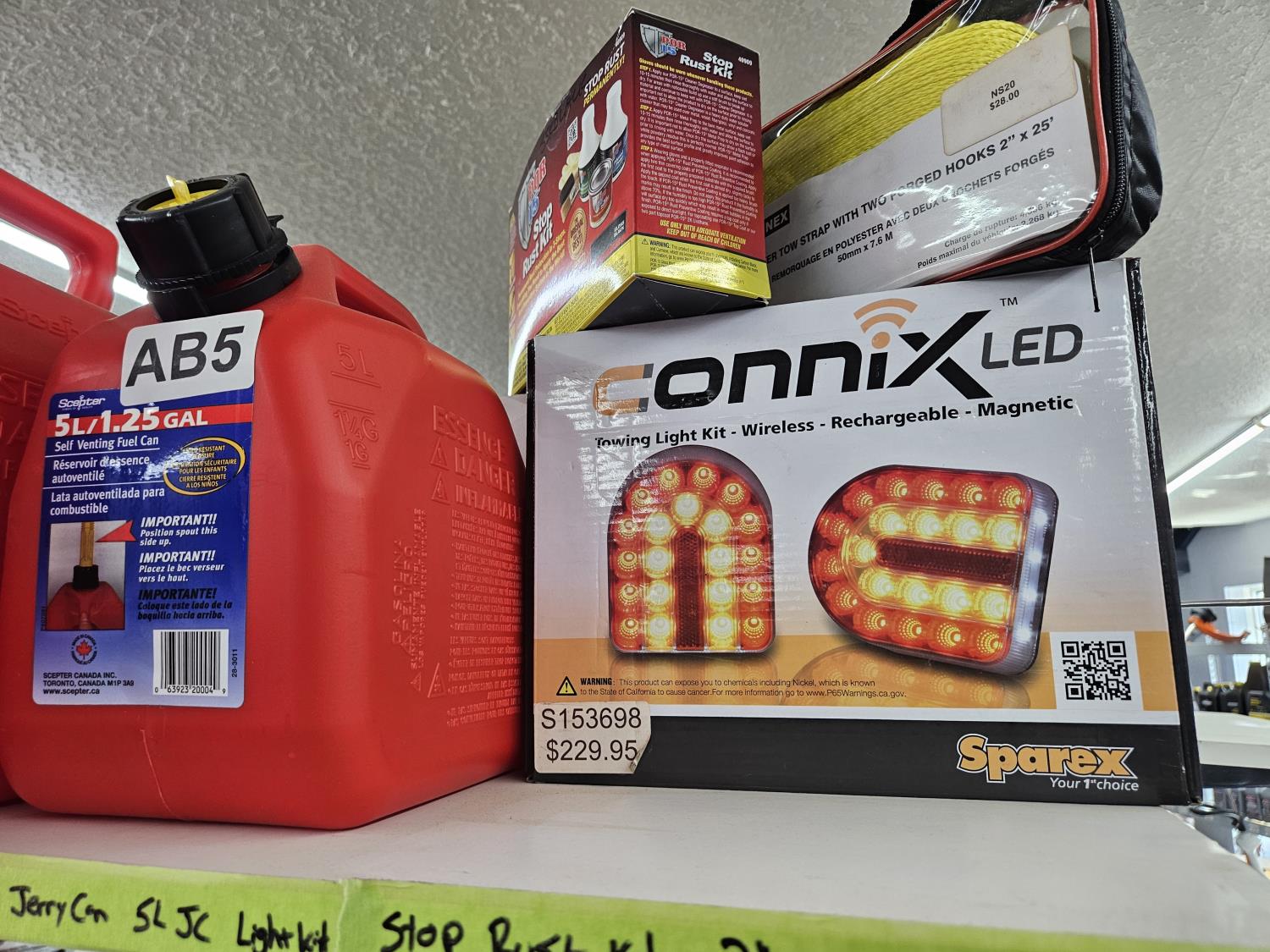 981 Connix LED Towing Light Kit, (2) Jerry Cans, Stop Rust Kit and 2 Inch X 25 Ft Tow Strap (Unused)