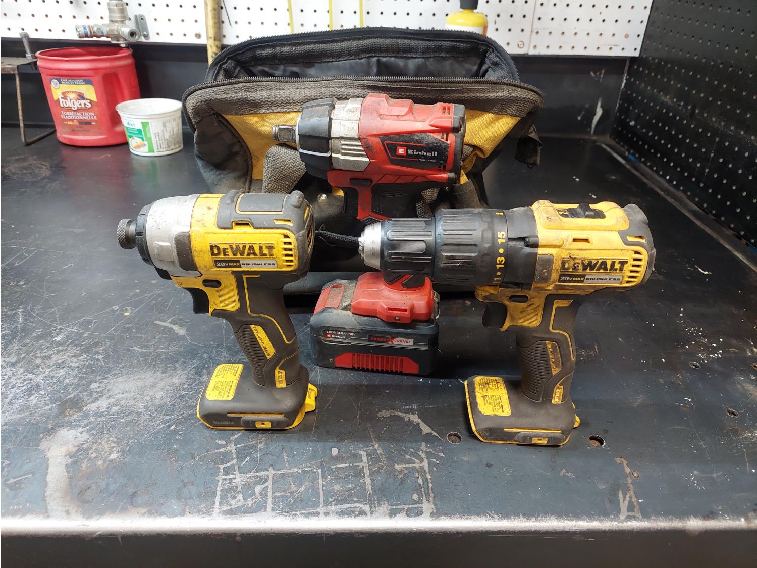ultrasonic cleaner, cam chain cutter, air nail gun, hydraulic puller master kit, Einhell and DeWalt impact drills