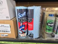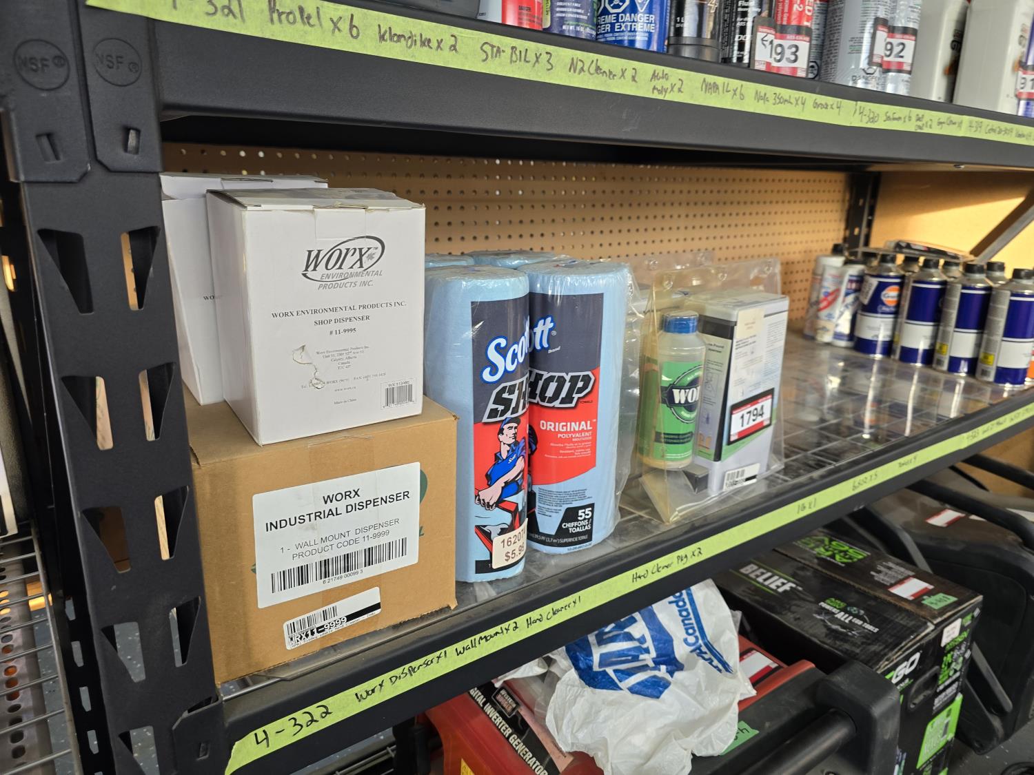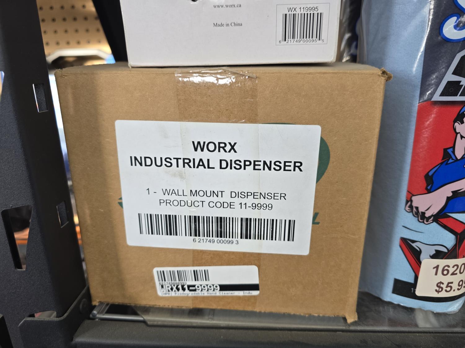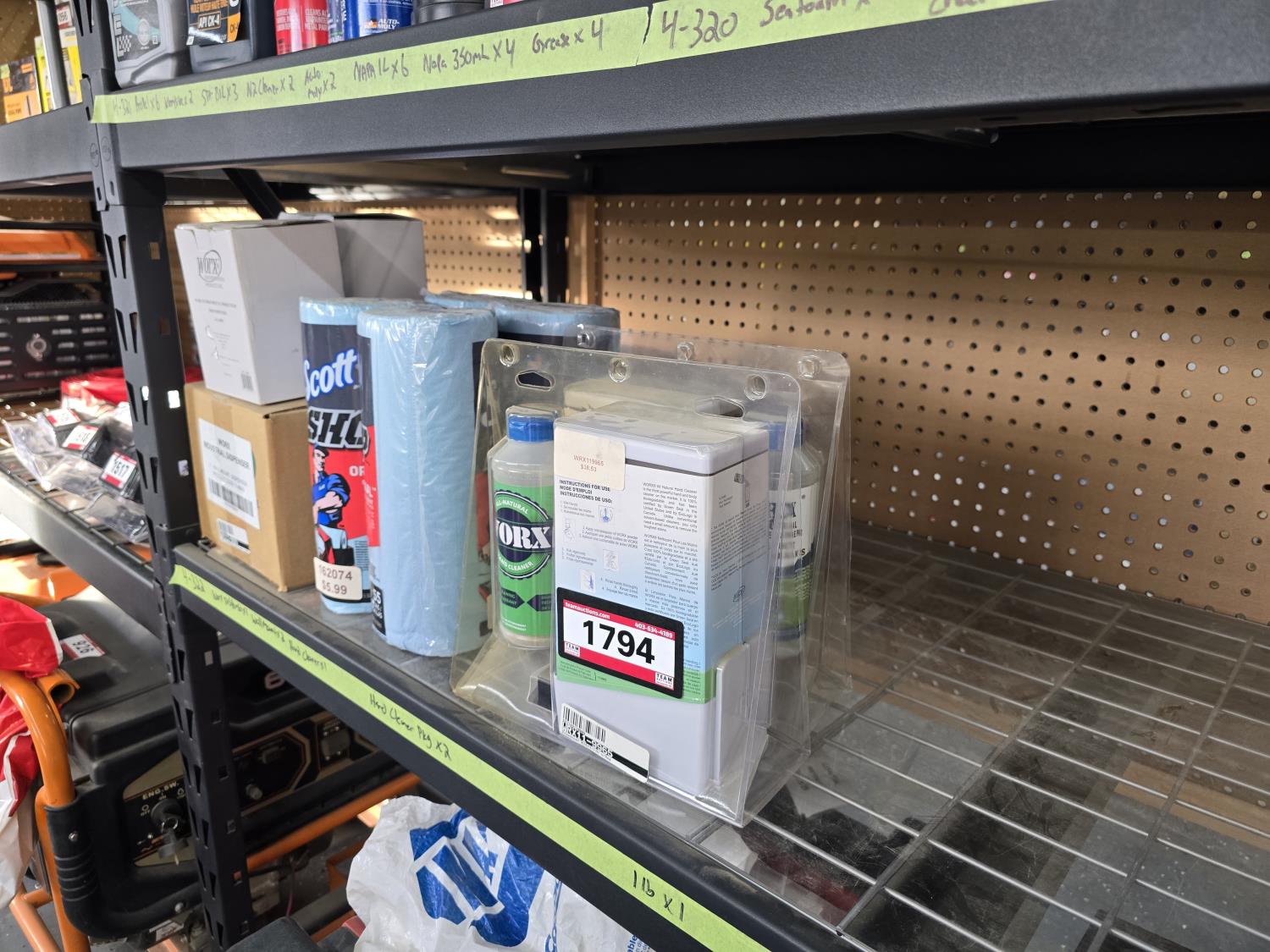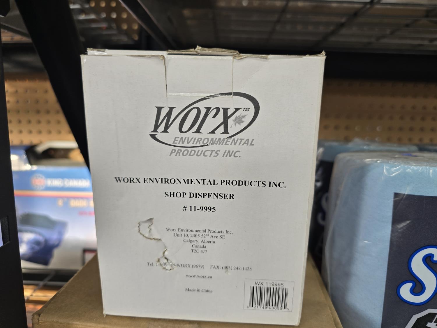 (1) Worx dispenser, (2) Worx wall mount dispensers, hand cleaner, (4) Scott shop towels