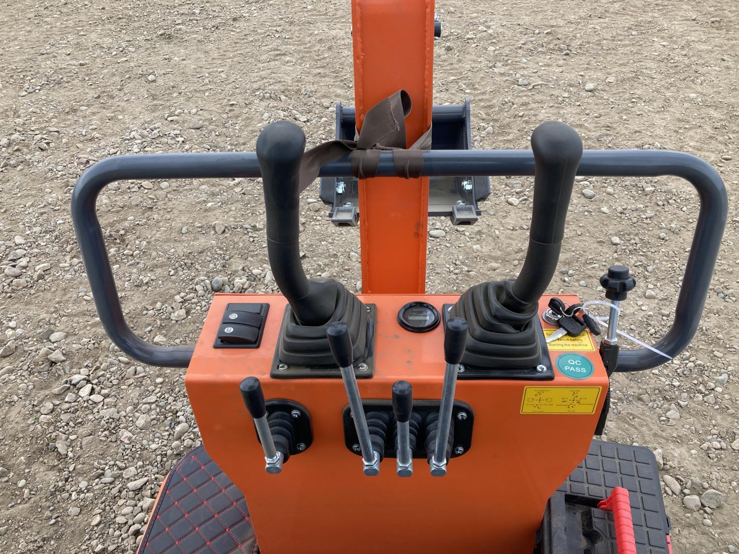 Enclosed cab, pilot controls, gas engine, 15 inch dig bucket, manual thumb, 1 auxiliary hydraulics, 31 inch stick, backfill blade, 7 inch rubber tracks
