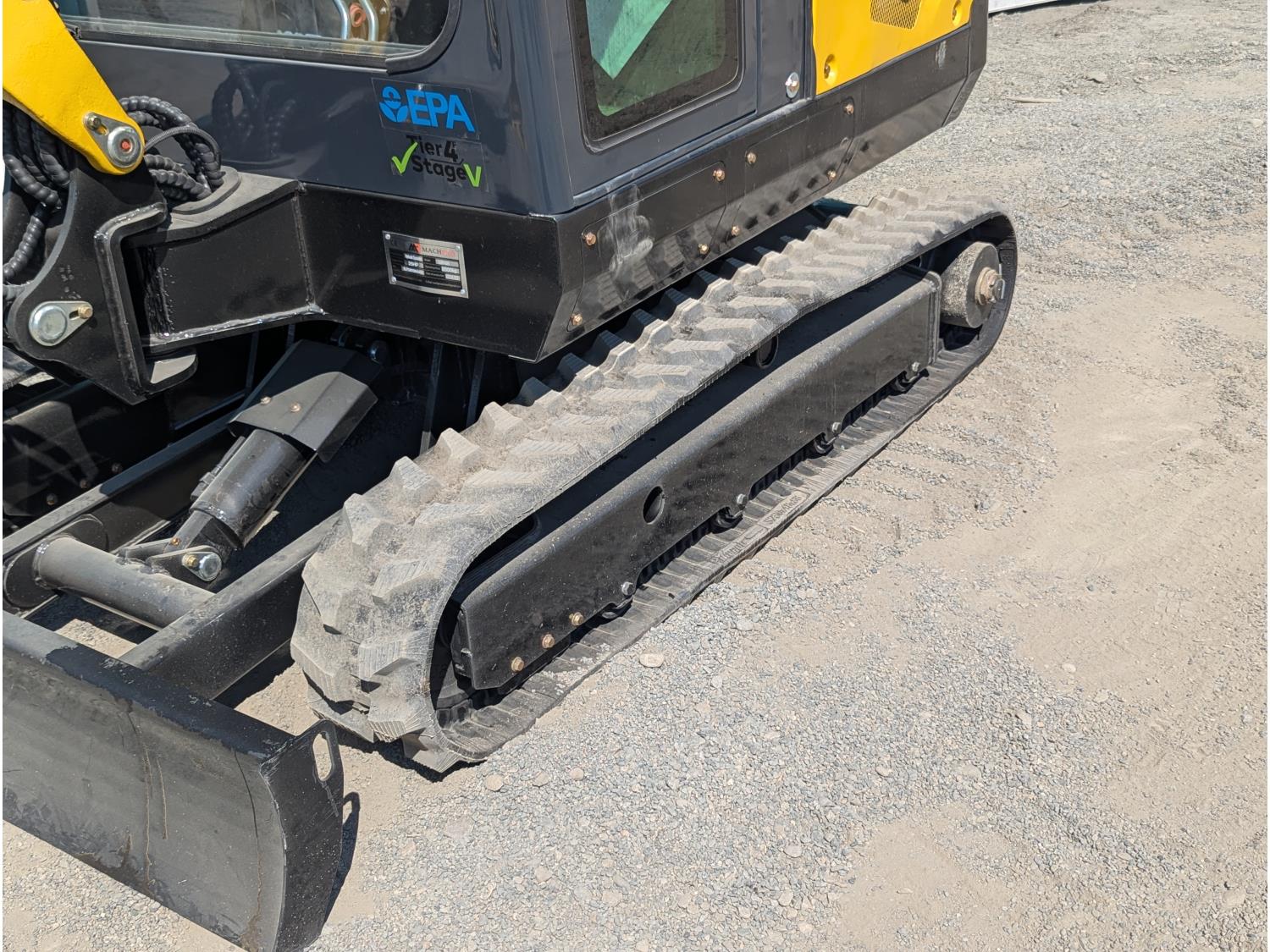 Enclosed cab, 25hp gas engine, 15 inch dig bucket, manual coupler, 1 auxiliary hydraulics, swing boom, backfill blade, rubber tracks