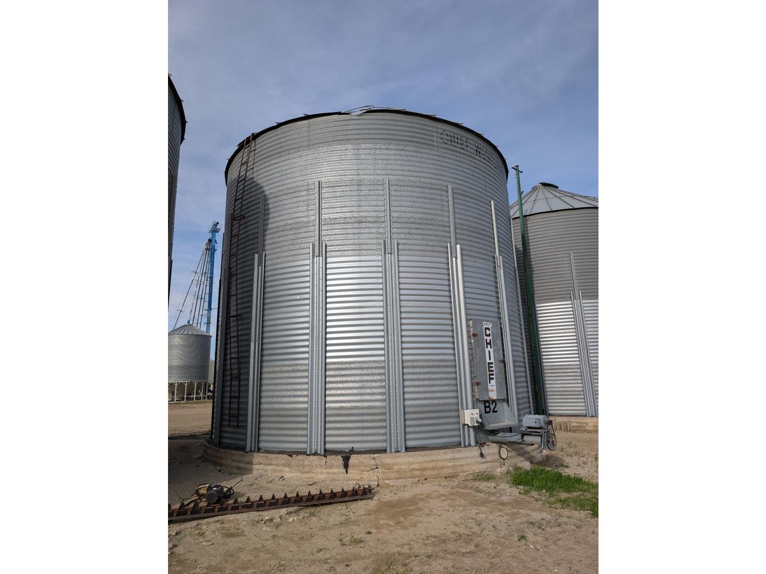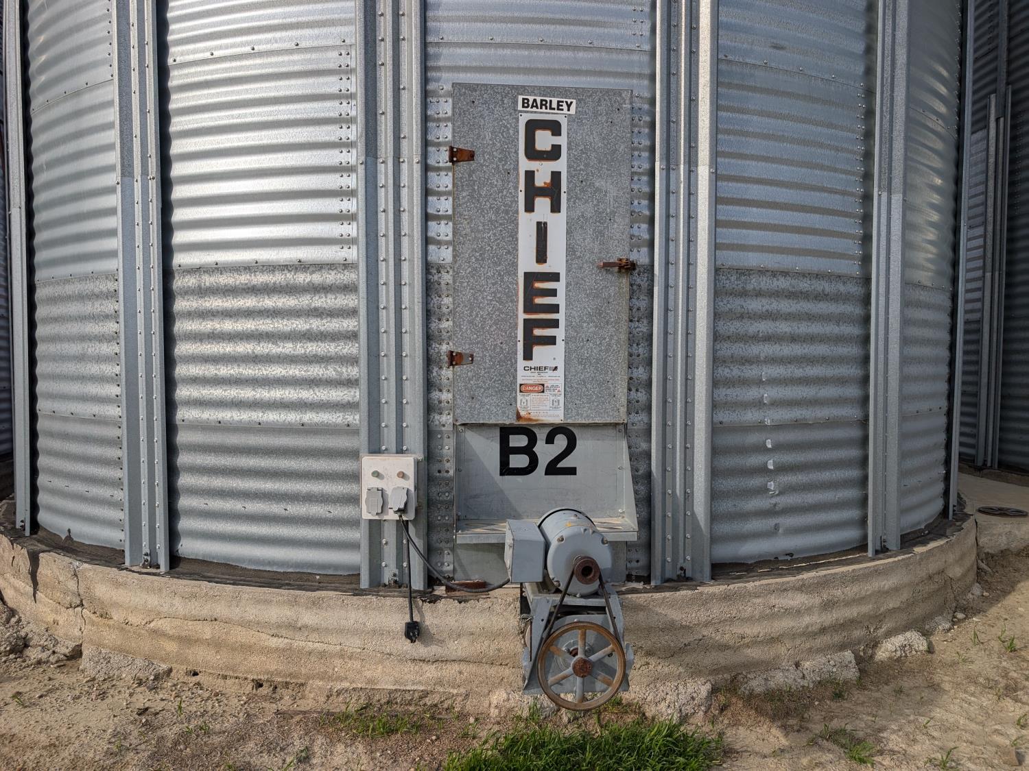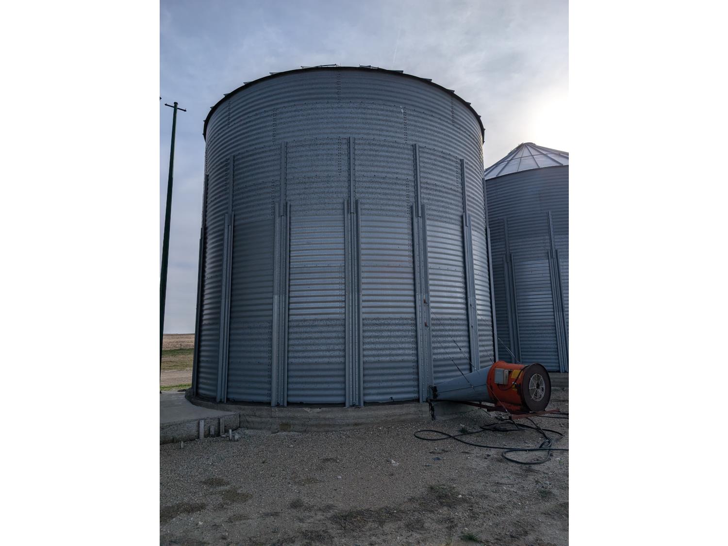 15,000± bu capacity, concrete floor, wall stiffeners, Sudenga unloading auger, floor aeration, Caldwell 10.5 HP 230 single phase aeration fan