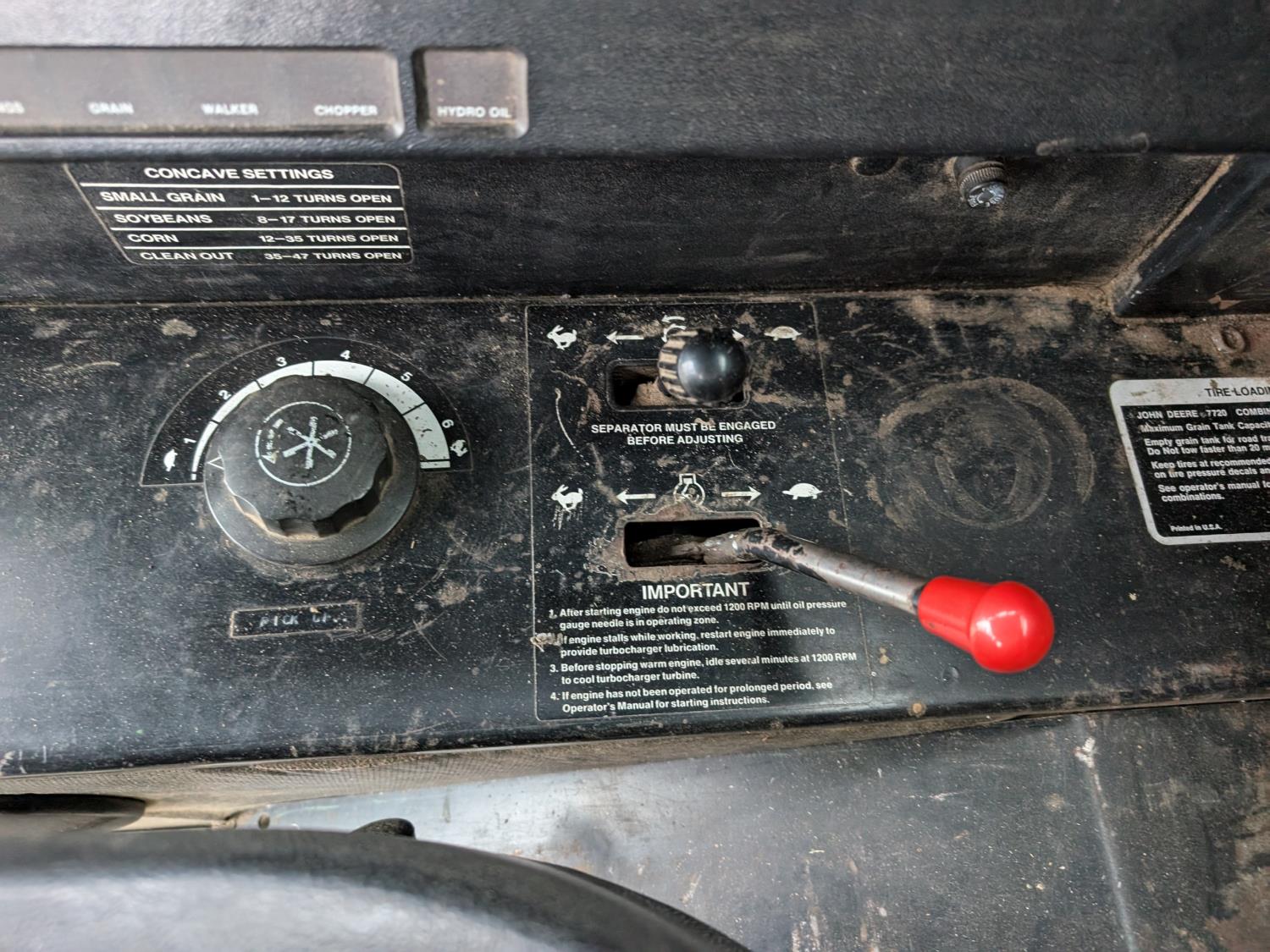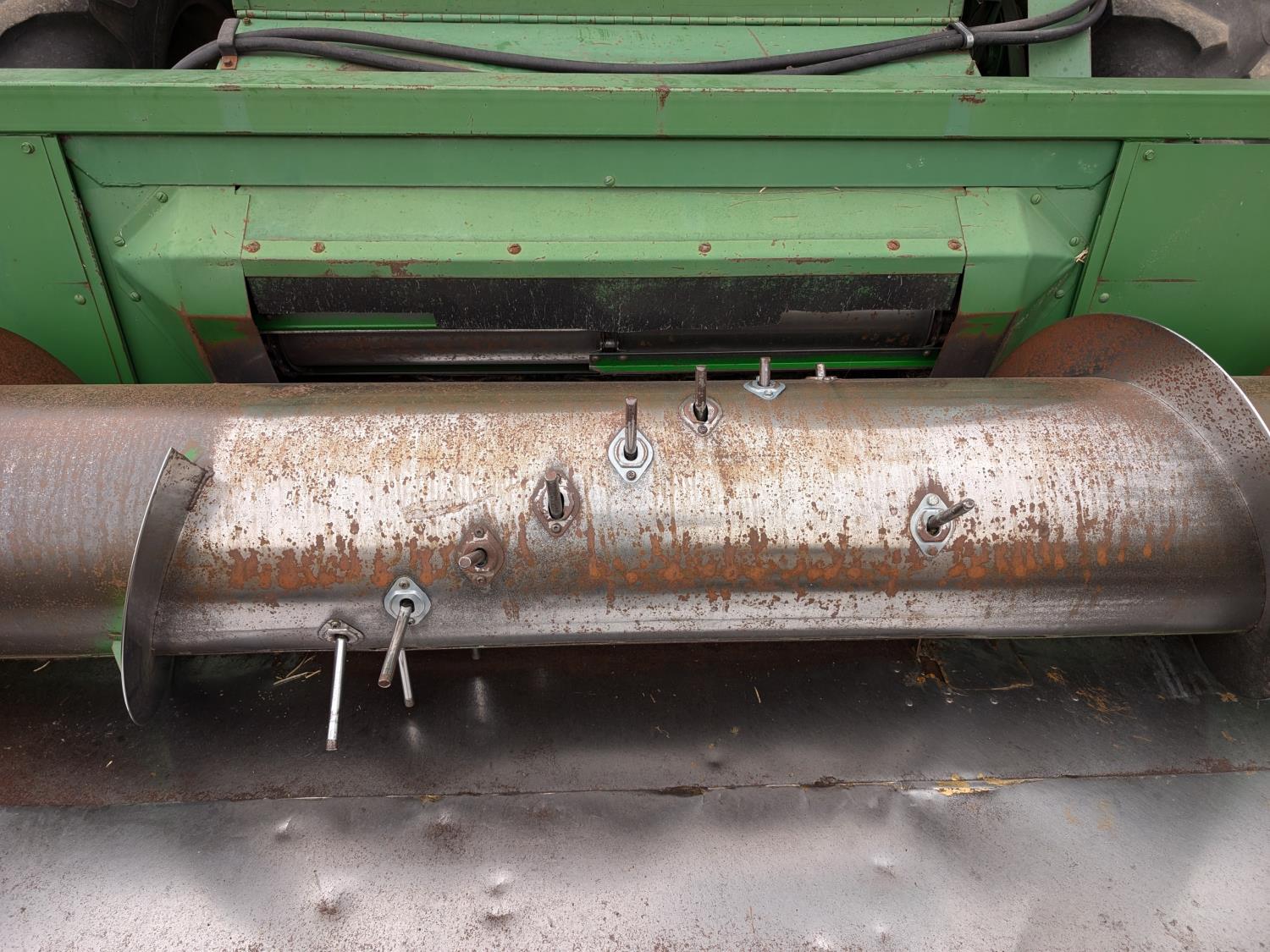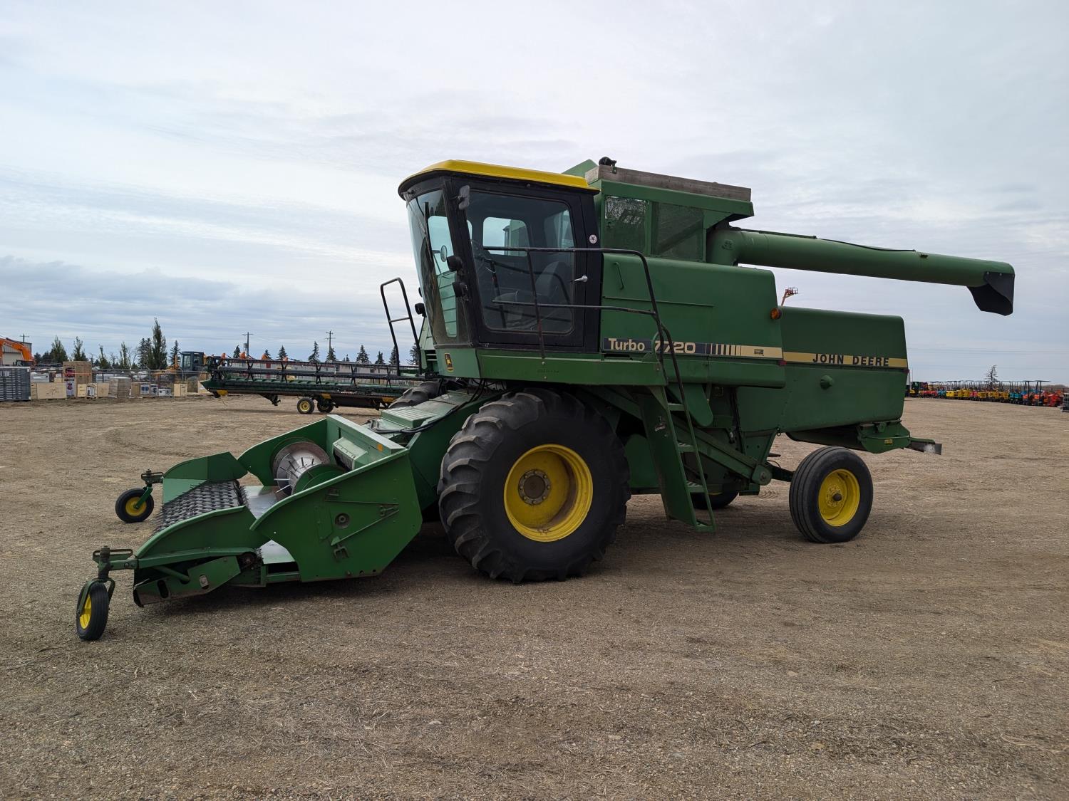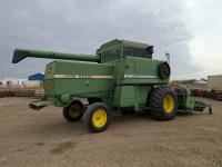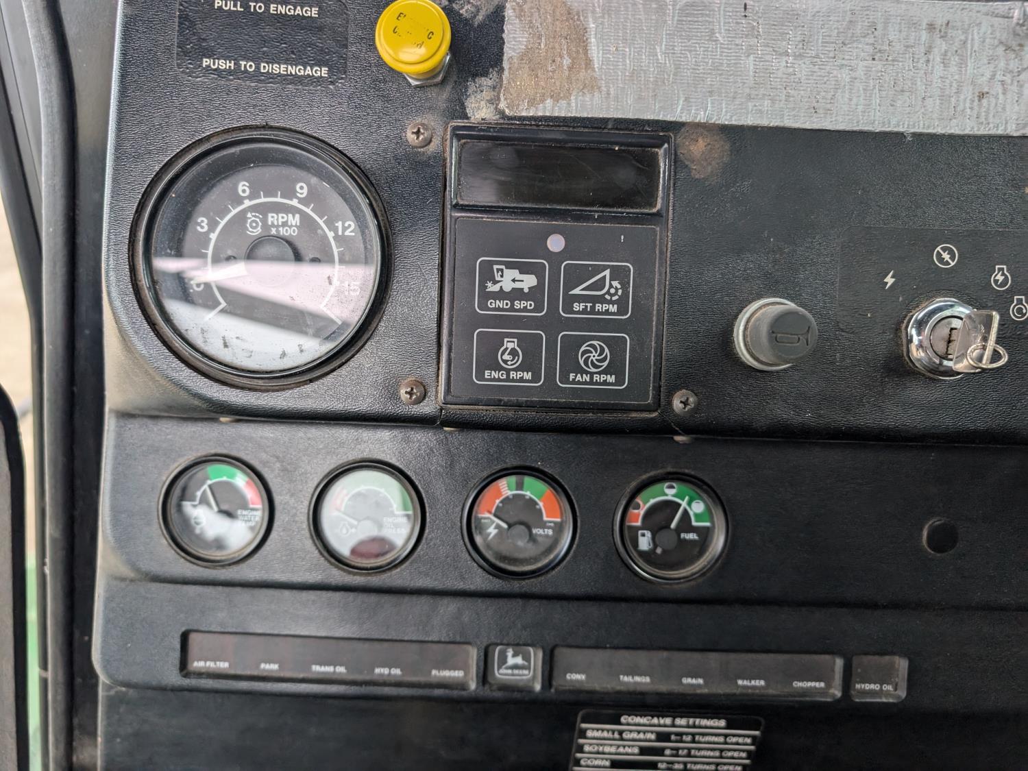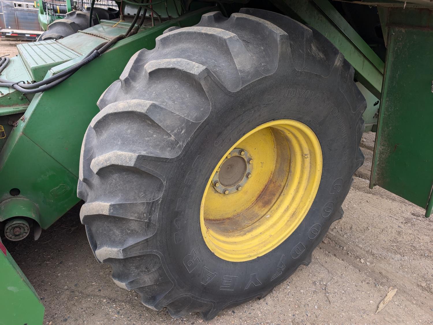 John Deere pick-up header, variable speed reel, rock trap, yield & moisture, chopper, grain tank extensions, hydrostatic drive, A/C, radio, 24.5-32 front tires, 11.25-24 rear tires