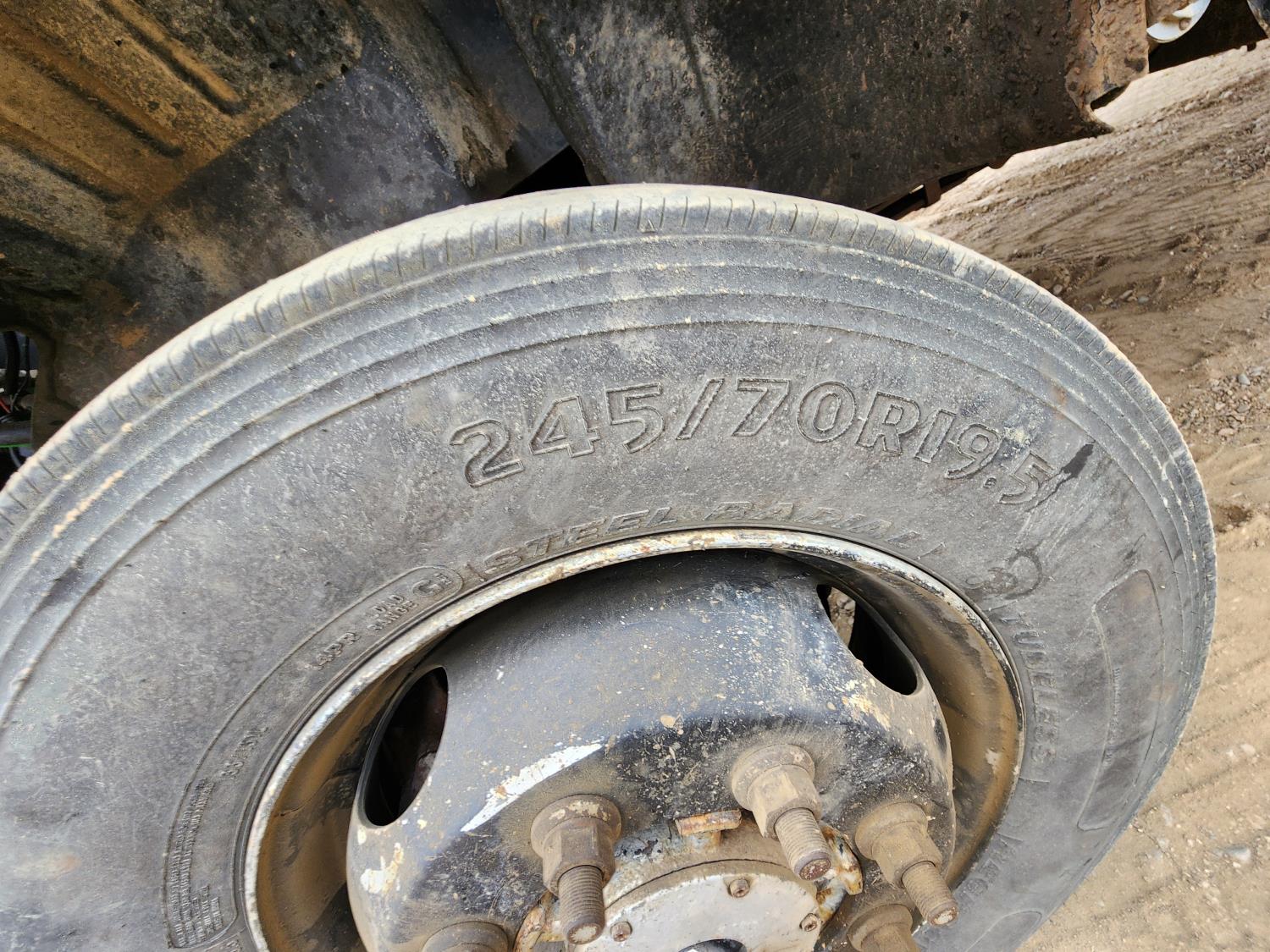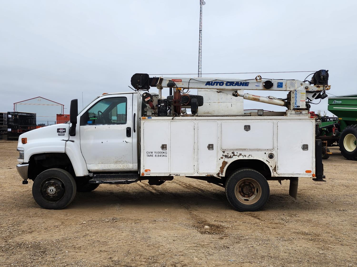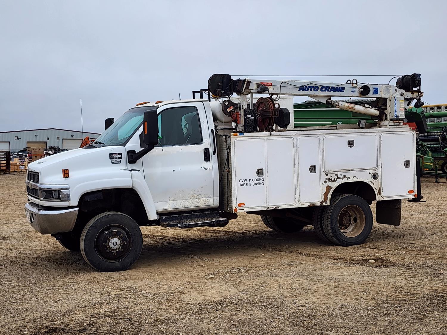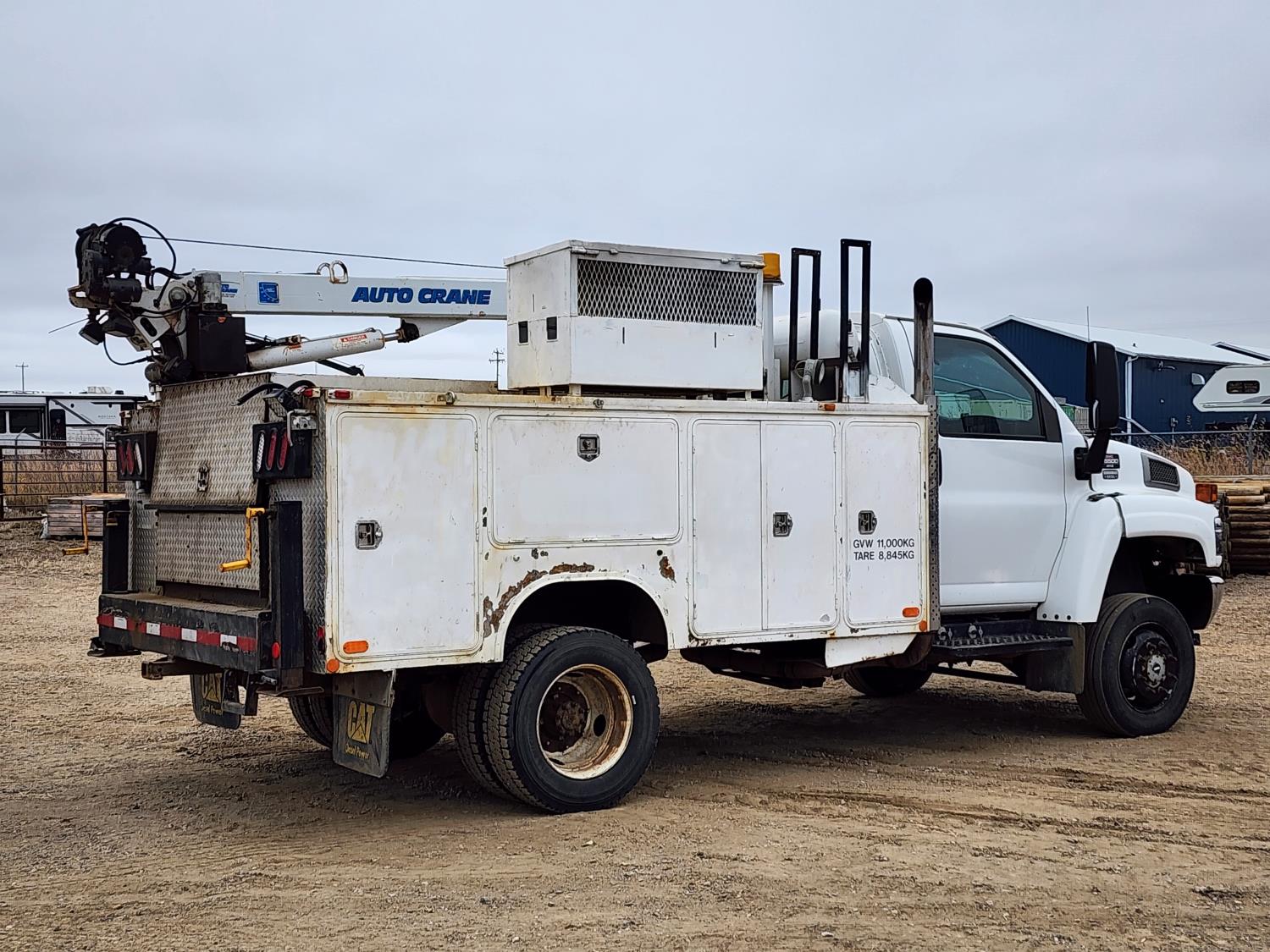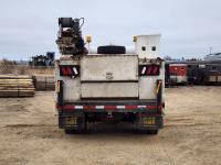Duramax 6.6 L V8 diesel engine, Allison automatic transmission, Auto Crane 5005EH straight boom crane, Western Truck body, hydraulic air compressor, spring suspension, 8,000 lb front axle, 13,500 lb rear axles, 245/70R19.5 tires
