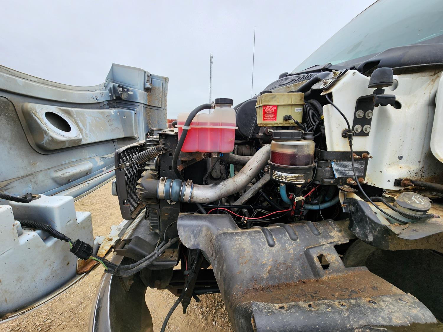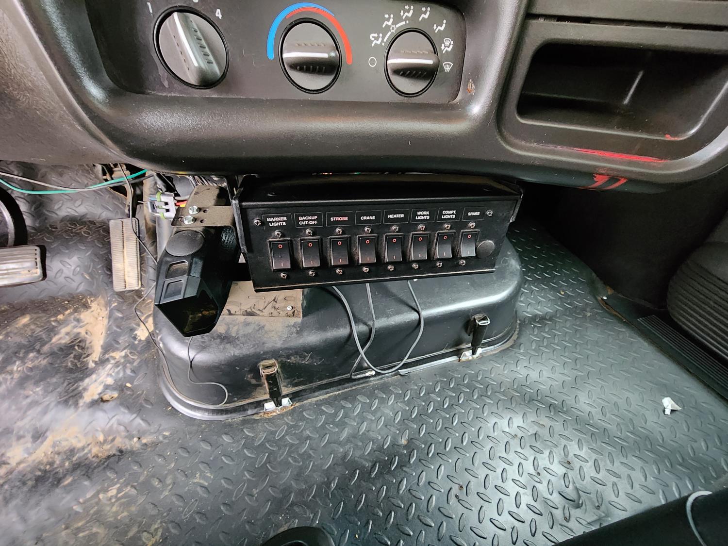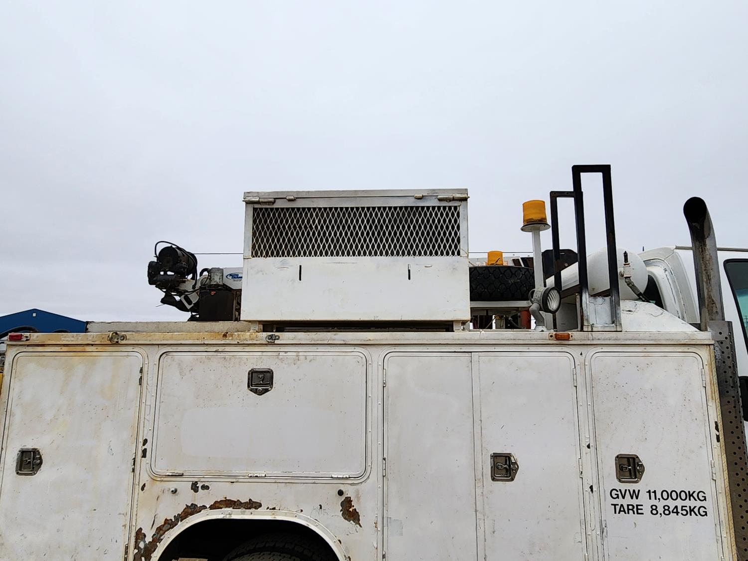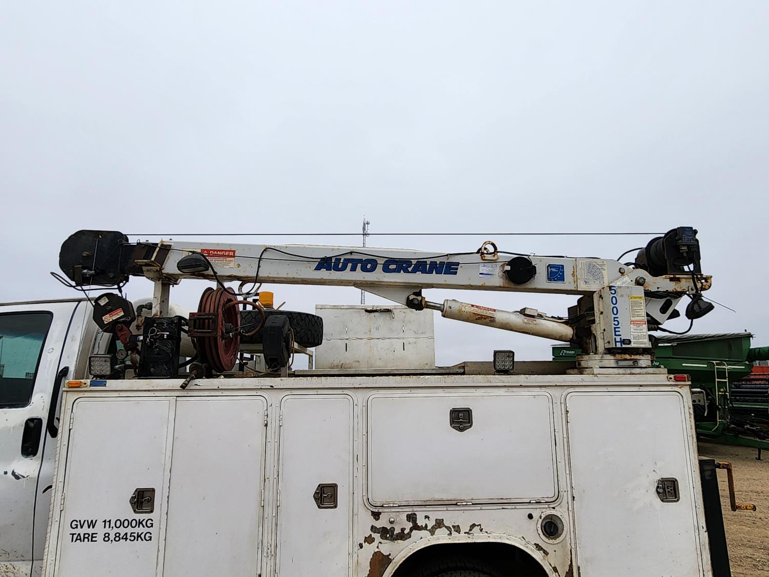 Duramax 6.6 L V8 diesel engine, Allison automatic transmission, Auto Crane 5005EH straight boom crane, Western Truck body, hydraulic air compressor, spring suspension, 8,000 lb front axle, 13,500 lb rear axles, 245/70R19.5 tires