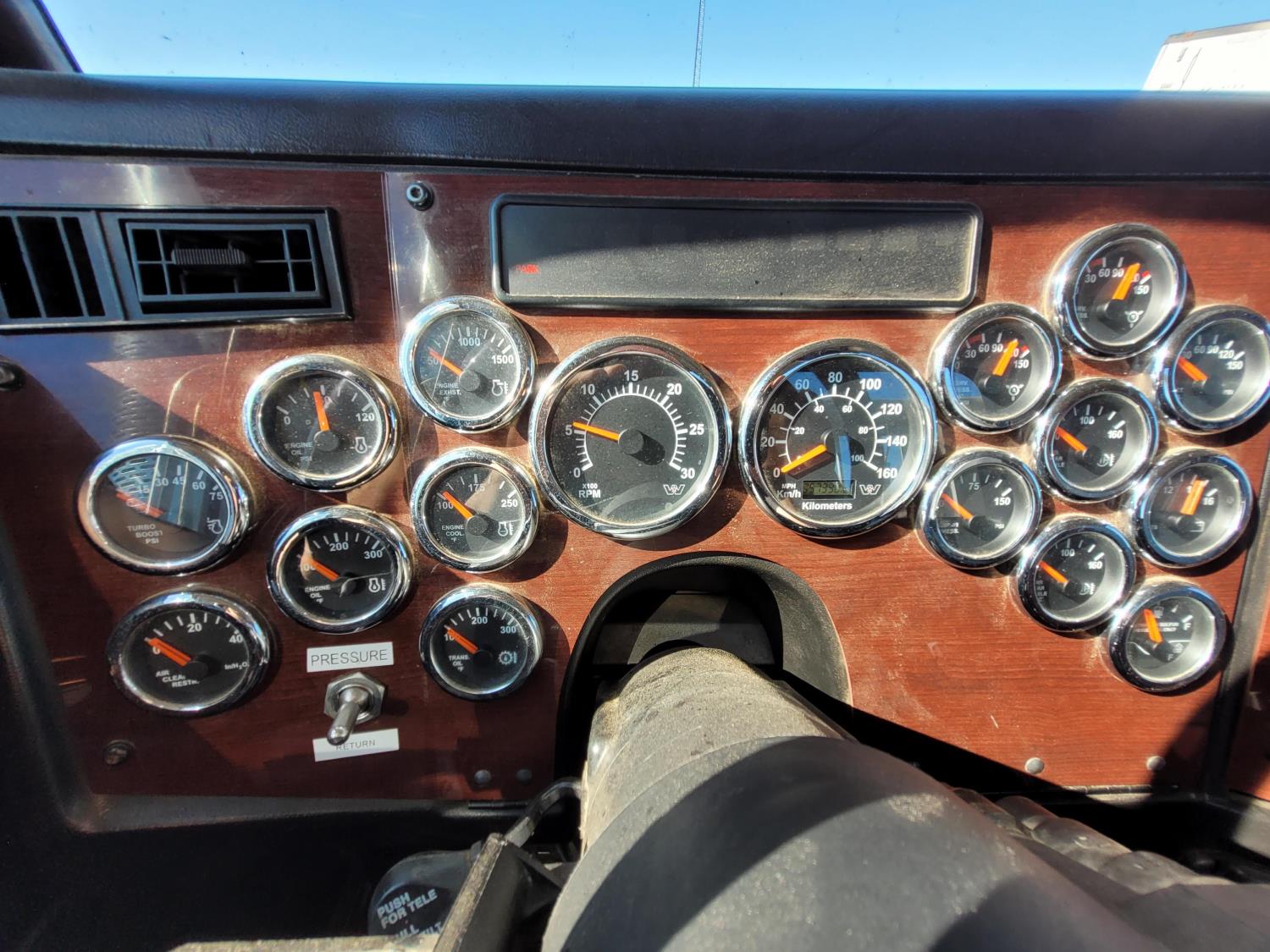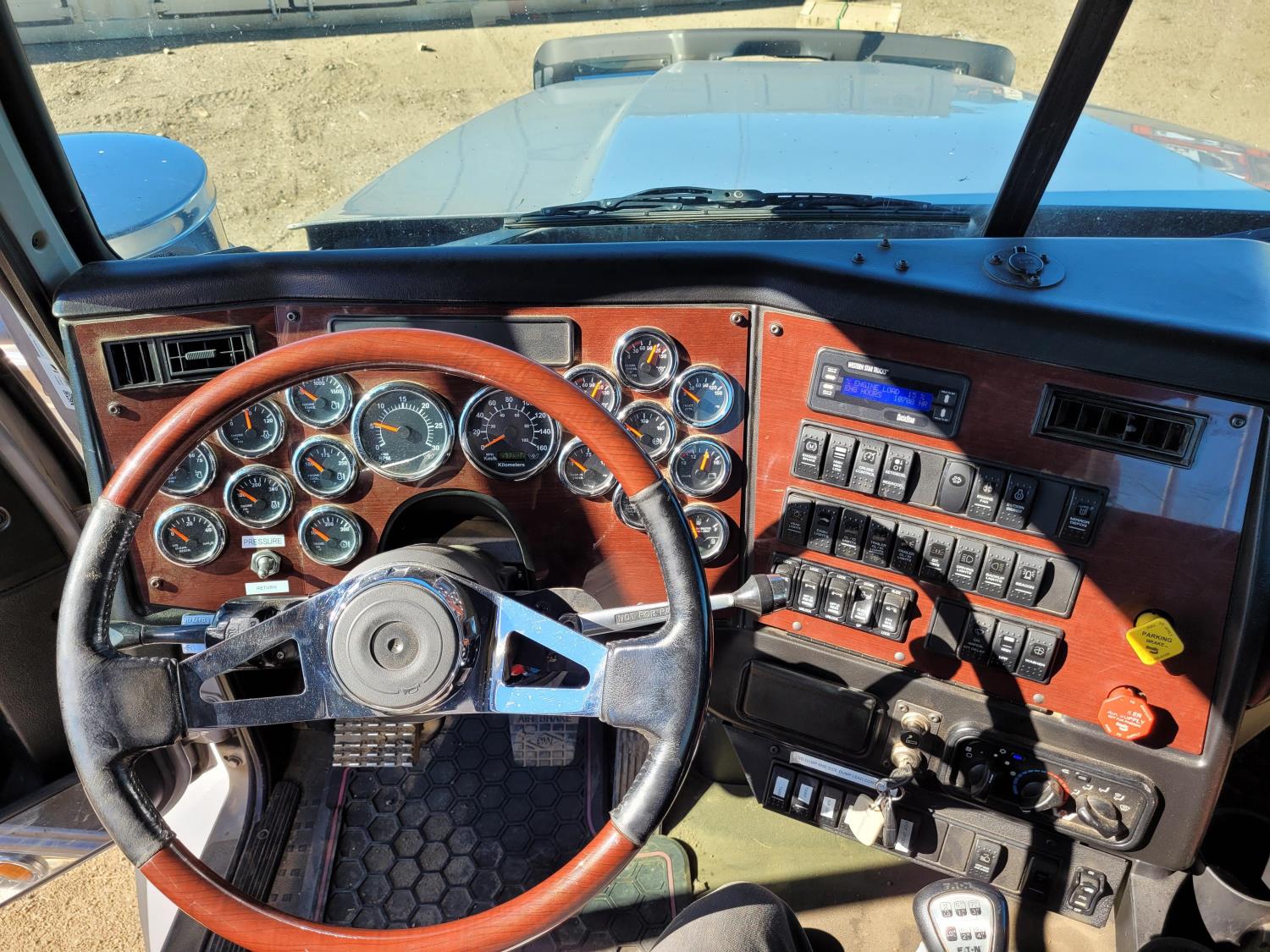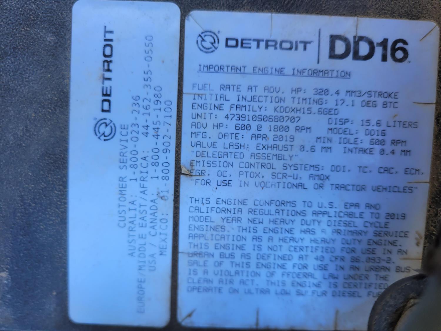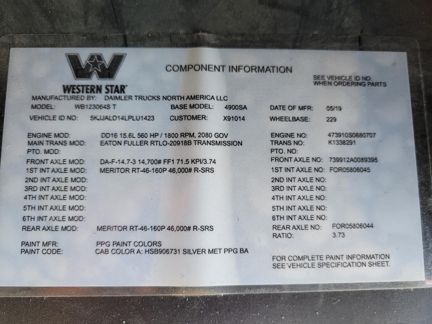 Detroit DD16 15.6 L 6 cylinder 600 HP diesel engine, engine brake, engine block heater, Eaton Fuller RTLO20918B manual transmission, A/C, cruise control, leather interior, air ride seats, radio, CB radio, hydraulic wet kit, Merritt aluminum headache rack, Merritt aluminum tool boxes, beacons, air ride cab, saddle boxes, chain holders, air ride suspension, 14,700 lb front axle, 46,000 lb rear axles, full lockers, 3.73 ratio, 229 inch WB, all aluminum wheels, 315/80R22.5 front tires, 11R24.5 rear tires