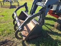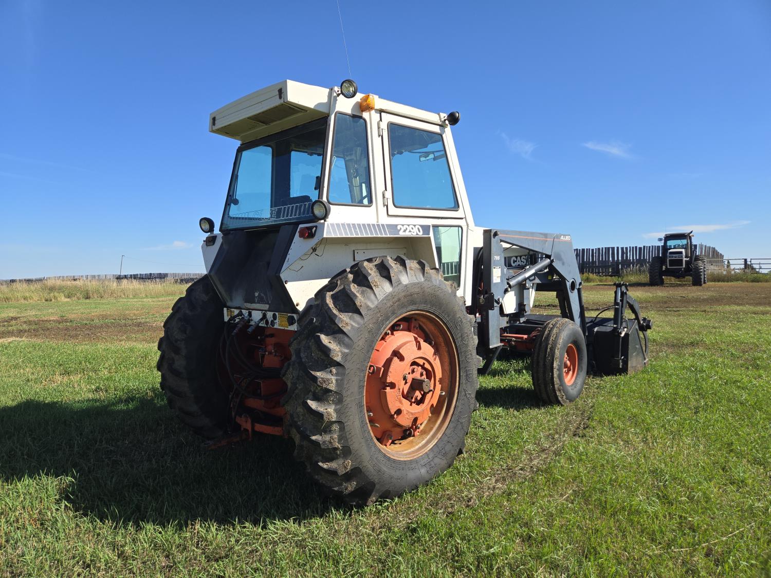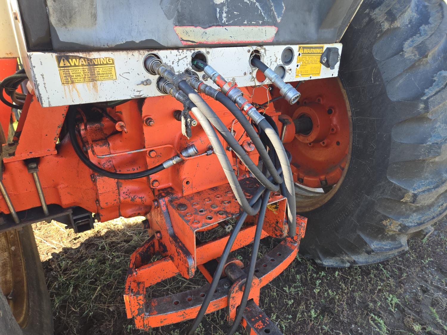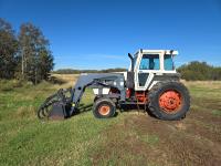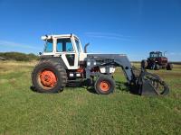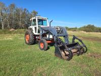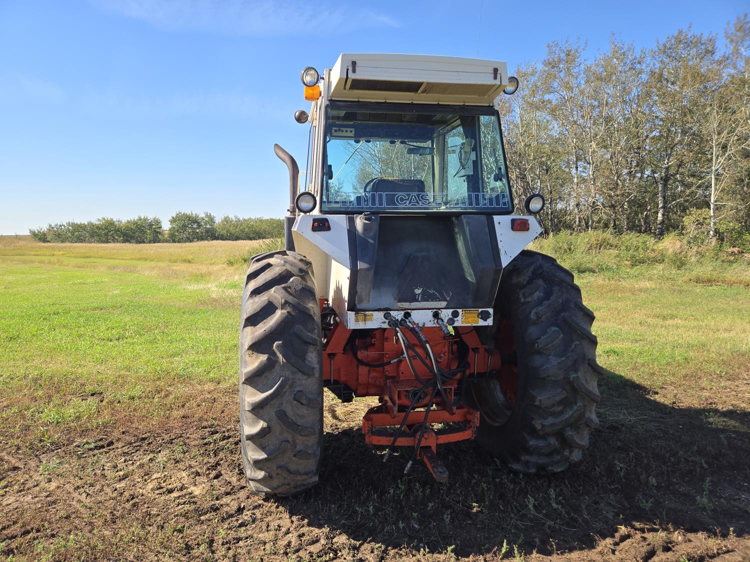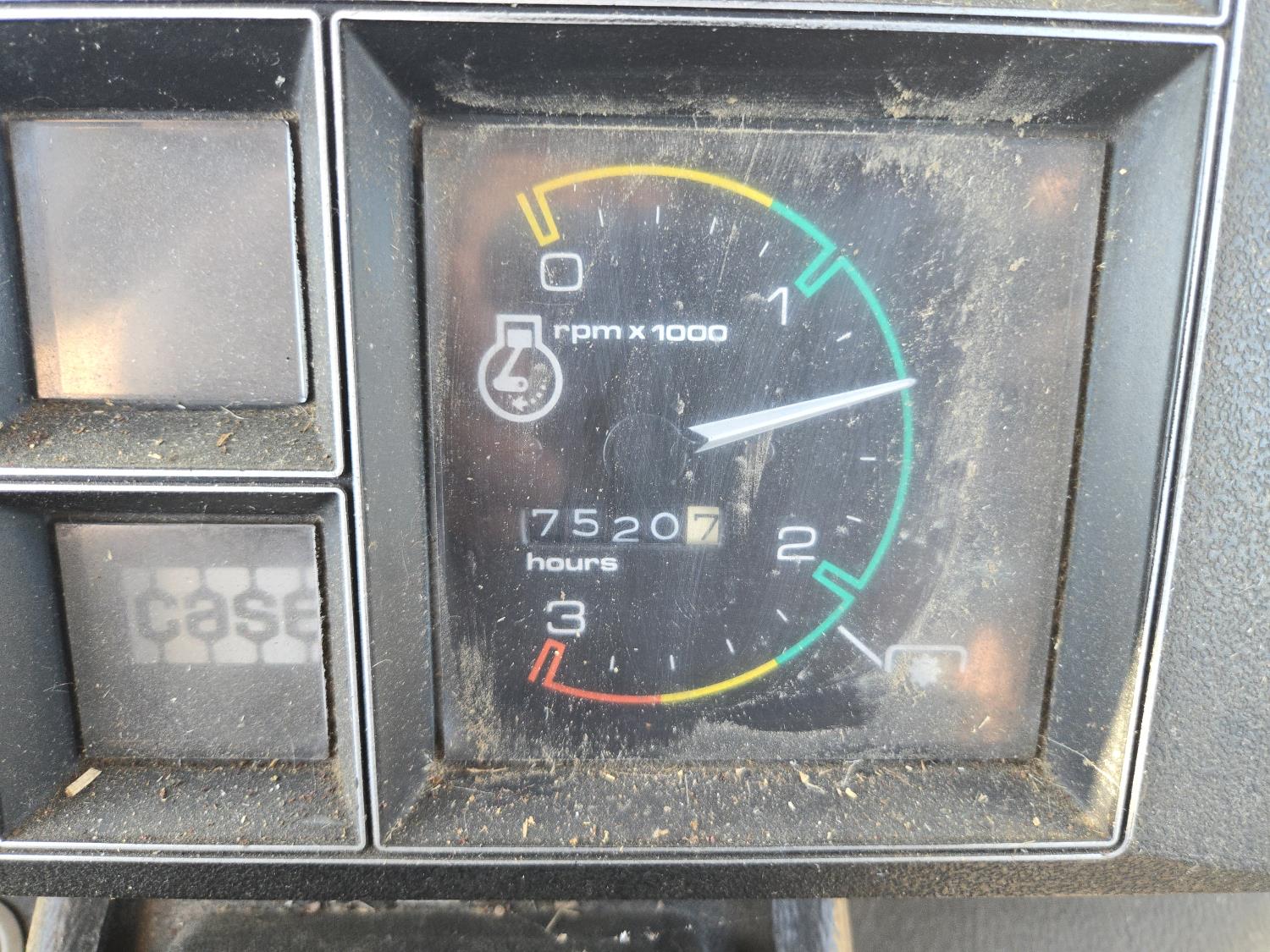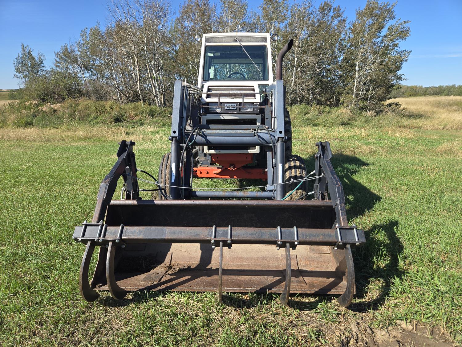 Allied 795 loader, 84 inch bucket, grapple, Case 8.3 L 6 cylinder engine, 108 PTO HP, 12 speed partial power shift transmission, cab, rear differential lock, A/C, radio, 540/1000 PTO, 3 rear hydraulic outlets, rear wheel weights, 11.00-16 front tires, 18.4-38 rear tires