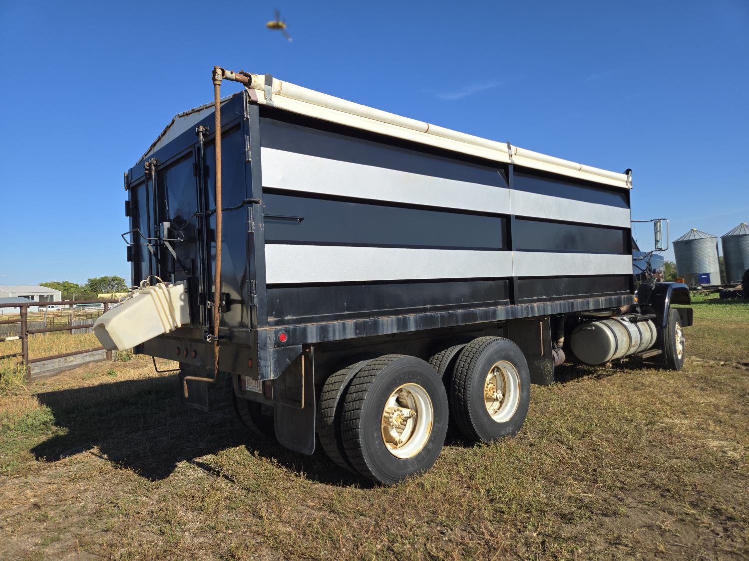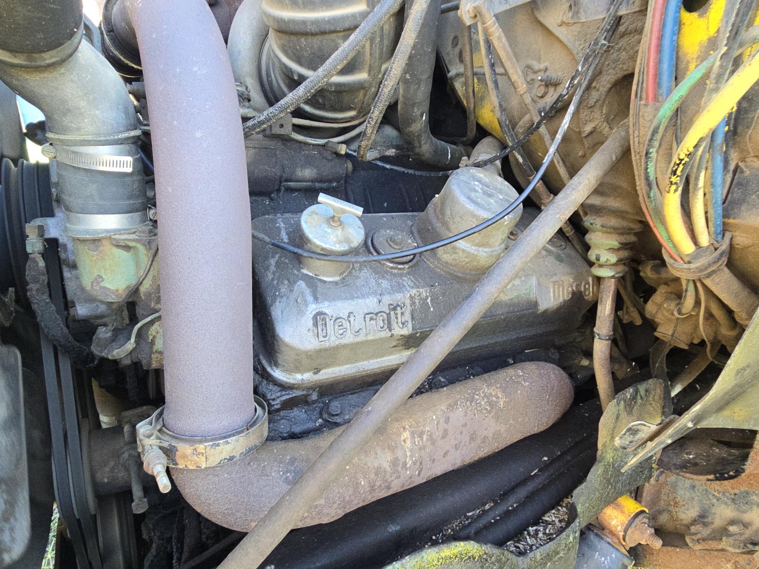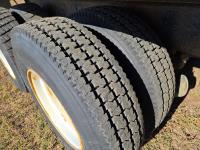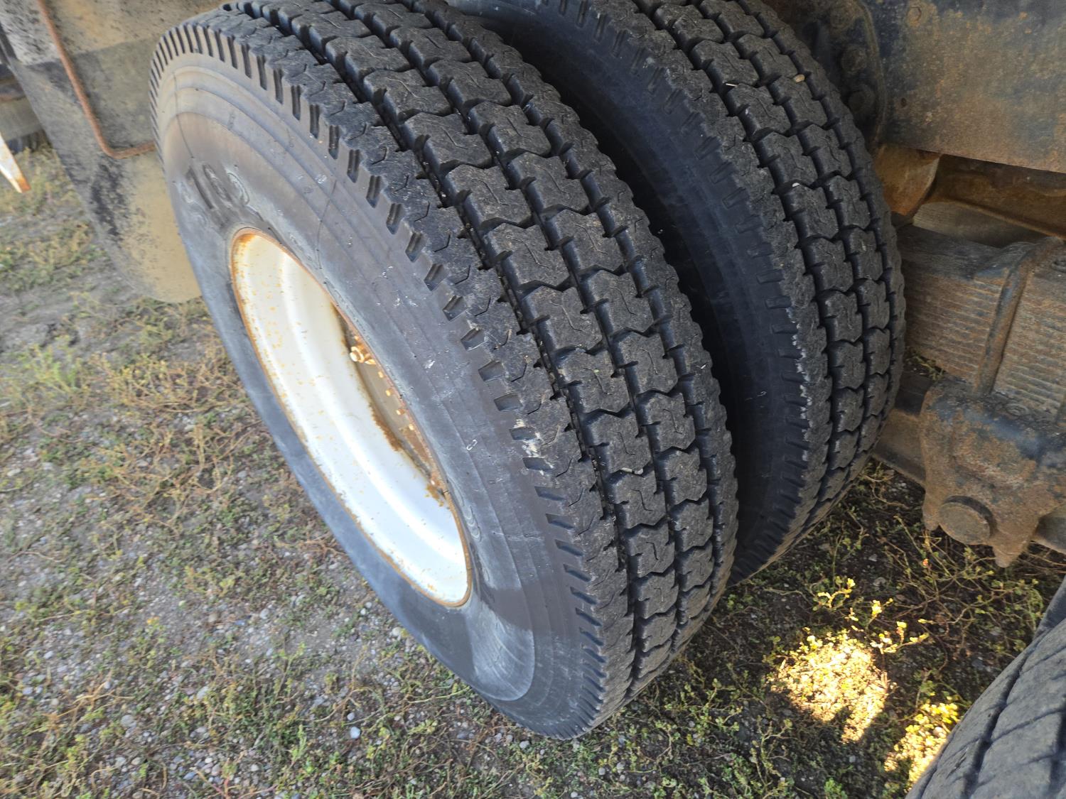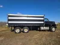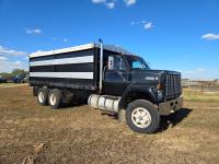 Detroit V6 diesel engine, Eaton Fuller 8 speed manual transmission, 18 Ft steel box, 5 Ft sides, hoist, roll tarp, remote rear slide and hoist controls, spring suspension, 12,000 lb front axle, 34,000 lb rear axles, 11R22.5 tires
