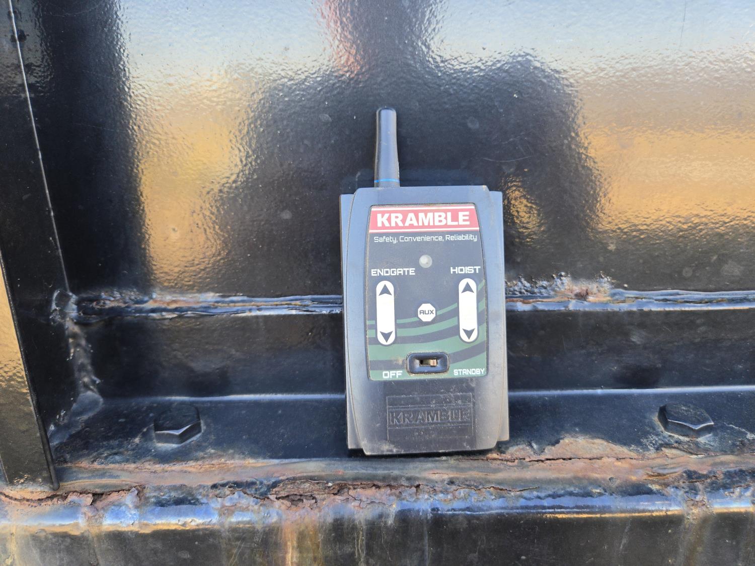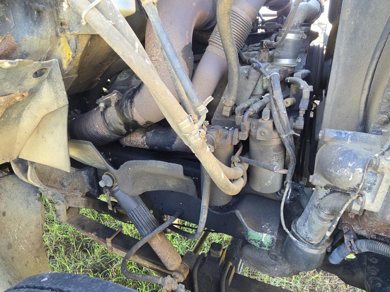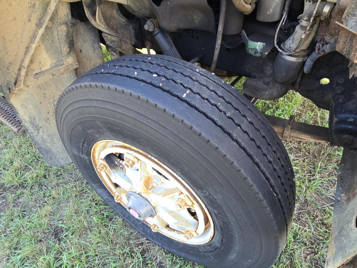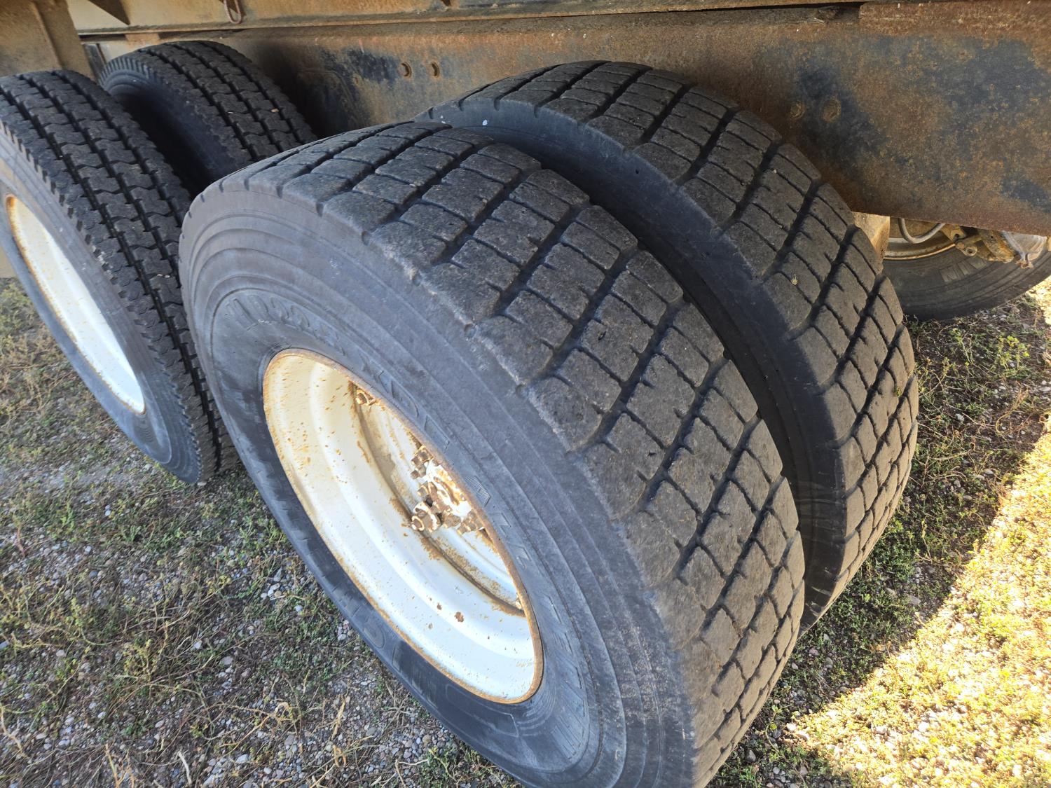 Detroit V6 diesel engine, Eaton Fuller 8 speed manual transmission, 18 Ft steel box, 5 Ft sides, hoist, roll tarp, remote rear slide and hoist controls, spring suspension, 12,000 lb front axle, 34,000 lb rear axles, 11R22.5 tires