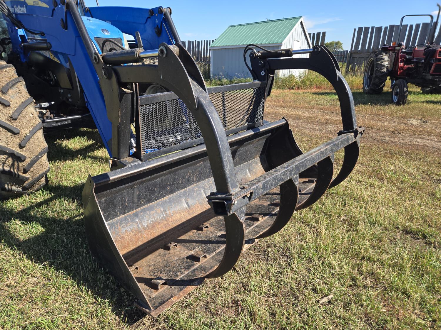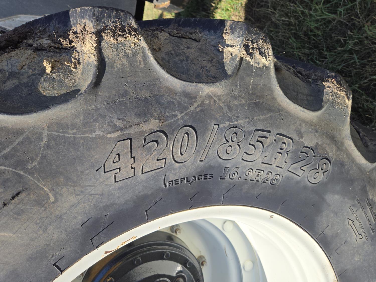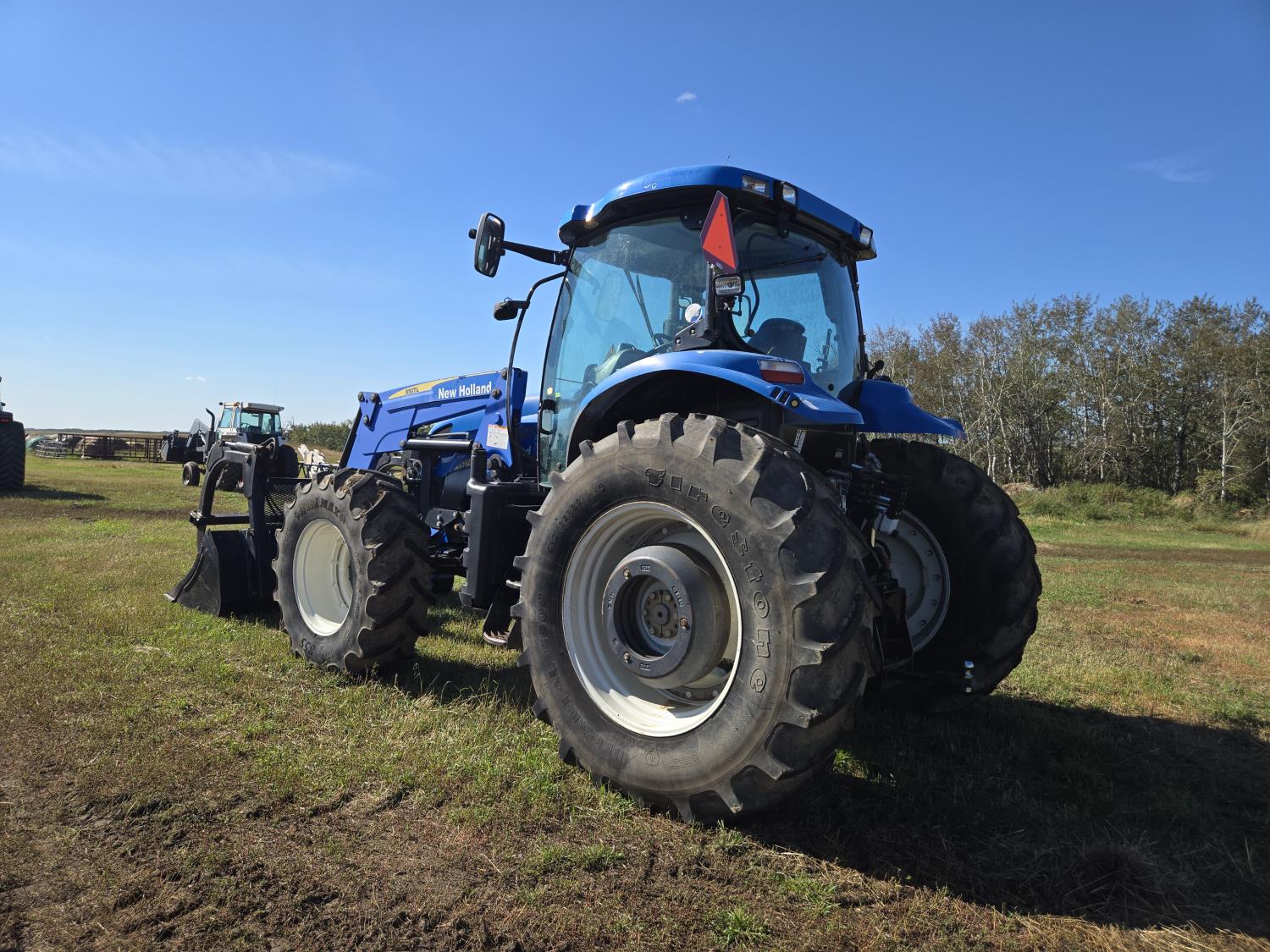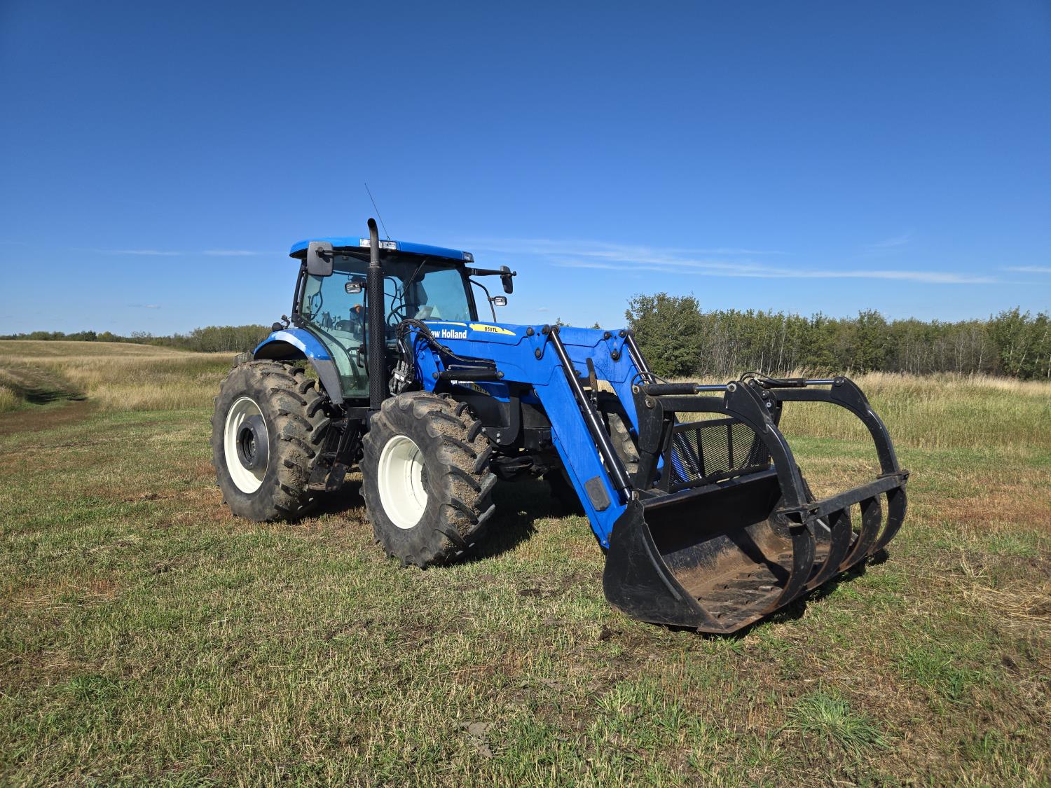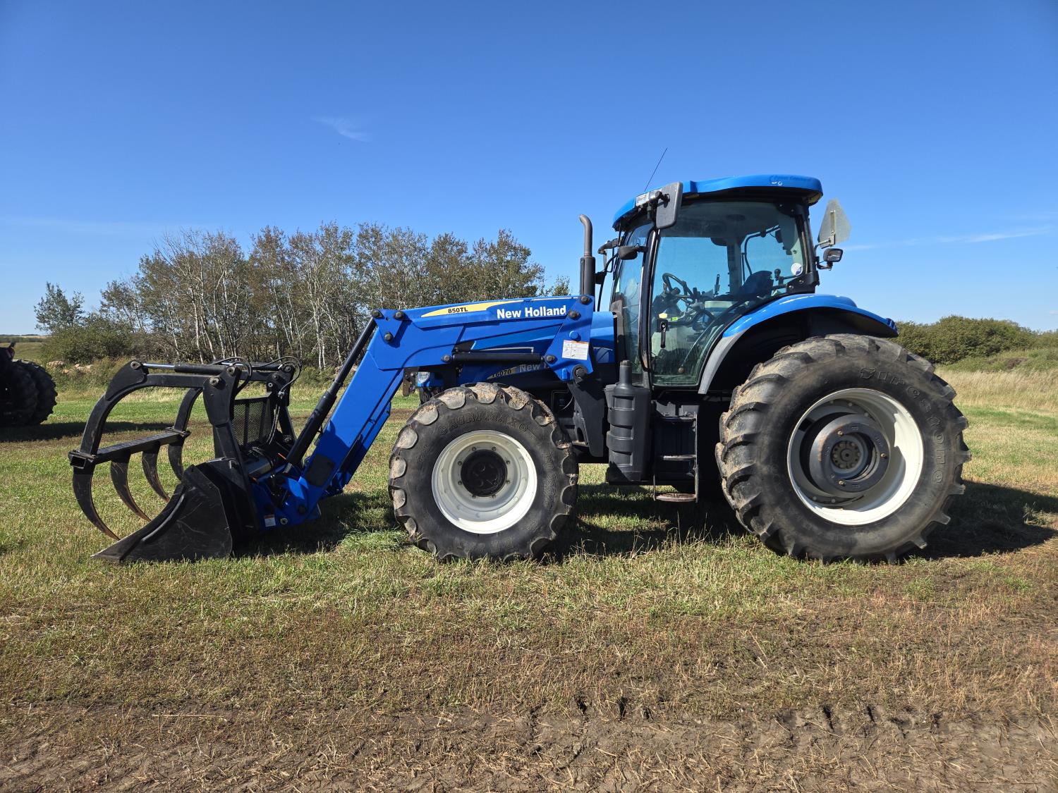 New Holland 850TL loader, Q/A, 91 inch bucket, grapple, mid mount hydraulic connection, FPT 6.7 6 cylinder 140 HP, engine, 120 PTO HP, 18 speed power shift transmission, cab, left hand reverser, joystick, A/C, radio, buddy seat, 540/1000 PTO, 4 rear hydraulic outlets, rear wheel weights, 420/85R28 front tires, 520/85R38 rear tires, NO 3 PTH Arms