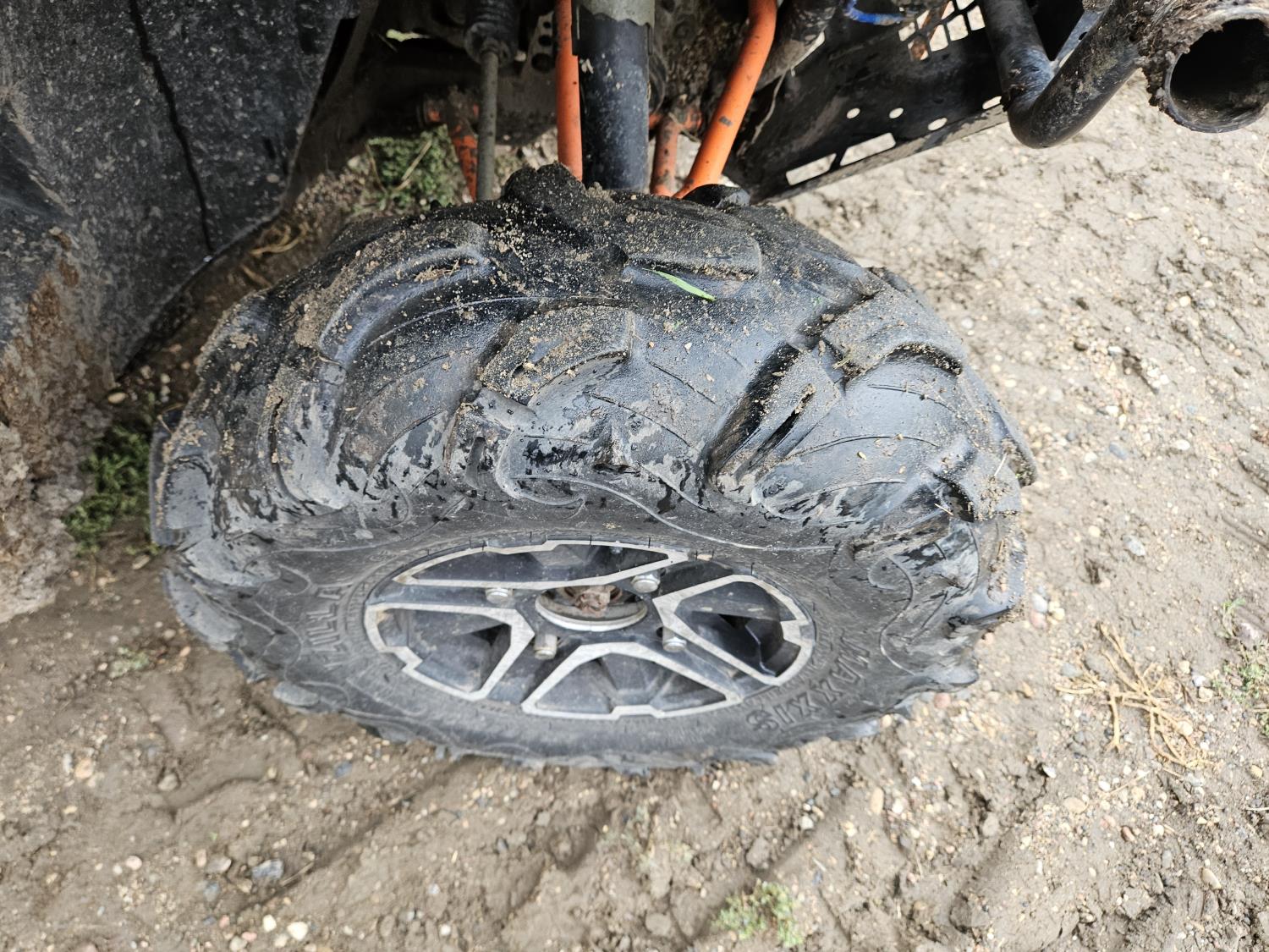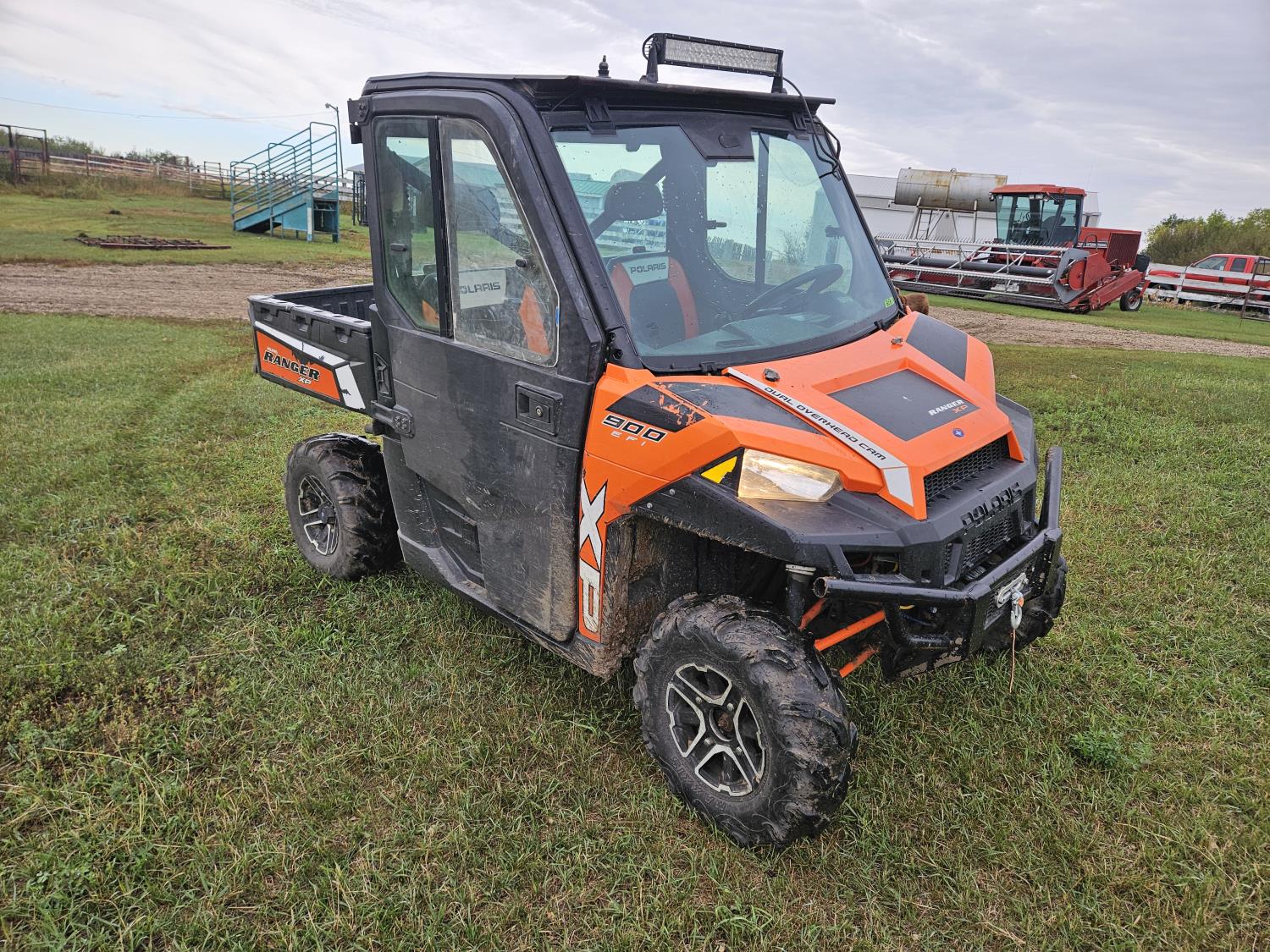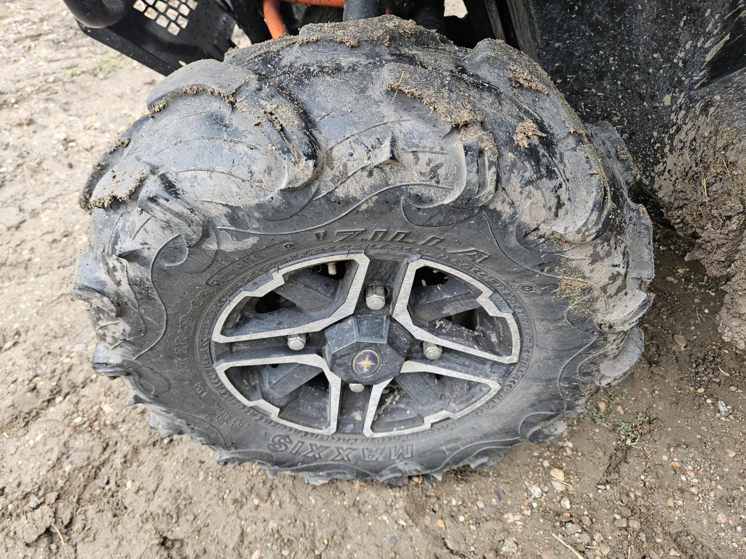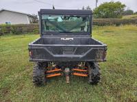 900 cc fuel injected engine, automatic transmission, Hi/Lo range, reverse, enclosed cab, A/C, heater, windshield, power steering, front winch, manual dump box, receiver hitch, 26X9X12 front tires, 12X11X12 rear tires