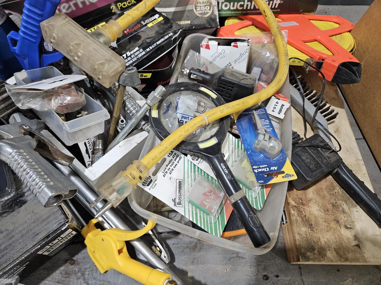 73 Shop Suppies, Temp Gun, Light Bulbs, Measuring Tape, Trailer Lights