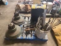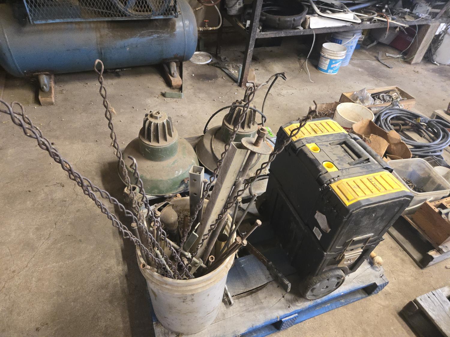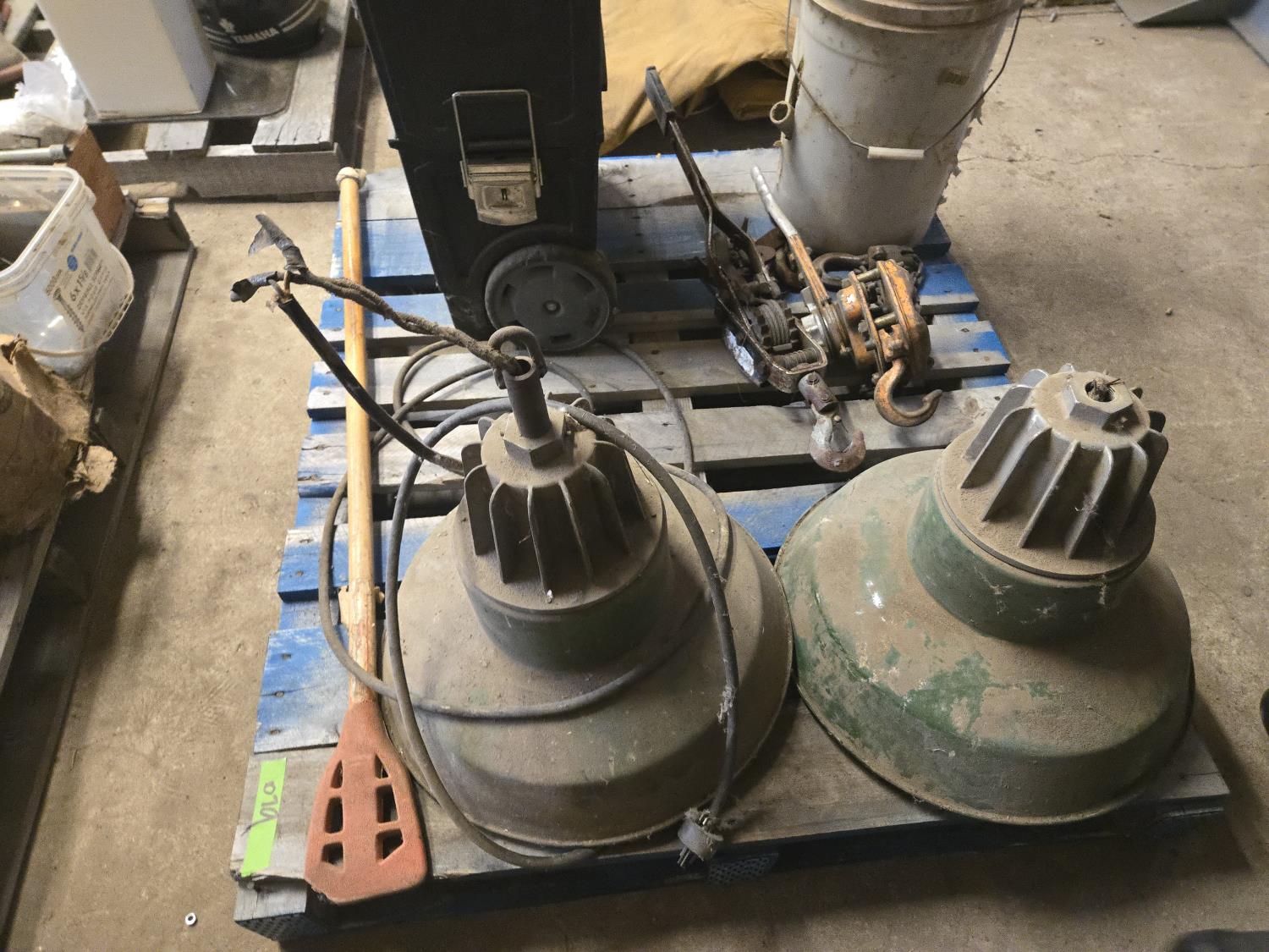 46 (2) Vintage Shop Lights, (2) Come-a-Longs, Misc Fittings, Poly Tool Box