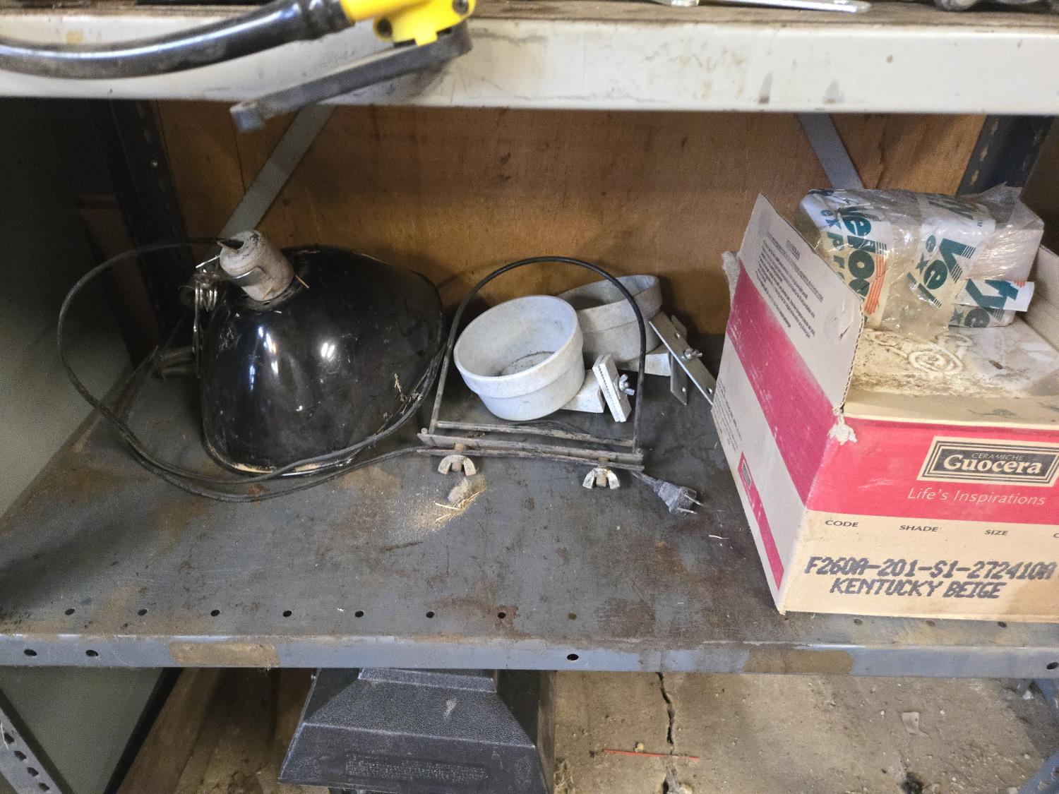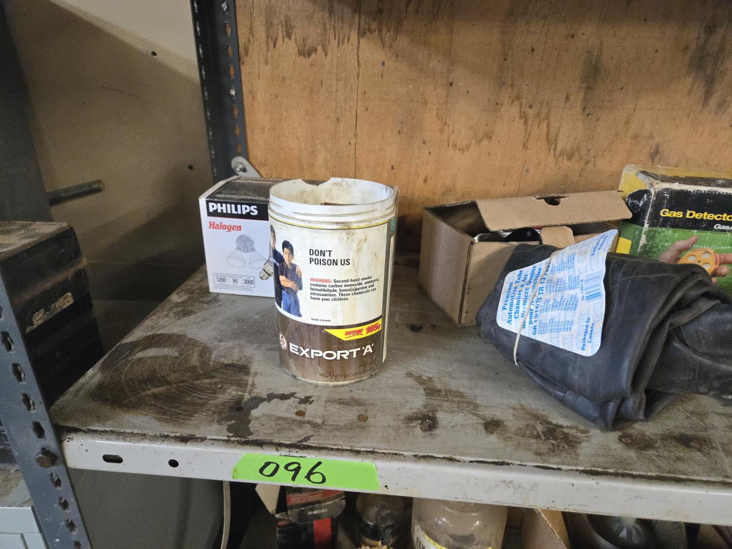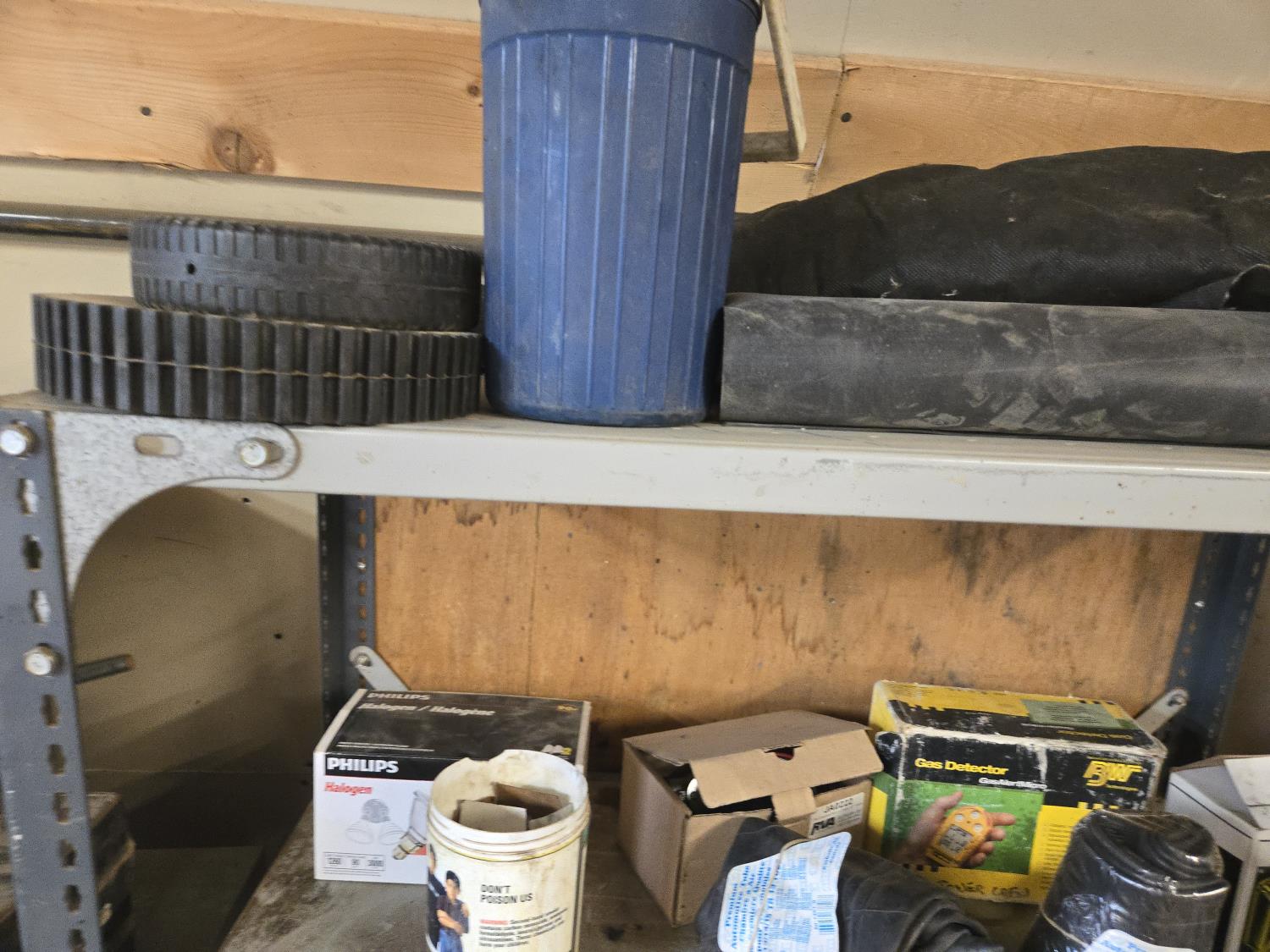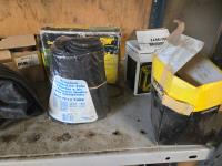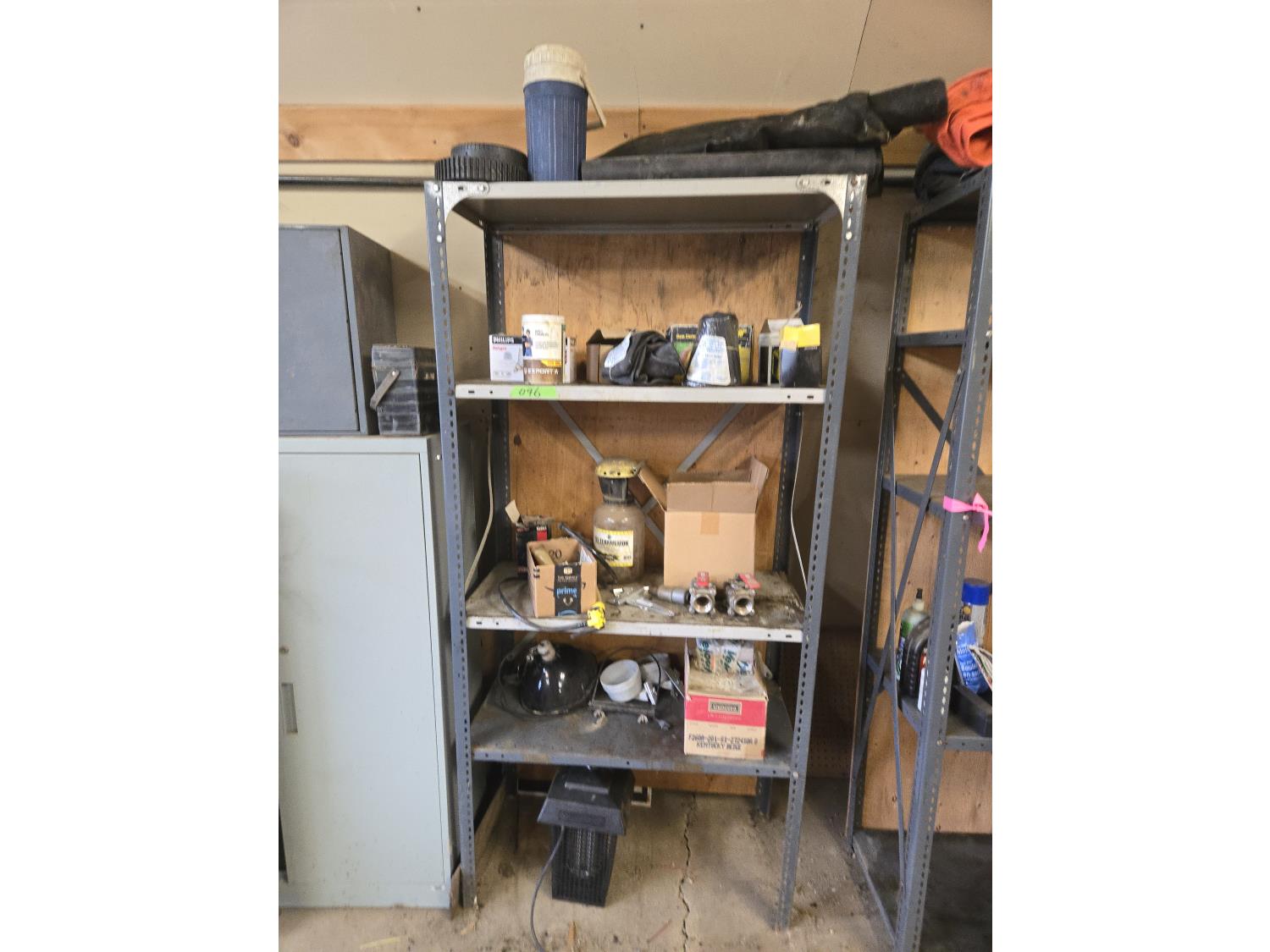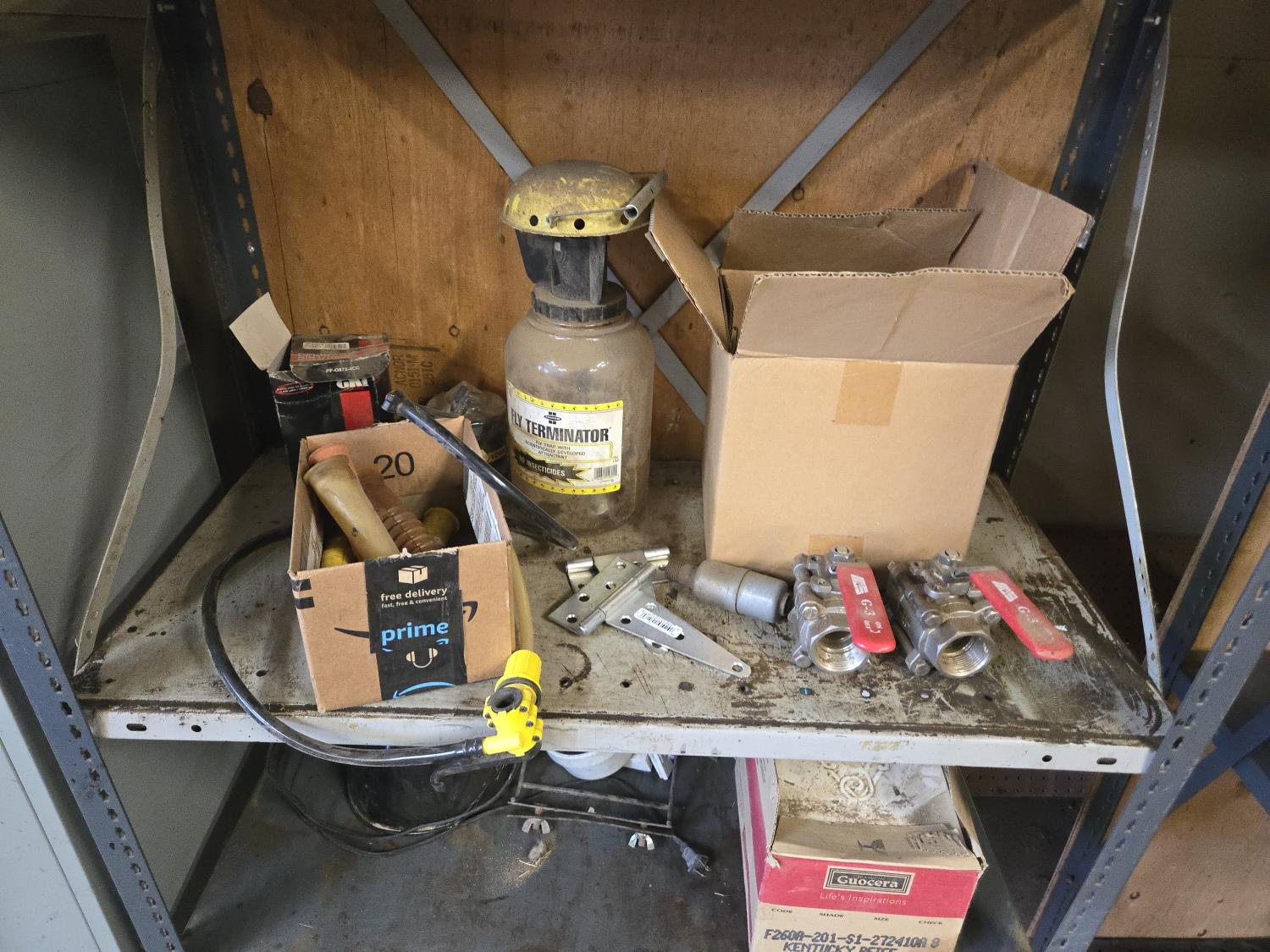 (2) John Deere fuel filters, gas detector, (2) FR15 & FR13 tubes, (2) 90w halogen bulbs, (2) i-1/4 inch valves, (2) 6 inch hinges, miscellaneous items, shelf measures 36 inch wide X 18 inch deep X 75 inch high