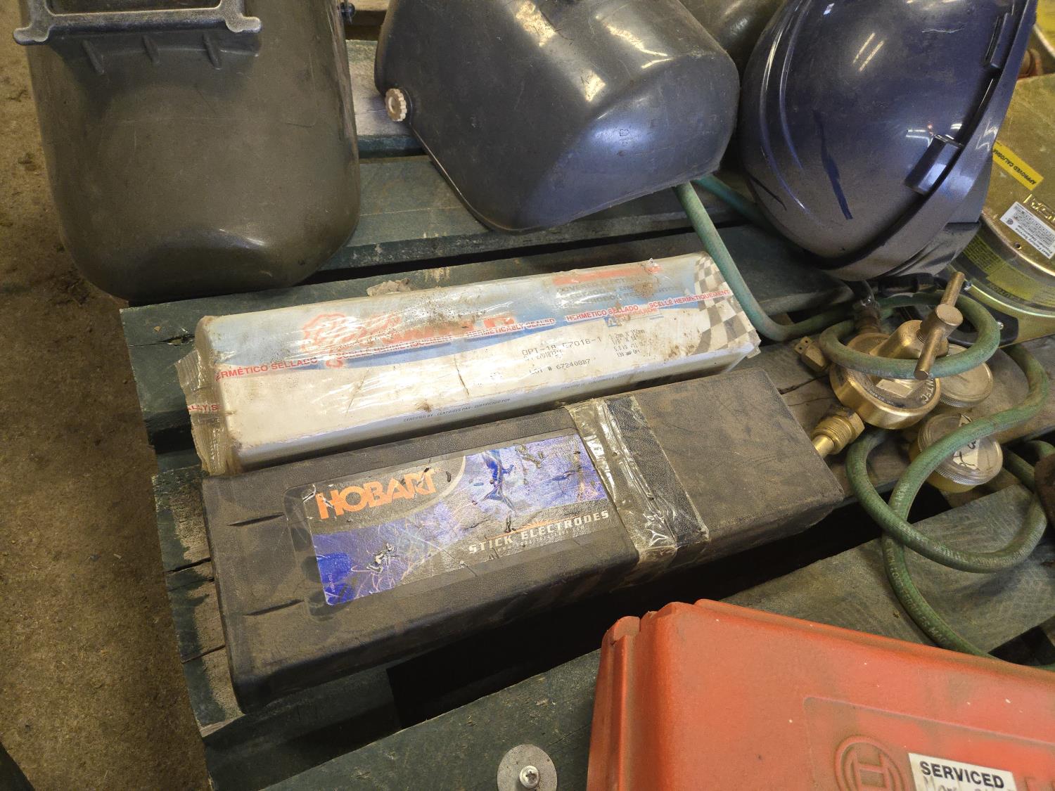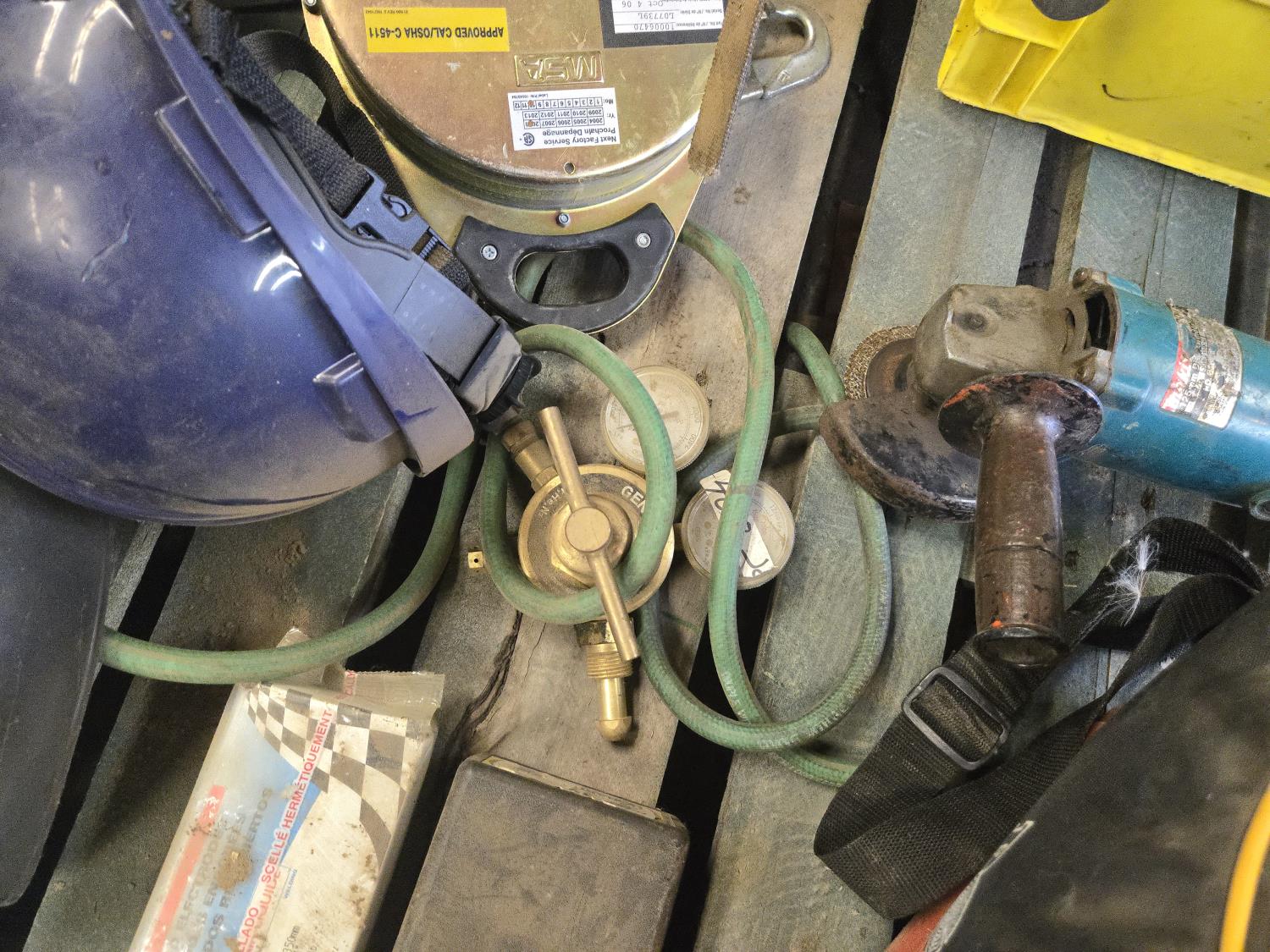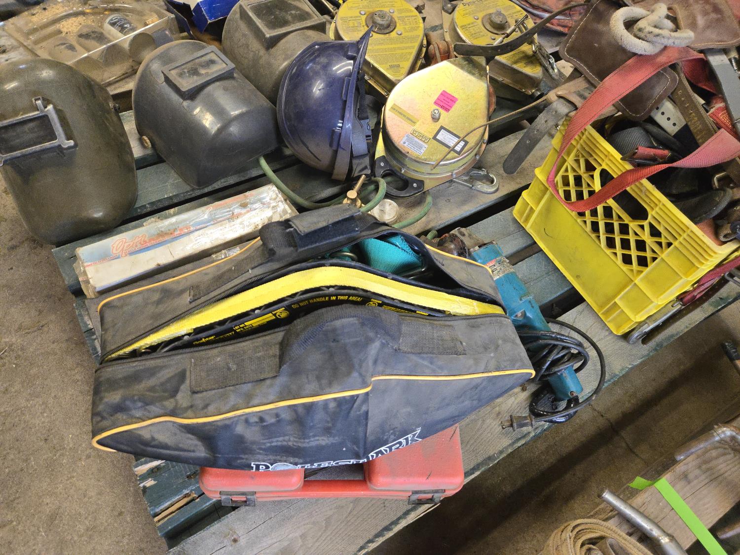 (3) Welding Helmets, (2) boxes of welding rods unopened, Bosch cordless drill with charger, (3) 30 ft Dyna Lock self retracting lanyards, Makita corded angle grinder, welding gauges, miscellaneous climbing gear