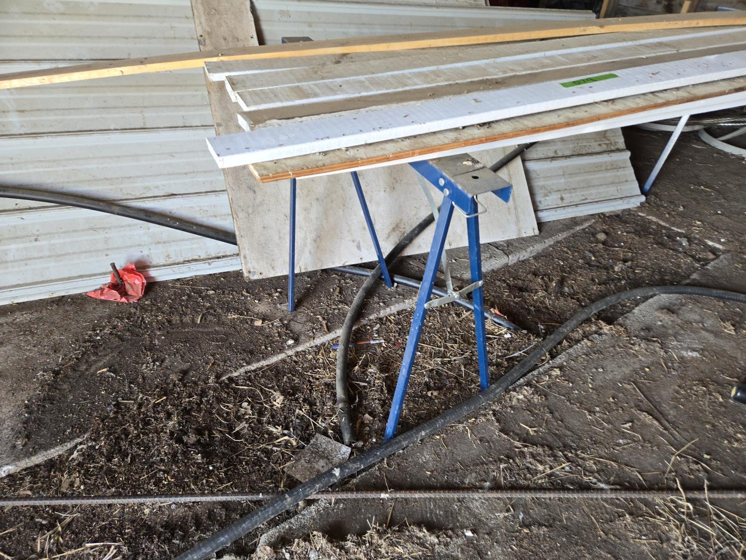 214 (18±) Sheets of Plywood, (5) Sheets V-Rib Metal, (13) 1X4 Boards & Two Folding Saw Horses