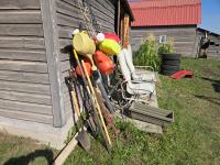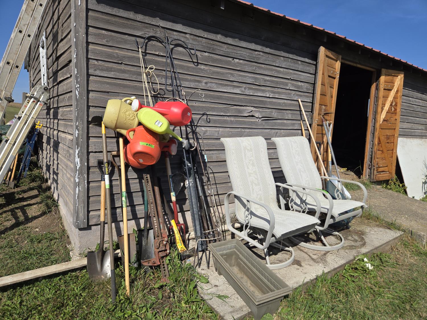planter hangers, watering cans, jackall, spades, rake, hoes, shovel, Mics items