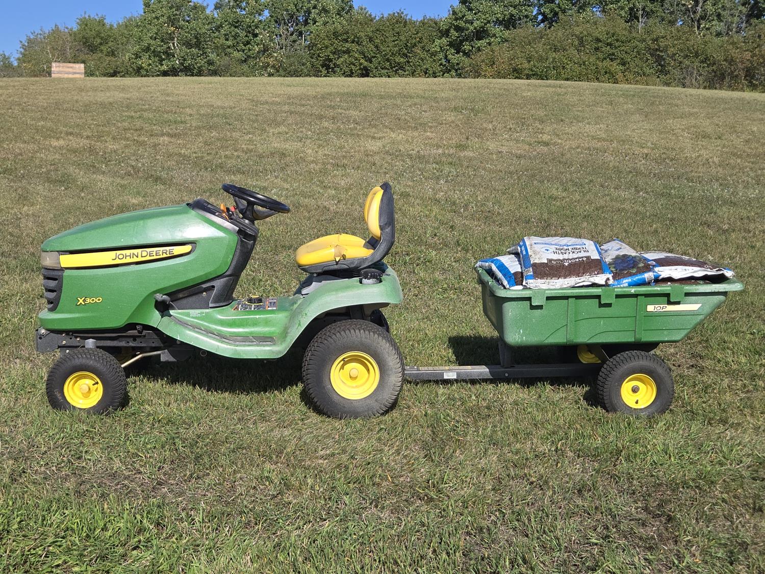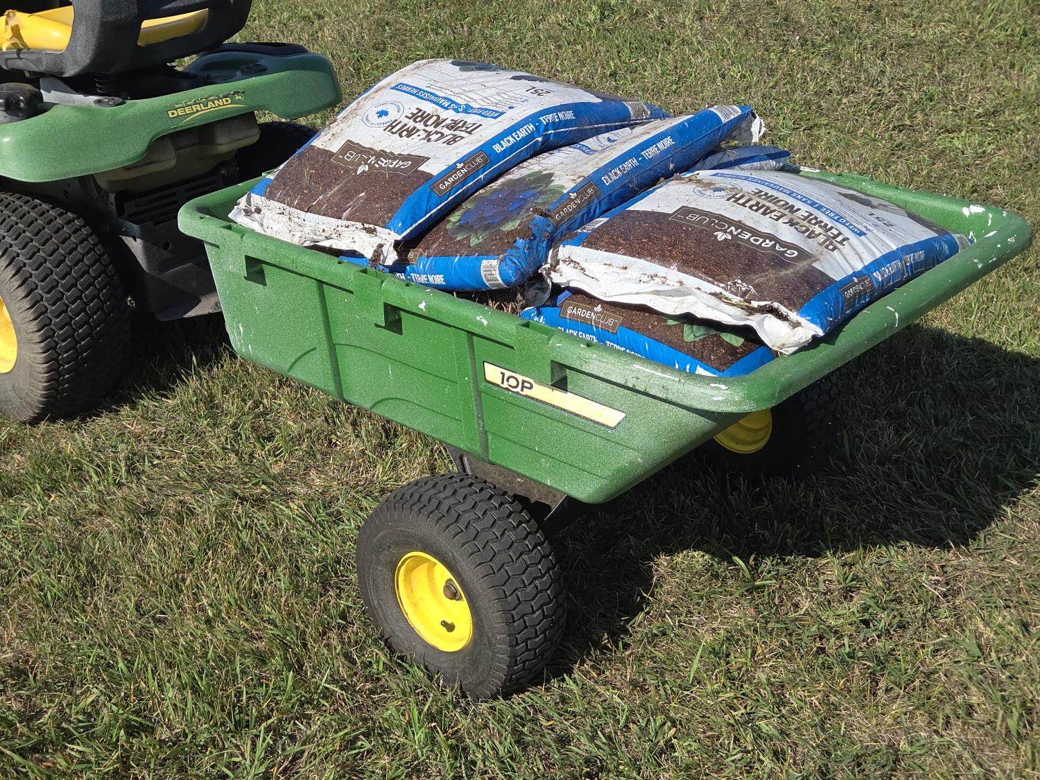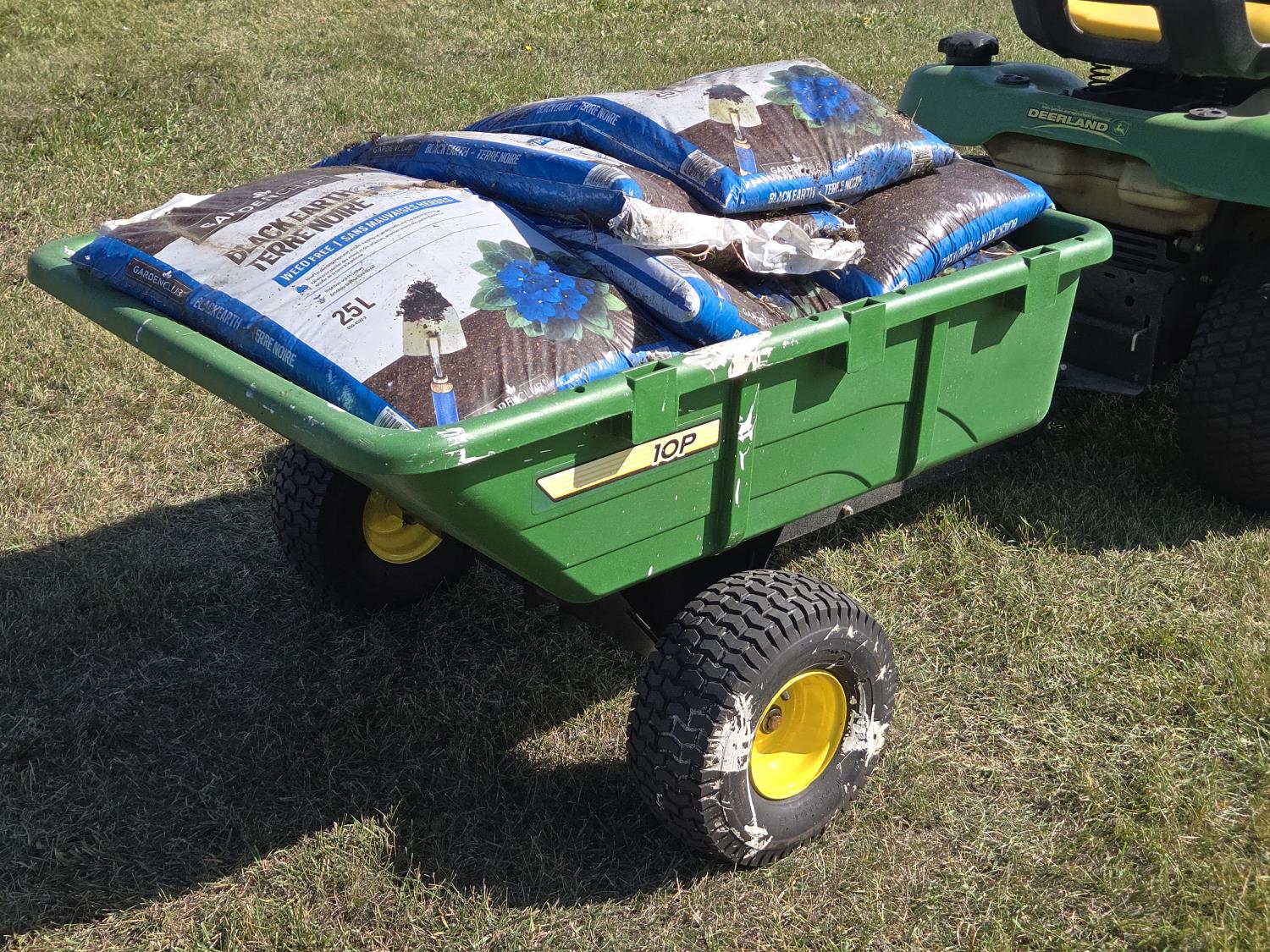 Kawasaki 17 HP twin cylinder engine, hydro transmission, John Deere 10P garden trailer with 12 bags of black dirt, NOTE: this tractor does not have a mower deck