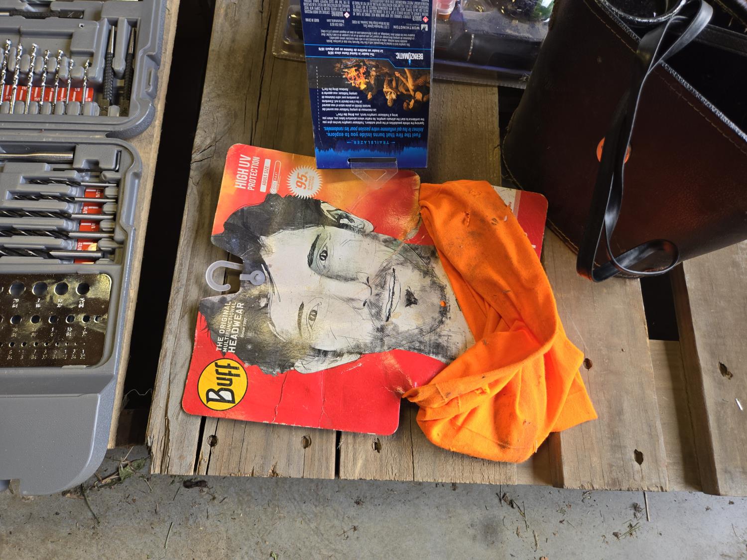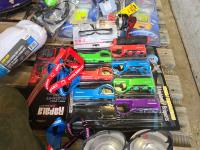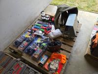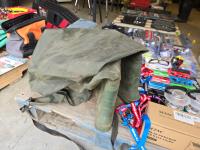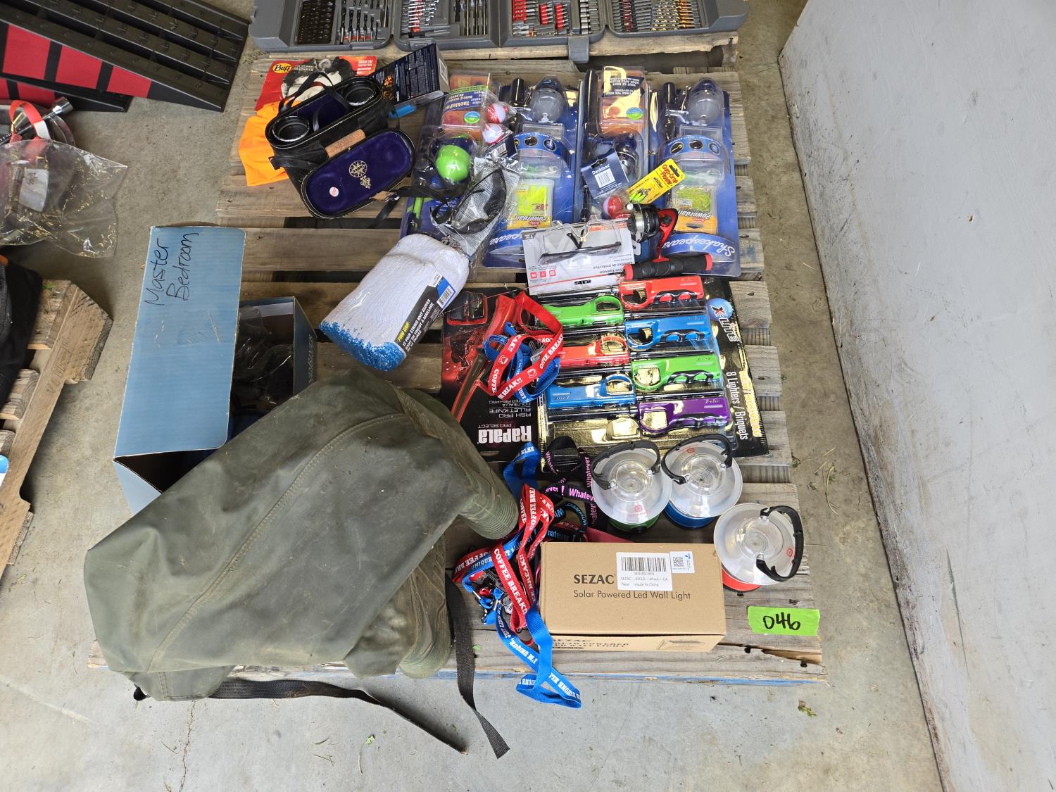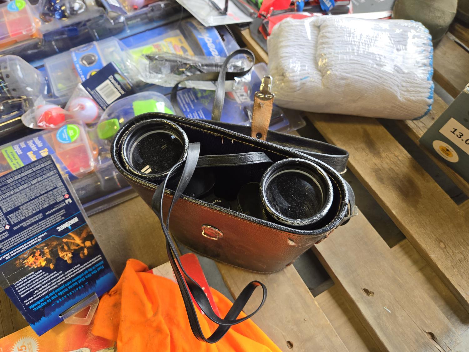 (7) lighters, pair of size 12 waders, Tasco 10X50 binoculars, Rapala fishing knife, (12) string unit gloves, campfire torch, miscellaneous tackle and other items mostly unused