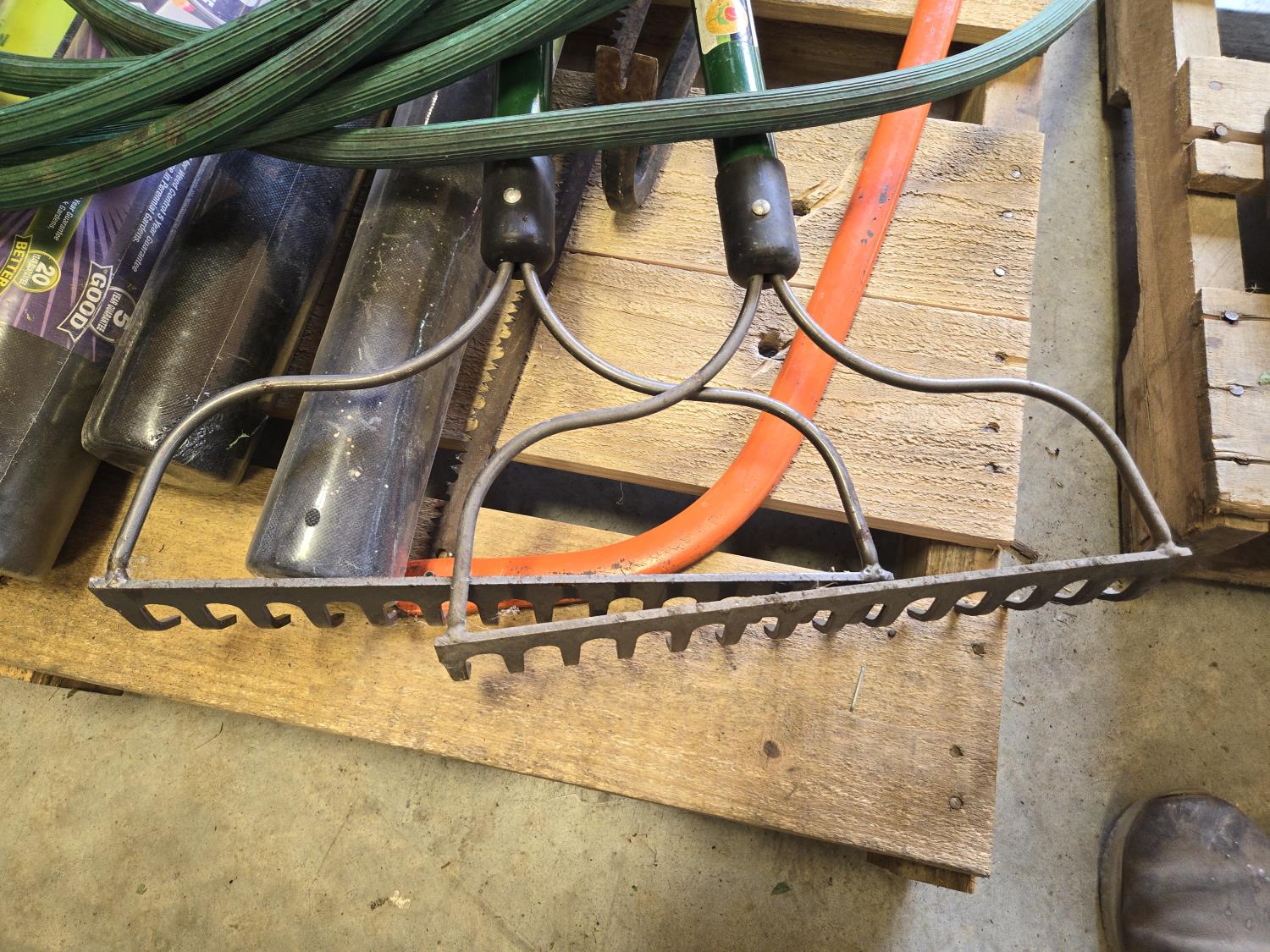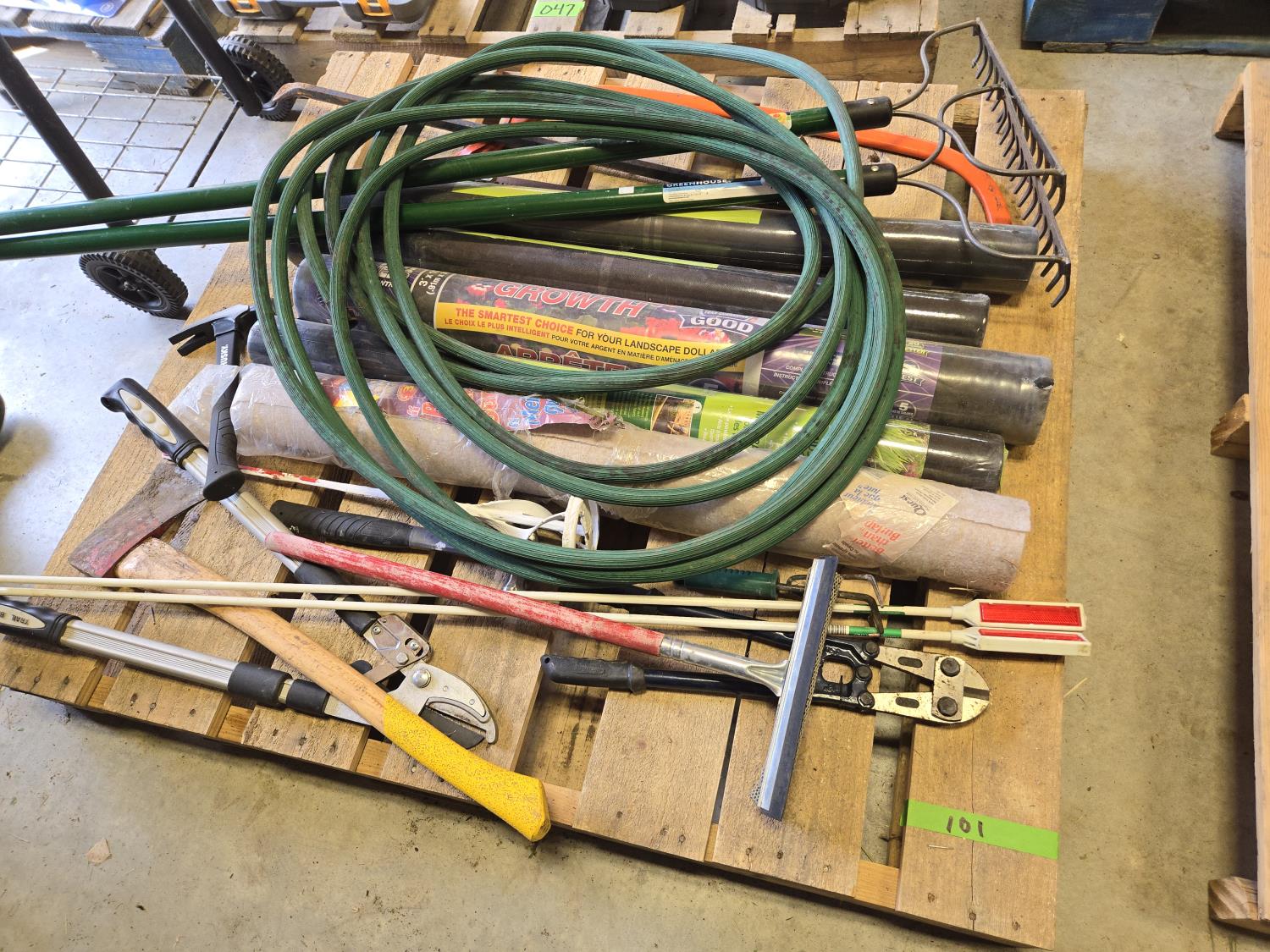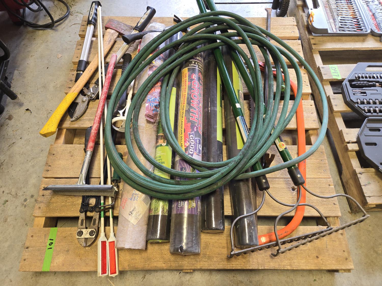 (2) Rakes, bolt cutters, (2) hammers, cross cut saw, heavy duty loopers, qty of unused landscape fabric, misc items