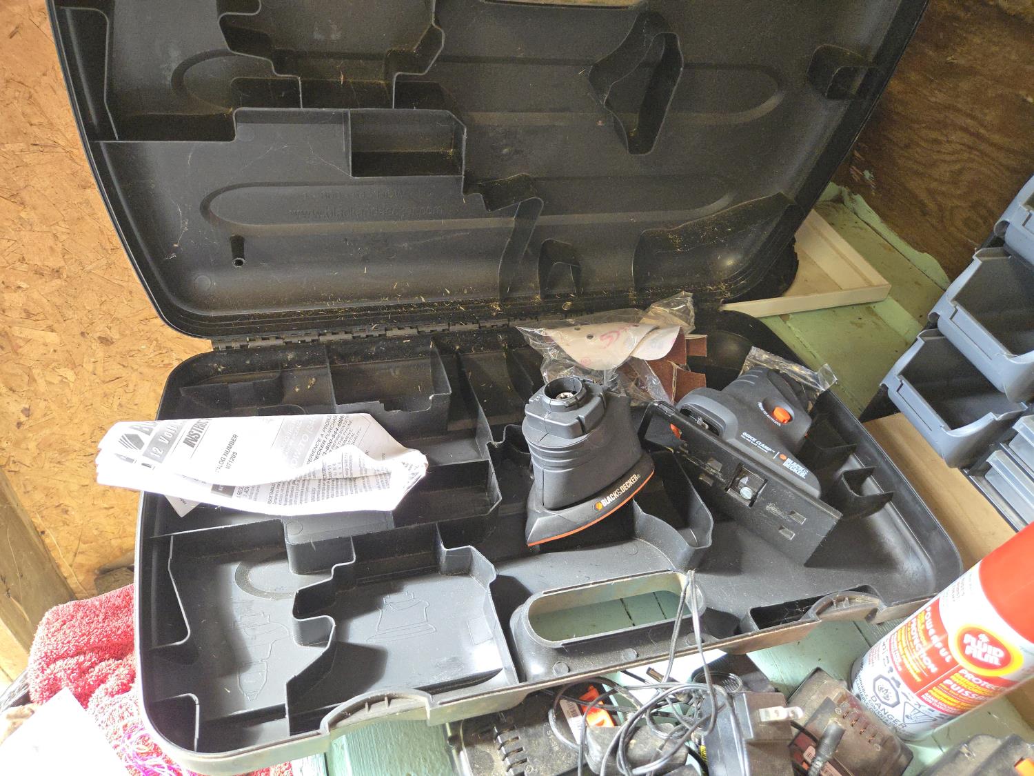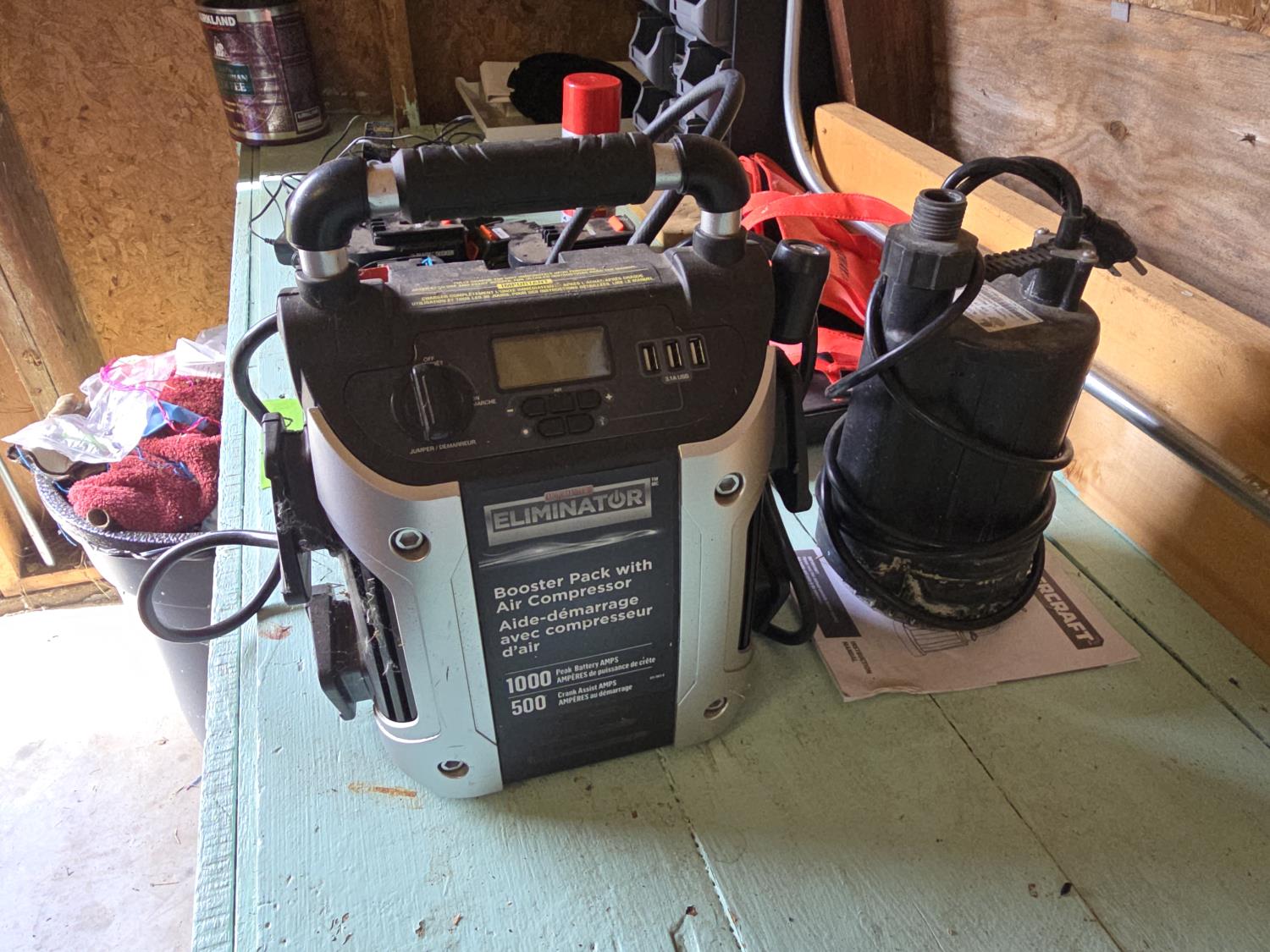 Eliminator booster pack with air compressor, Mastercraft utility pump, socket set, various batteries, storage bin with contents, Black & Decker cordless tools