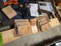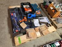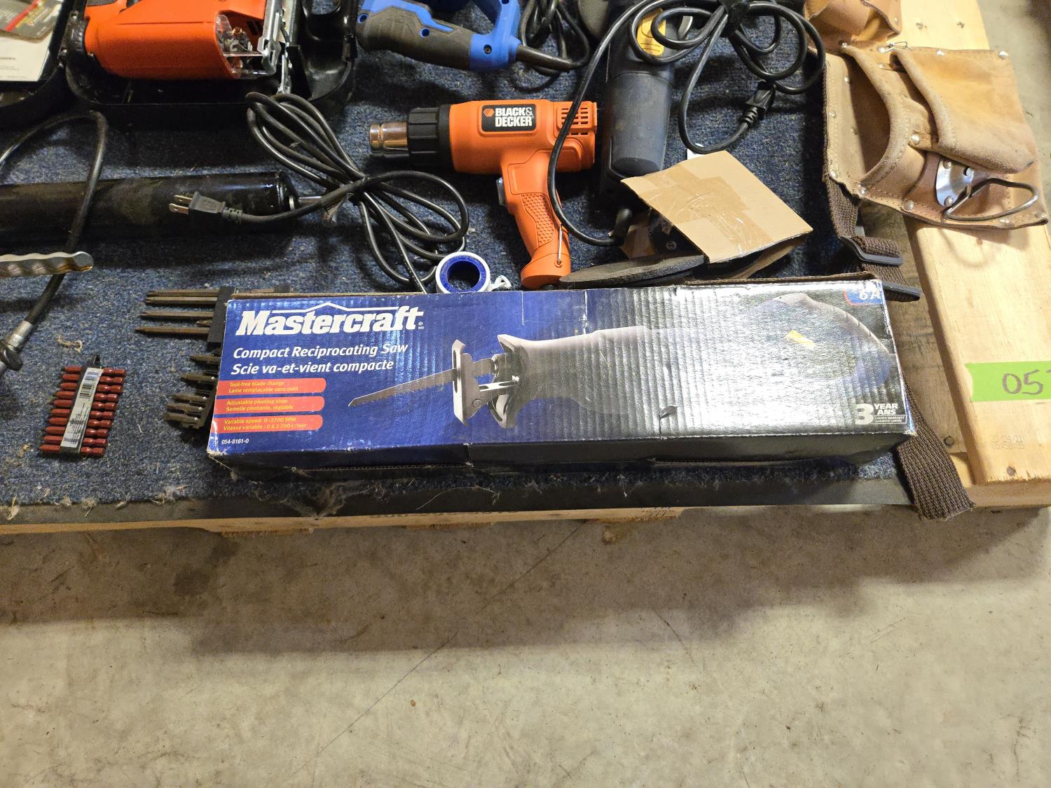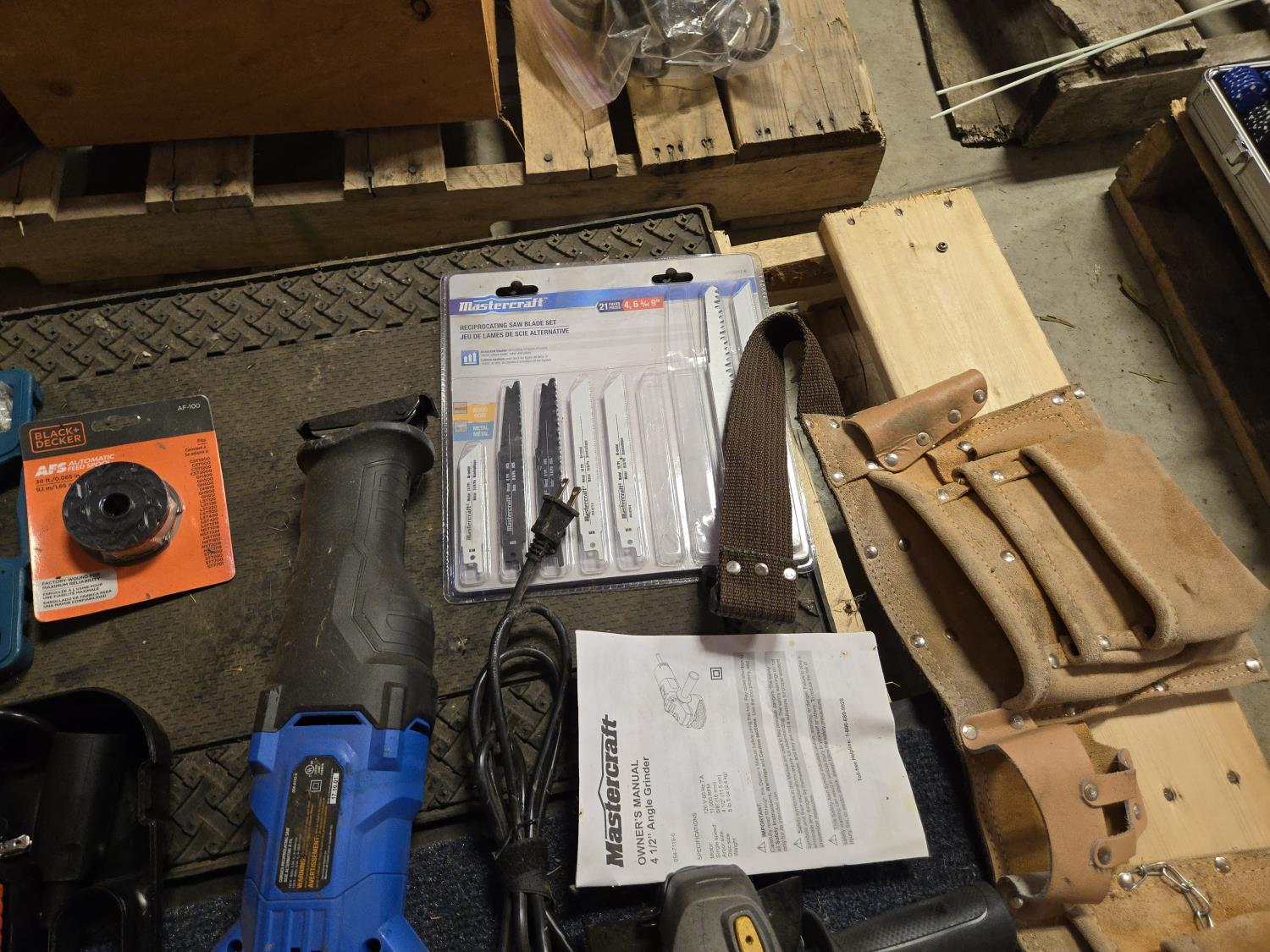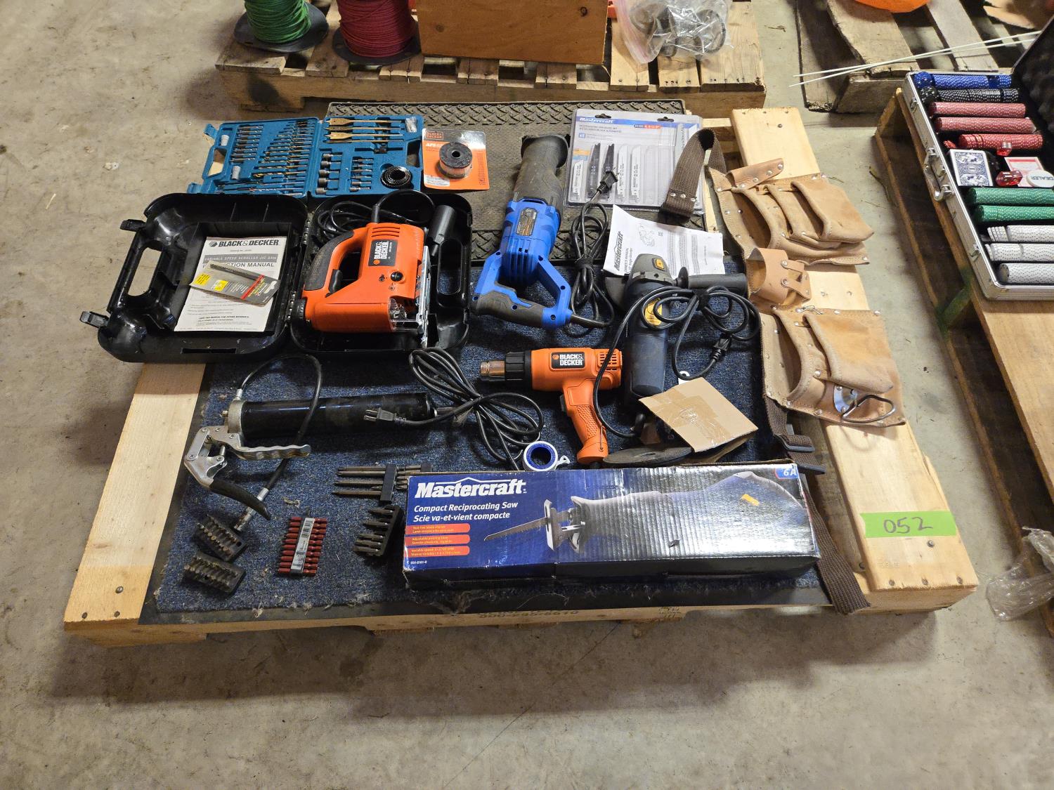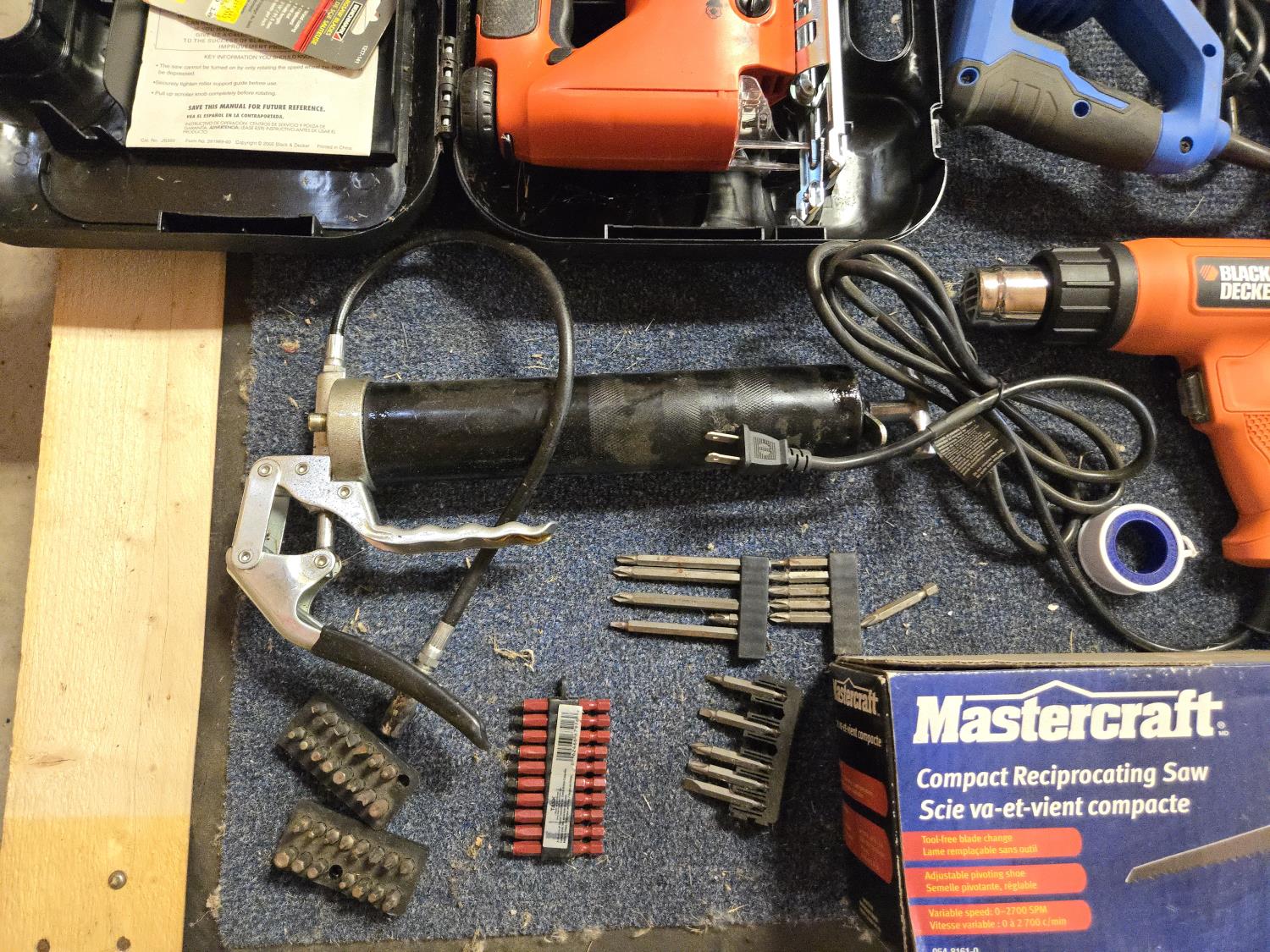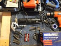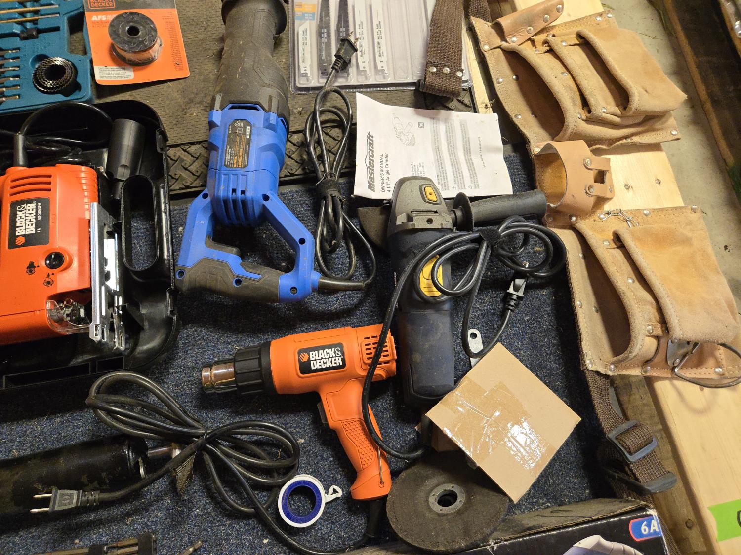 Altrade drill bit set, B&D electric jigsaw, grease gun, (2) Mastercraft reciprocating saws, B&D heat gun, leather tool belt, Mastercraft angle grinder