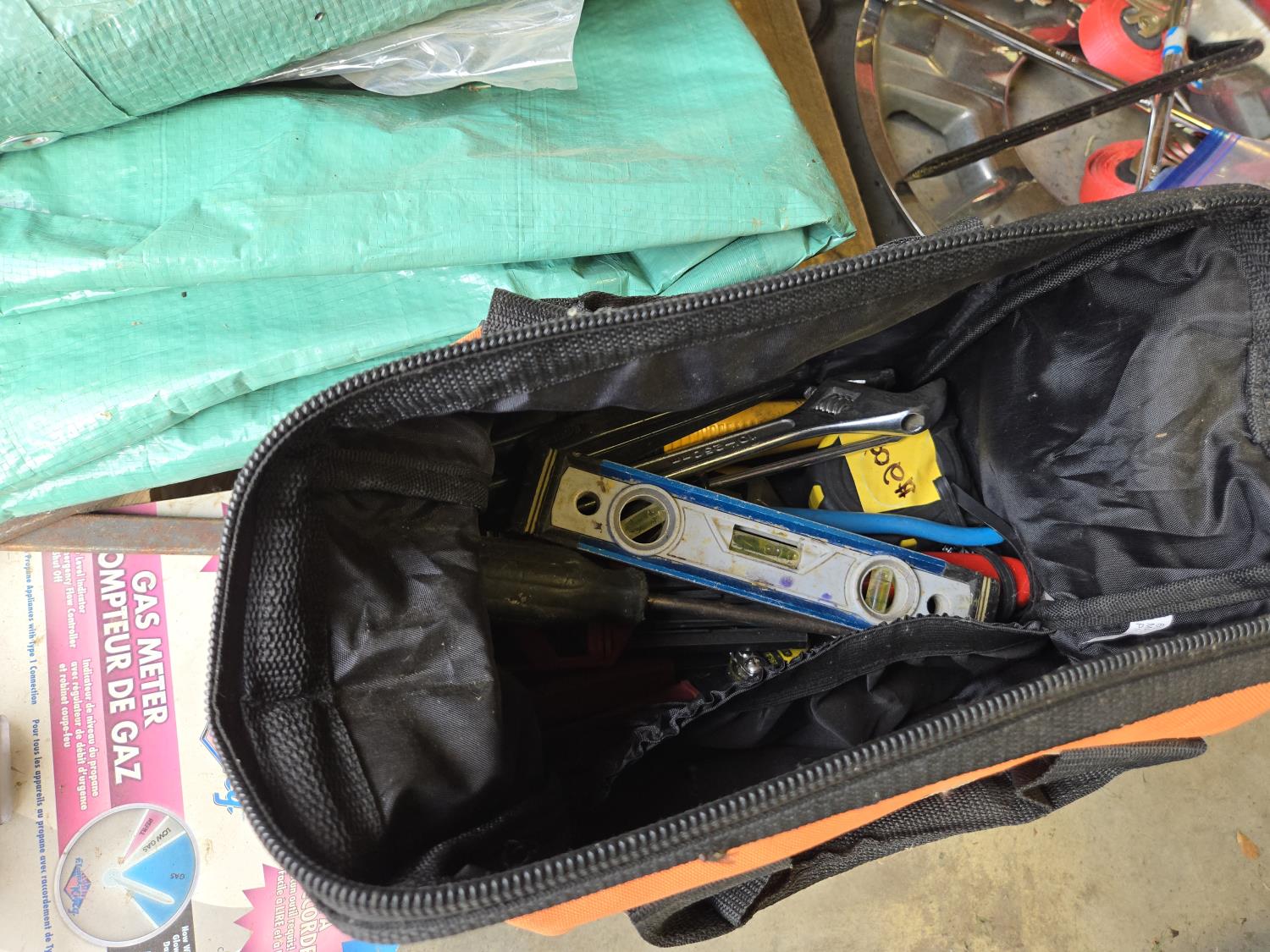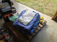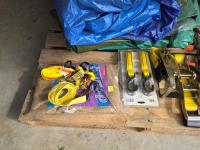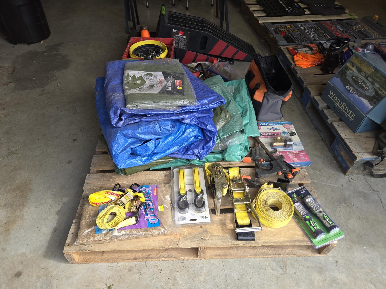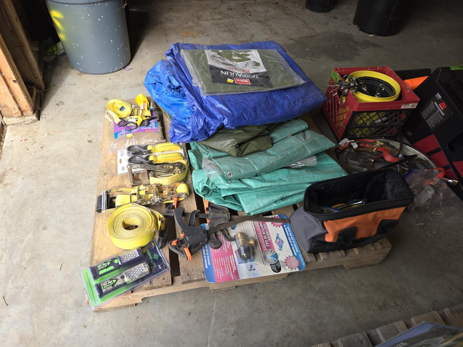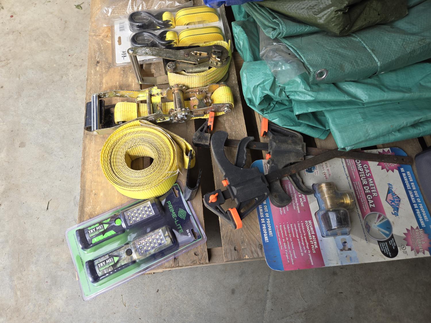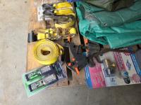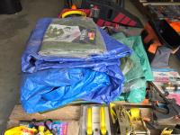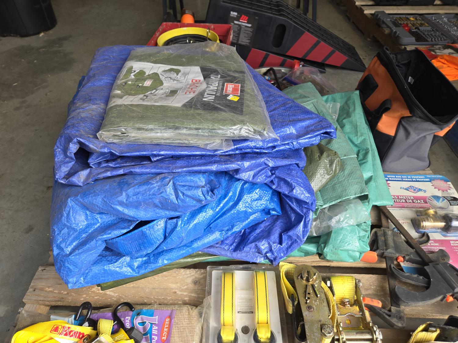 Qty of poly tarps, 40 inch X 9.8 ft Burlap unused, cargo straps, miscellaneous tools