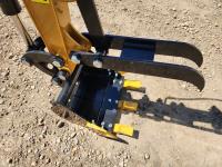 Enclosed cab, gas engine, 17 inch dig bucket, manual coupler, manual thumb, 31 inch stick, backfill blade, 7 inch rubber tracks
