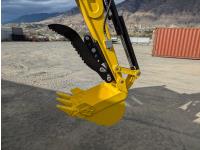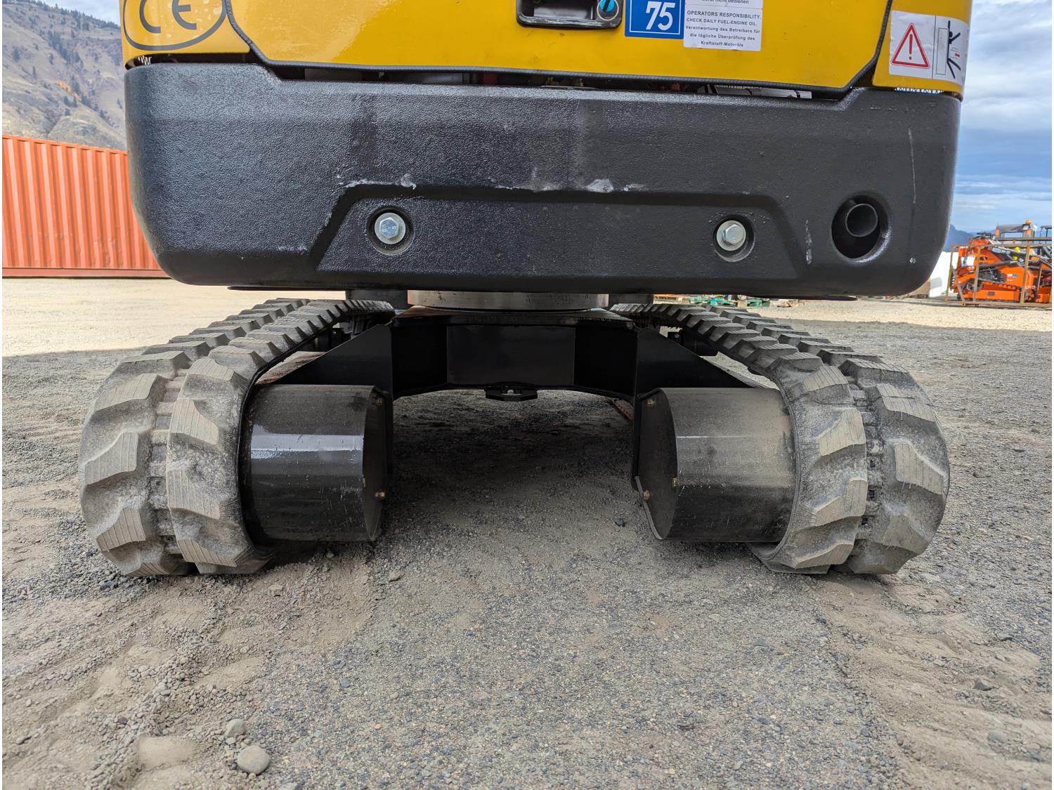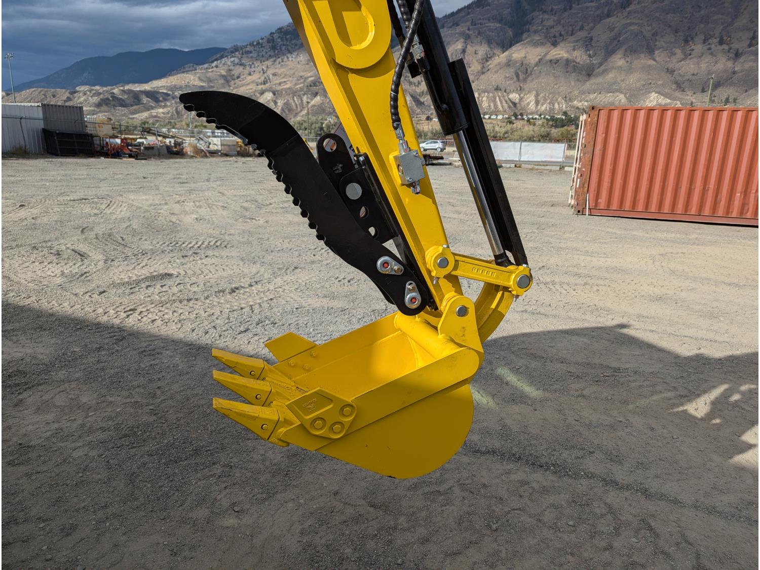 Enclosed cab, 25hp gas engine, 15 inch dig bucket, manual thumb, 1 auxiliary hydraulics, swing boom, backfill blade, rubber tracks, 9 inch track pads