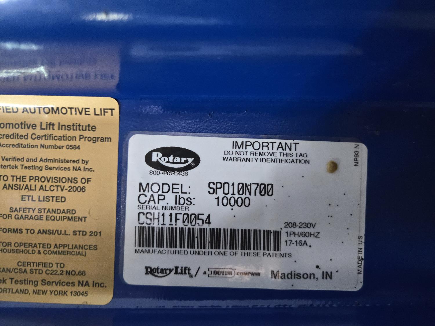 885 Rotary Lift SP010N700 2 Post 10,000 lb Vehicle Lift
