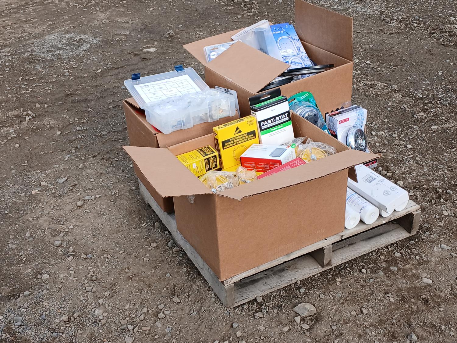 (2) wireless outdoor sensors, (1) HVAC wiring extender, (12) grippers, (1)-4 inch pneumatic plug, (2) -4 inch test ball plugs, (5) clean seal pneumatic plugs, (1)-3 inch test ball plug, (1)-1.25 inch test ball plug, (2)-2 inch extension hose, (3)-2 inch x 22 ft ratchet straps, (2) pk HDX household melt blown filters, (2) sediment filter cartridges, (1) American Plumber 3/4 inch filter wrench, (1) ISO9001Standard Faucet, (5) flanges, (4) NSF Face, (1) NSF bumper, (1) NSF hose grip, (1) Delta Chrome finish shower head, (1) peerless chrome finish hand shower, (4) Delta chrome finish spray shower head, (6) pk aluminum tubing, (4) quick ring floor repair plates, 2.25 inch x 25 ft PEX tubing, (110 straight & (3) angle valves, (1) swivel valve goose neck, (3) soap dispensers, (4) Moen Tap handles, (4) Tap Fixture installation kits, (21) 2-handle faucet replacement cartridges, (1) case w/multiple fixture screws/ washers/ replacement rings etc.