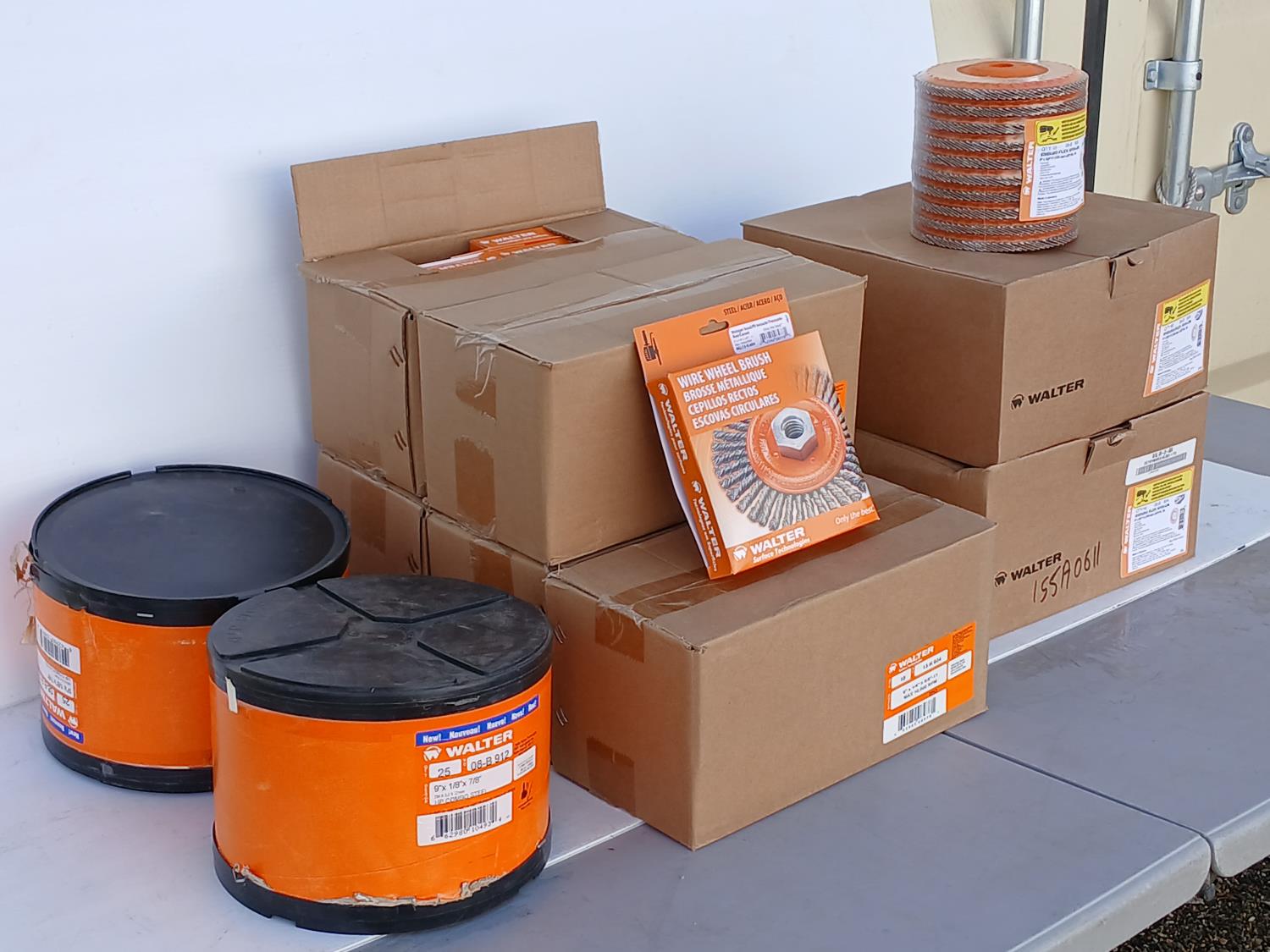 (80) Enduro Flex Spin on Flap discs (6 inch x5/8 inch ), (50) Walter Wire wheel stringer bead brush (6 inch x1/4 inch x5/8 inch ), (50) Walter Depressed center combo wheels (9 inch x 1/8 inch x 7/8 inch ).