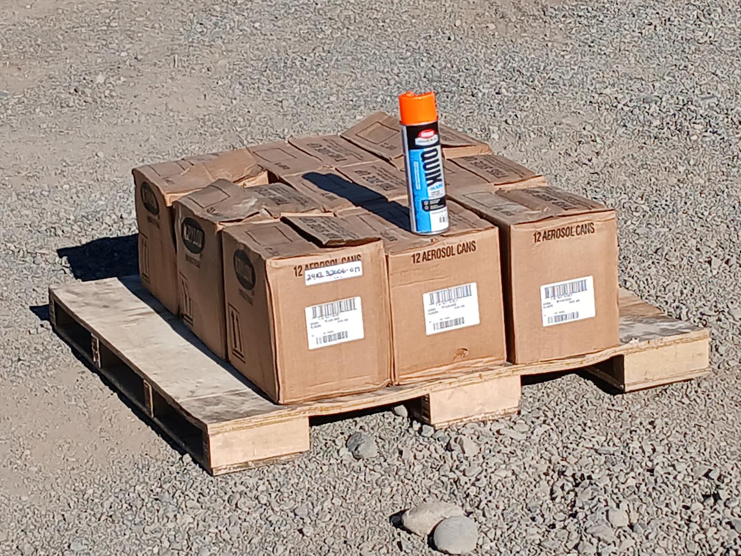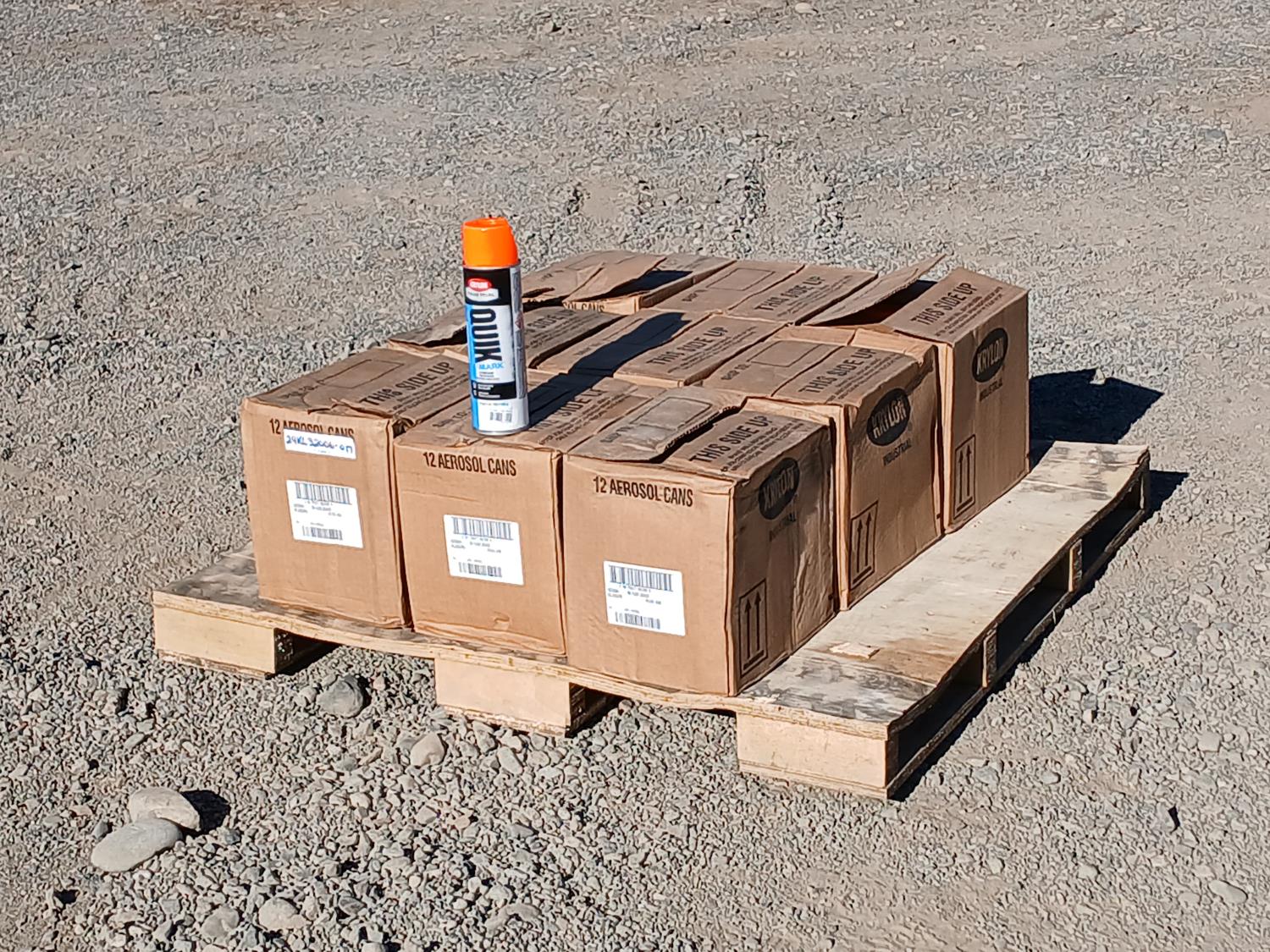 (9) cases Quick Mark fluorescent orange inverted marking paint. (12- 17 oz cans per case)