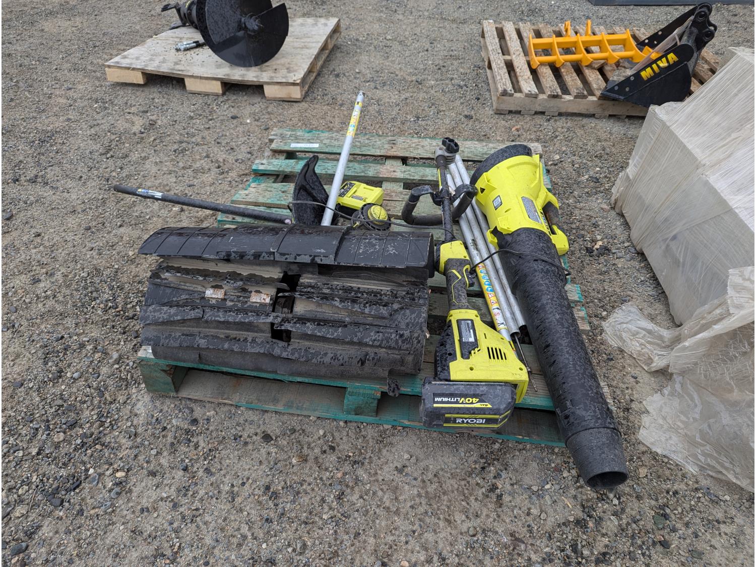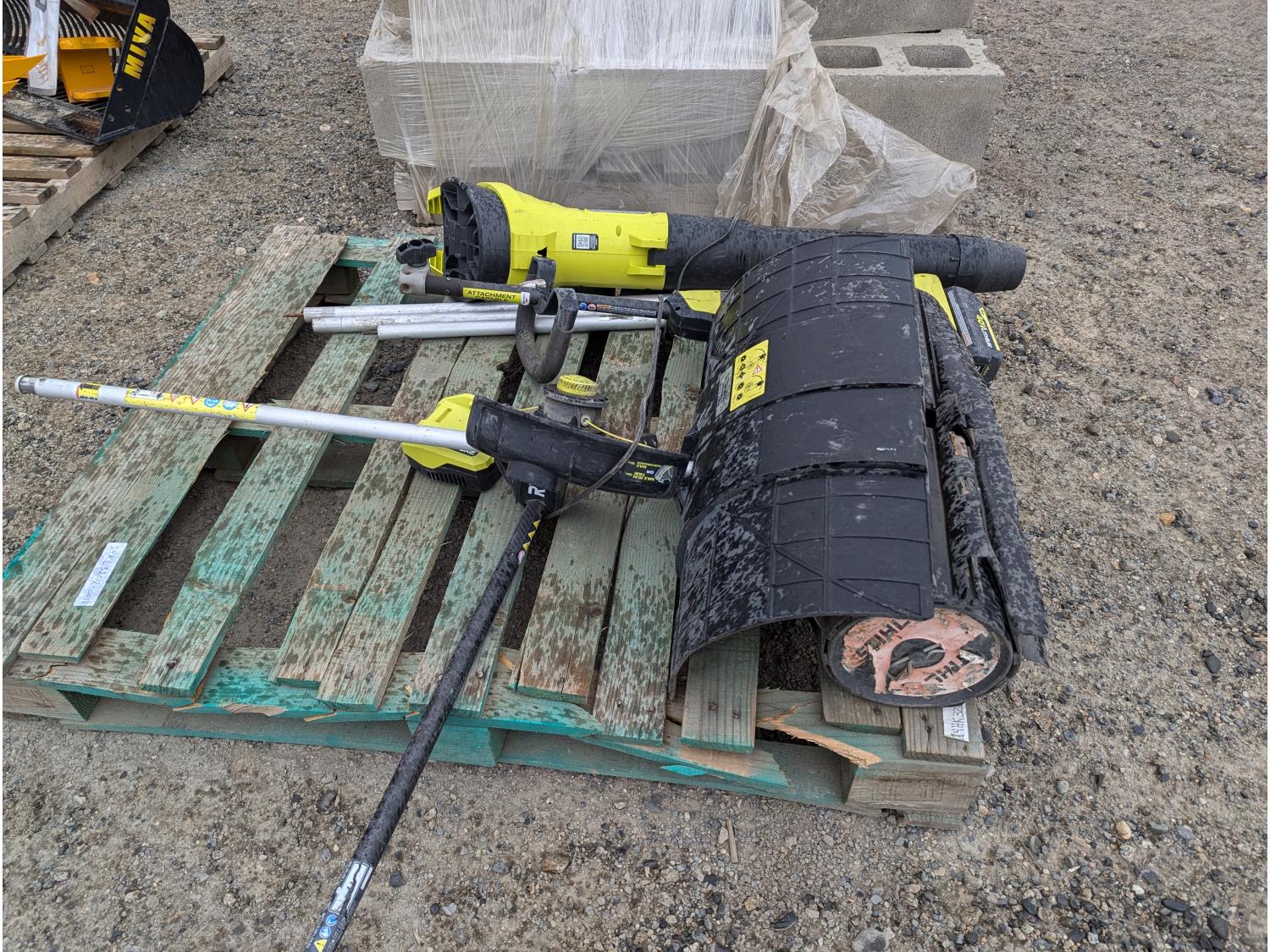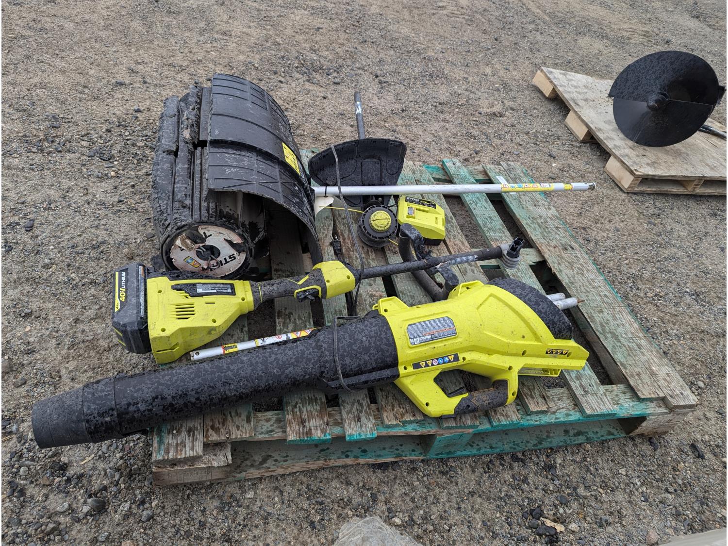 1603 Ryobi Cordless Trimmer, Leaf Blower, 40V Battery, Charger, Stihl Broom