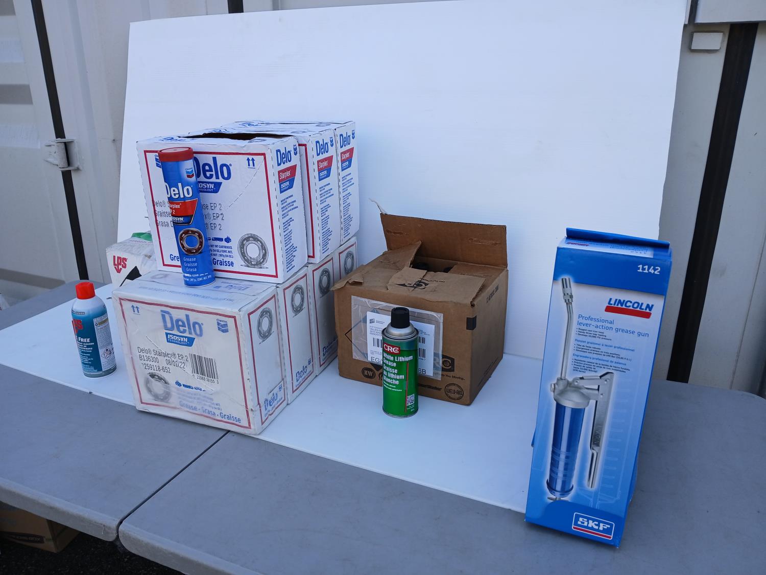 (3) Lincoln lever action grease guns, (70) tubes Delco starplex EP2 Iosyn technology grease, (12) cans Platinum grade LPS CFC free Electro contact cleaner, (12) cans CRC White Lithium grease.