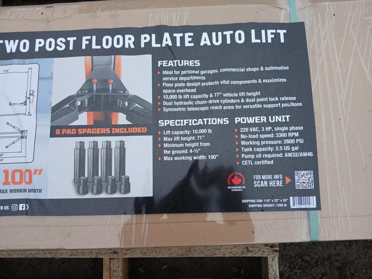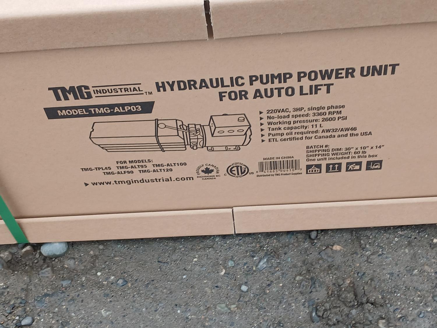 symmetric arms, 77 inch lift height, dual-point lock release Pump is ETL certified 220 Vac 3 HP single phase. working pressure of 2600 PSI