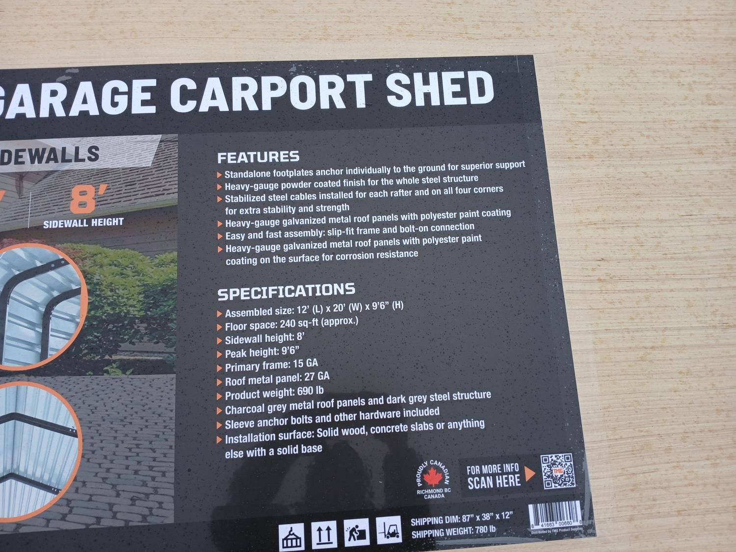 1968 TMG Industrial TMG-MSC1220 12 Ft X 20 Ft Metal Garage Carport Shed (Unused)