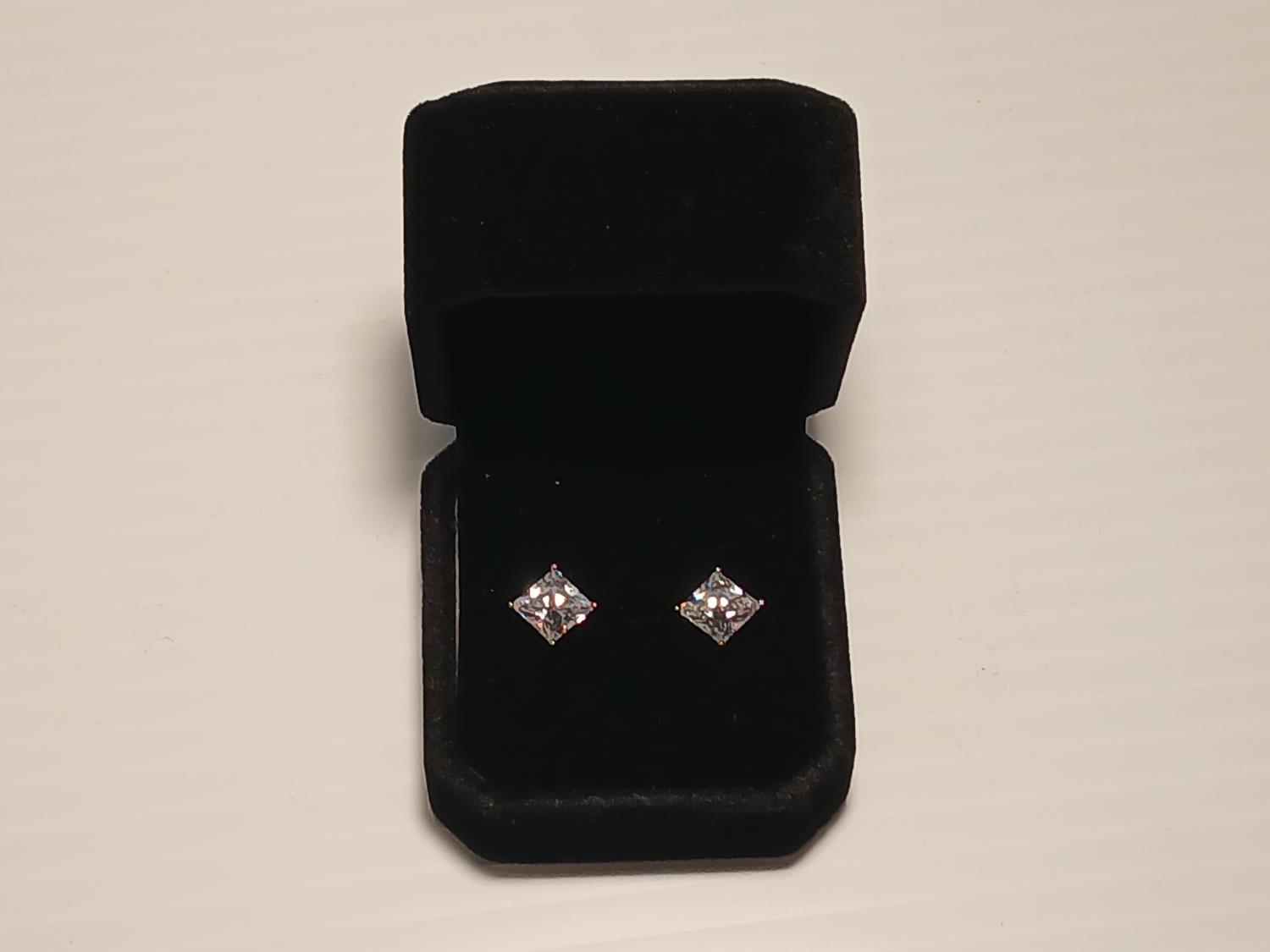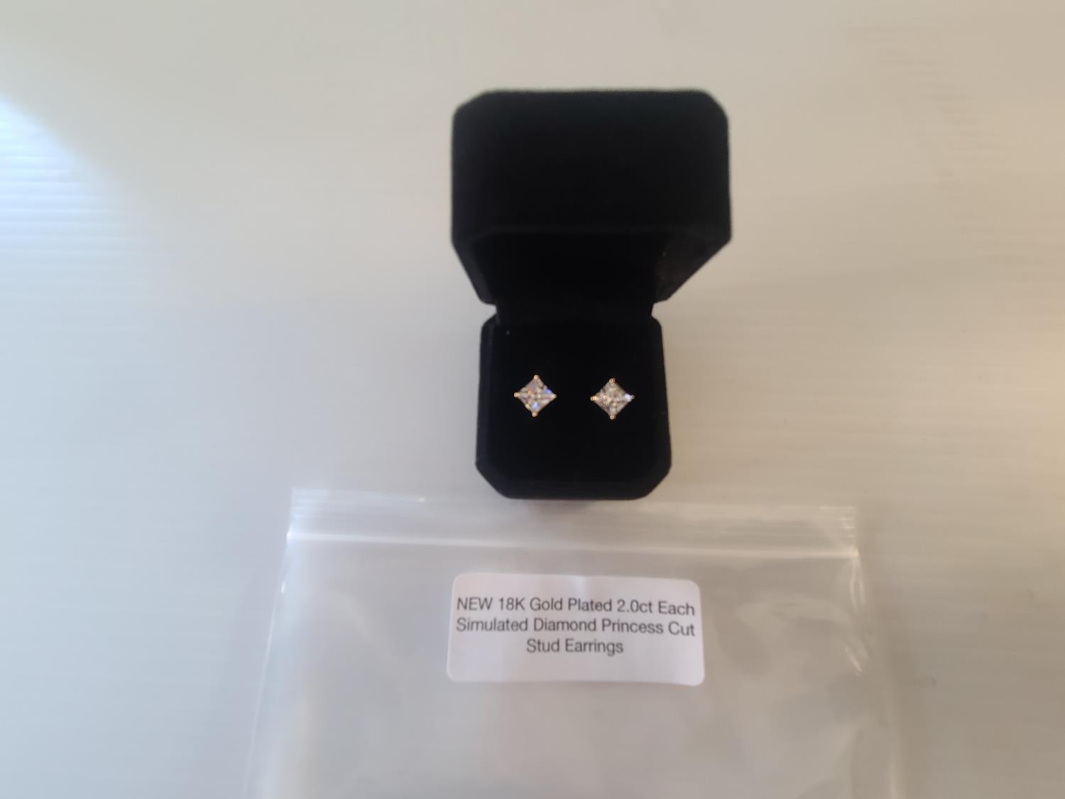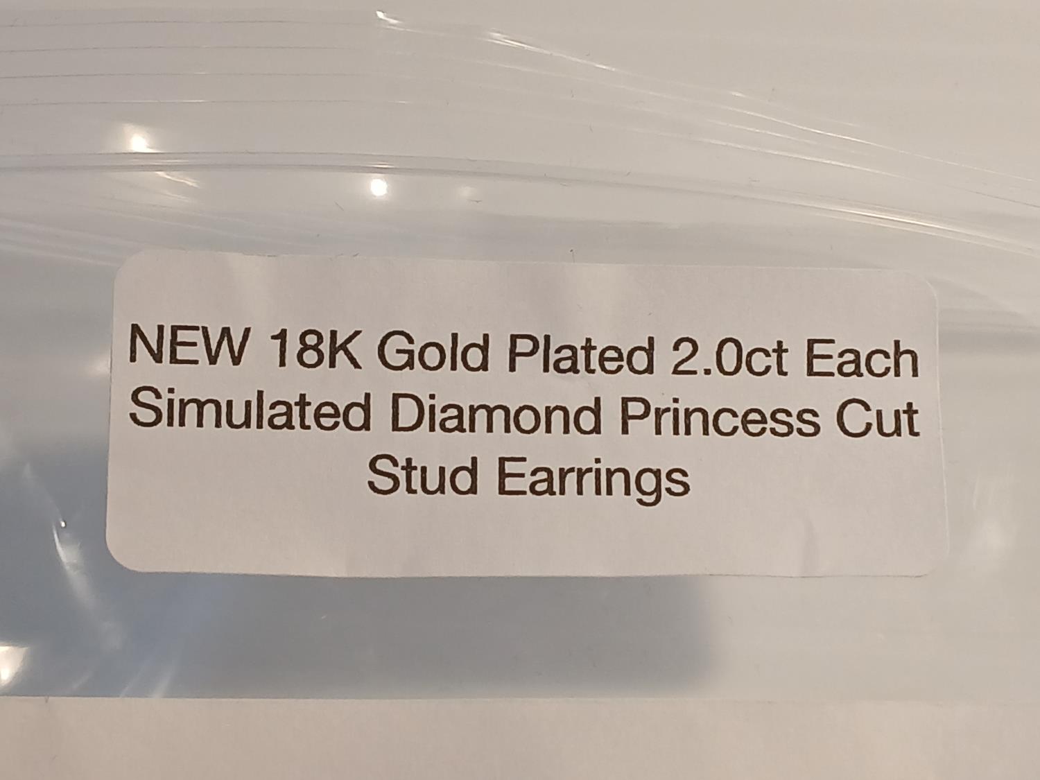 1895 Carsation Designs 18K Gold Plated 2.0ct Each Simulated Diamond Princess Cut Stud Earrings (Unused)