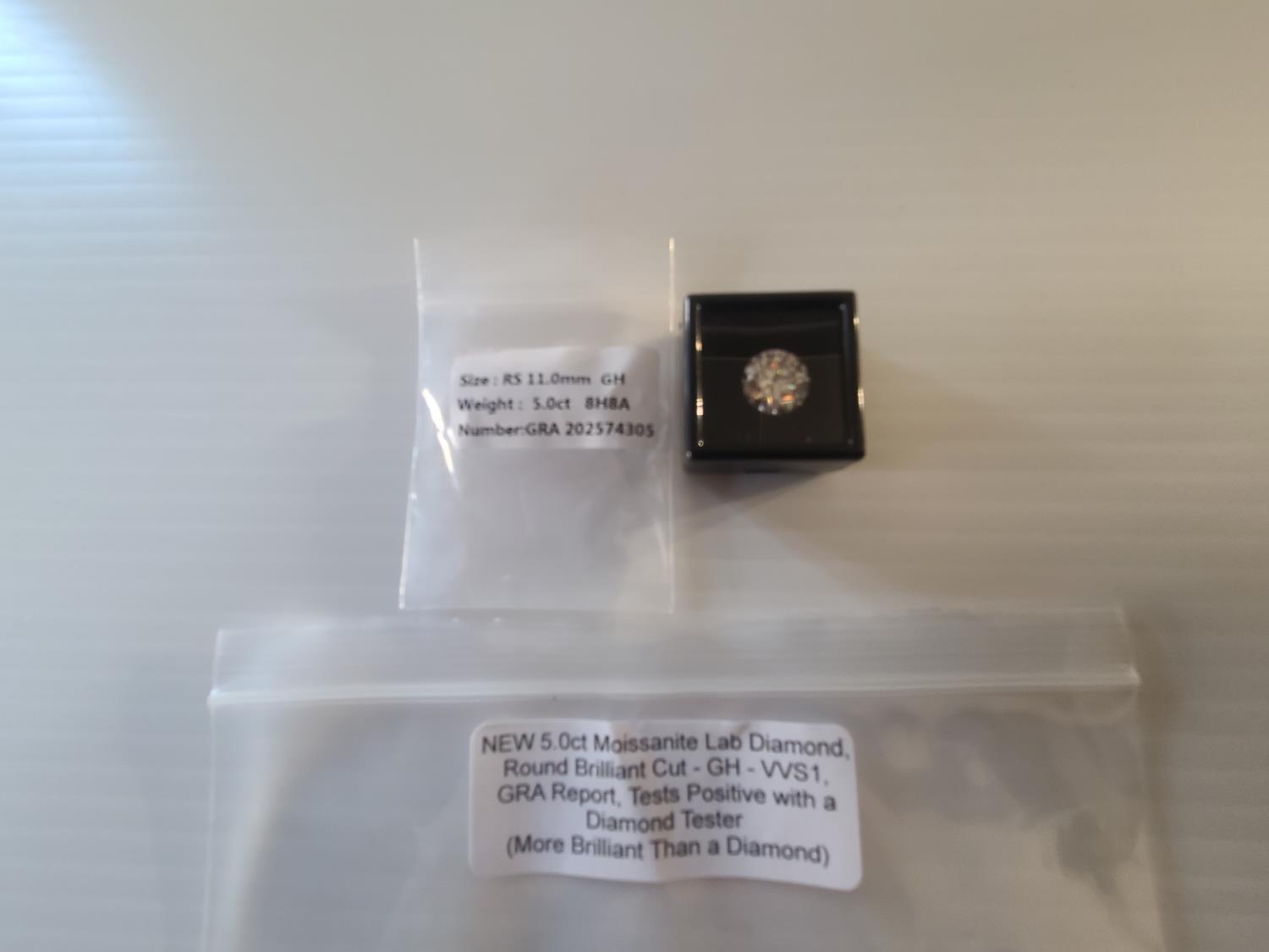 1899 Carsation Designs 5.0Ct Moissanite Lab Diamond, Round Brilliant Cut (Unused)