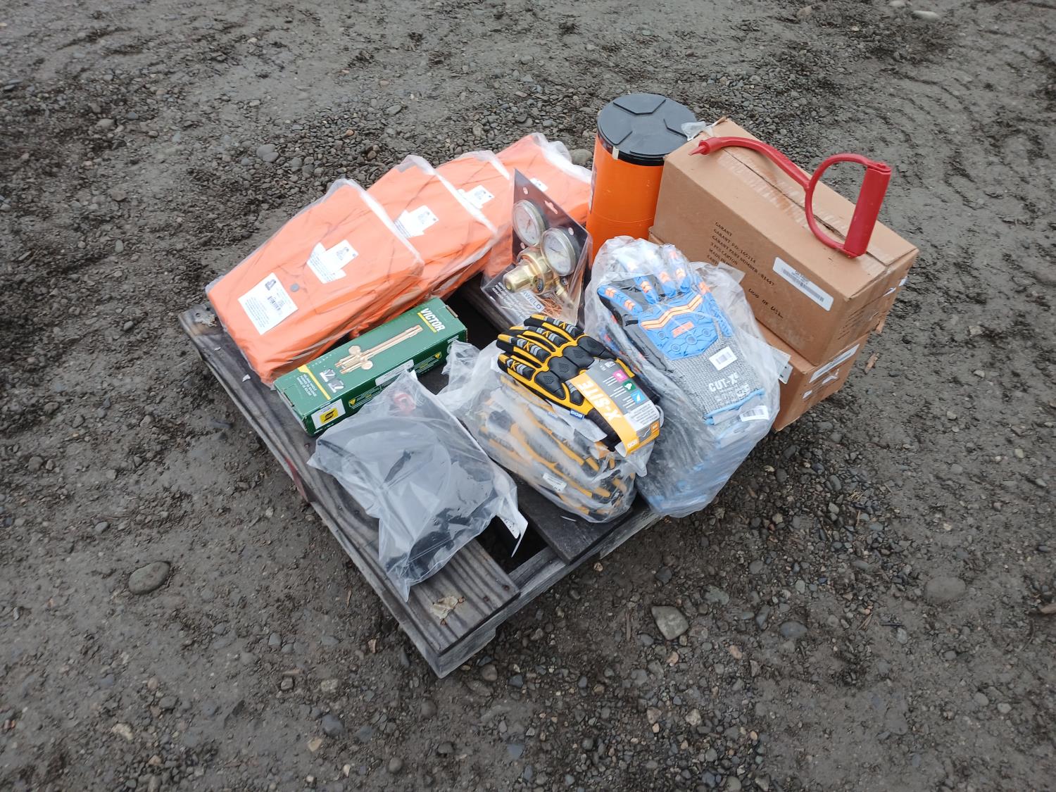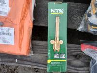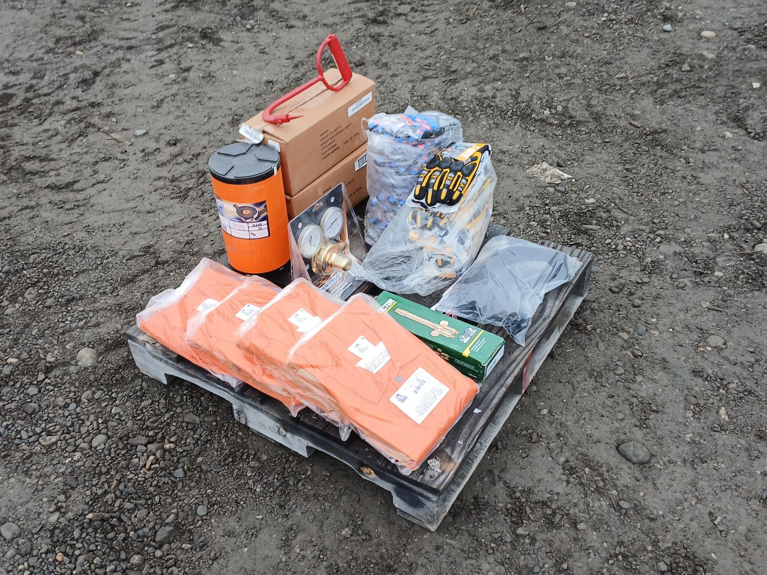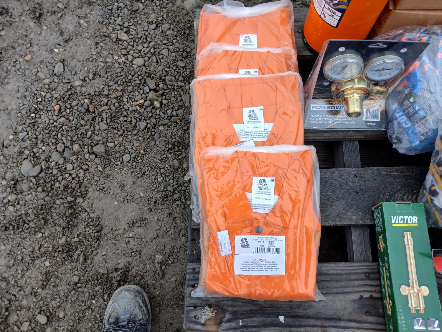(1) welding handle (WH315FCT), (12) XL BDG "Cut-X" lined nitrile coated HPPE gloves, (6) medium BDG "X-site" synthetic leather cut and impact resistant performance gloves, (1) Container (20) Walter 6 inch x 1/4 inch x 5/8 inch -11 spin on depressed grinding wheels No. 08-B 630, (1) PowerWeld medium duty propane regulator, (2) medium "Steiner" Weldlite Plus jackets with leather sleeves, (1) medium "Steiner" Weldlite jacket, (1) Dynamic visor kit, (9) pulp hooks