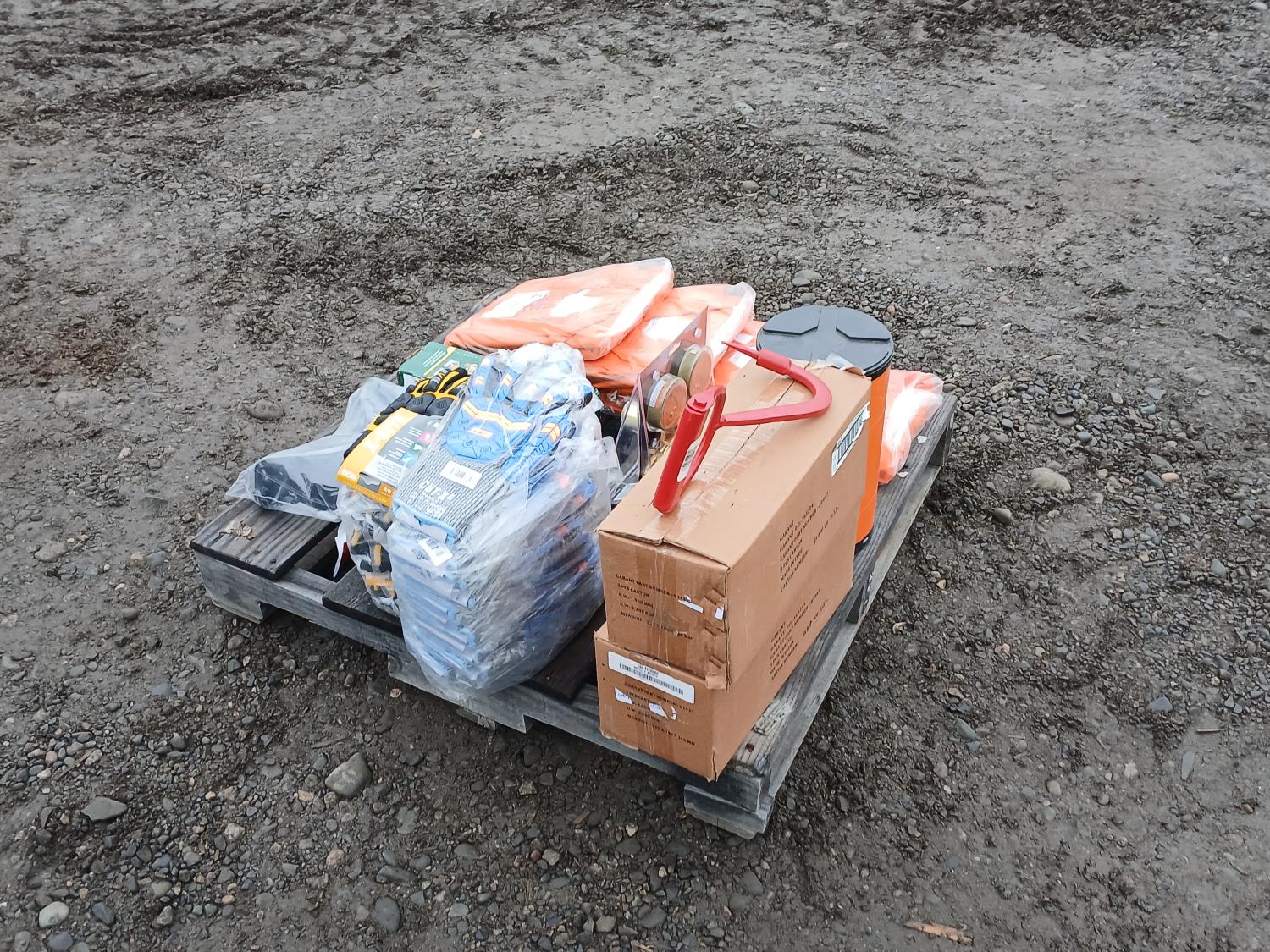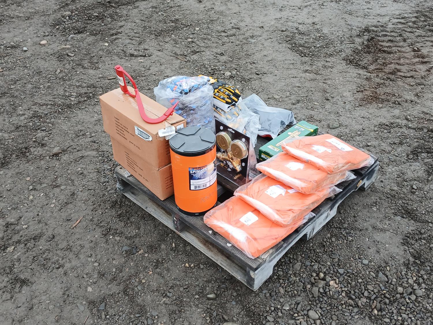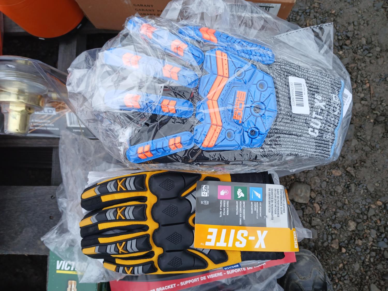 (1) welding handle (WH315FCT), (12) XL BDG "Cut-X" lined nitrile coated HPPE gloves, (6) medium BDG "X-site" synthetic leather cut and impact resistant performance gloves, (1) Container (20) Walter 6 inch x 1/4 inch x 5/8 inch -11 spin on depressed grinding wheels No. 08-B 630, (1) PowerWeld medium duty propane regulator, (2) medium "Steiner" Weldlite Plus jackets with leather sleeves, (1) medium "Steiner" Weldlite jacket, (1) Dynamic visor kit, (9) pulp hooks